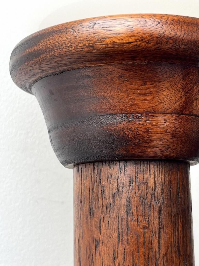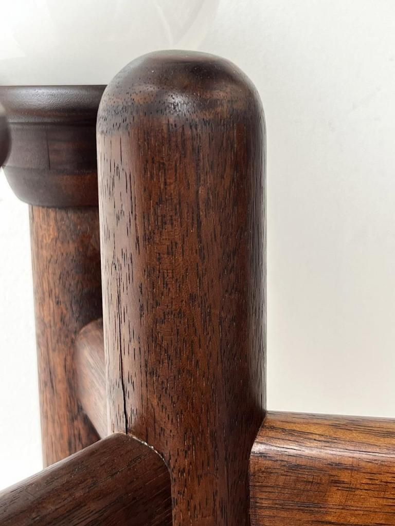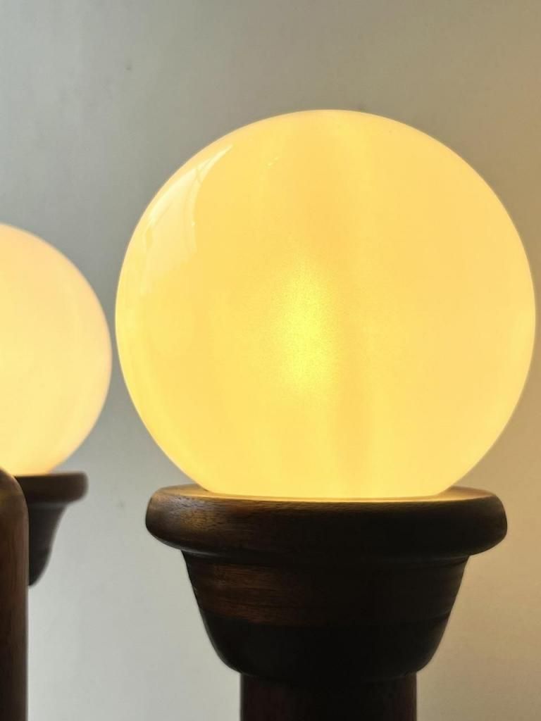 ソリッドパイン材を使用し、深みのあるブラウンにステイン仕上げを施すことで、ウォルナットのような高級感を演出しています。乳白ガラスのシェードからは温かみのある光が拡散し、彫刻のような構造を浮かび上がらせます。単なる照明器具ではなく、オブジェとしても空間の主役になりうる存在感を放ちます。