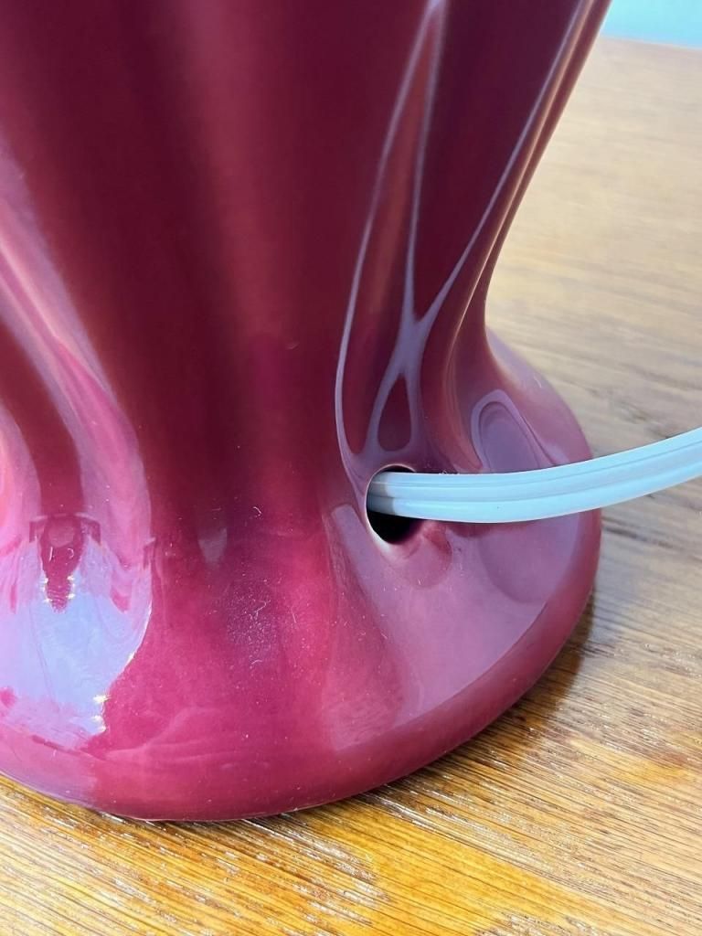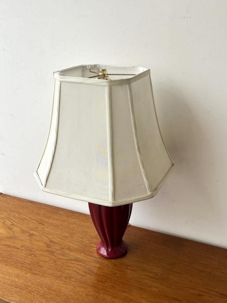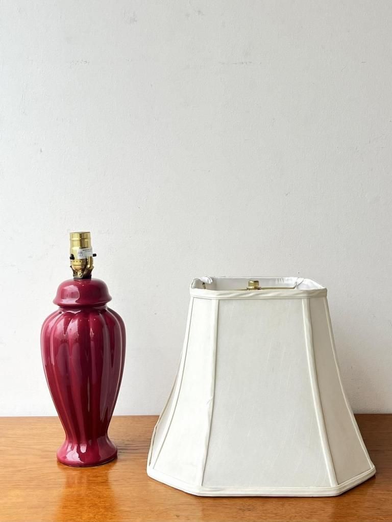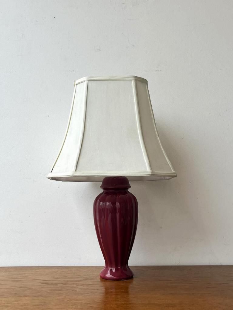 深みのあるボルドーカラーのセラミックベースに、柔らかな生成りのファブリックシェードを合わせた一台。