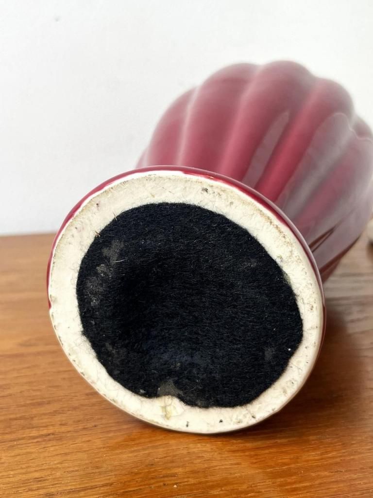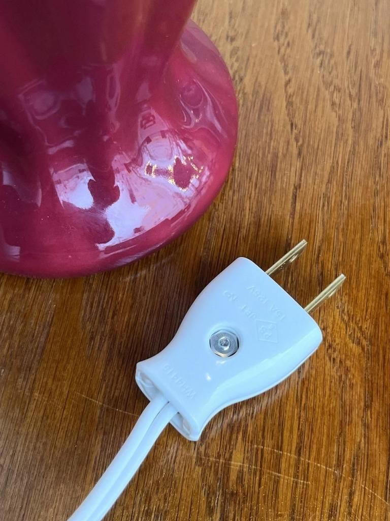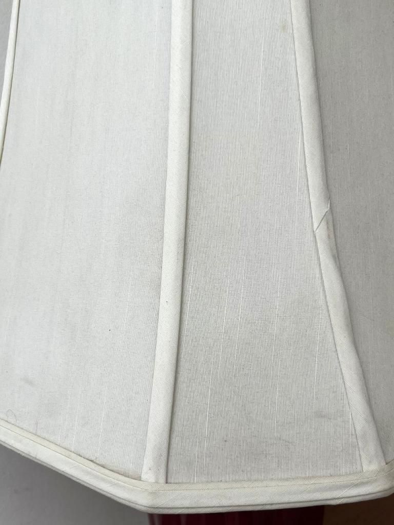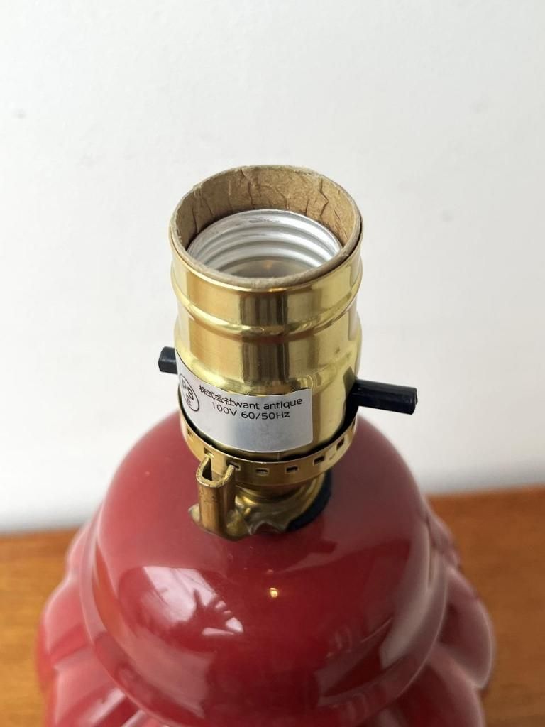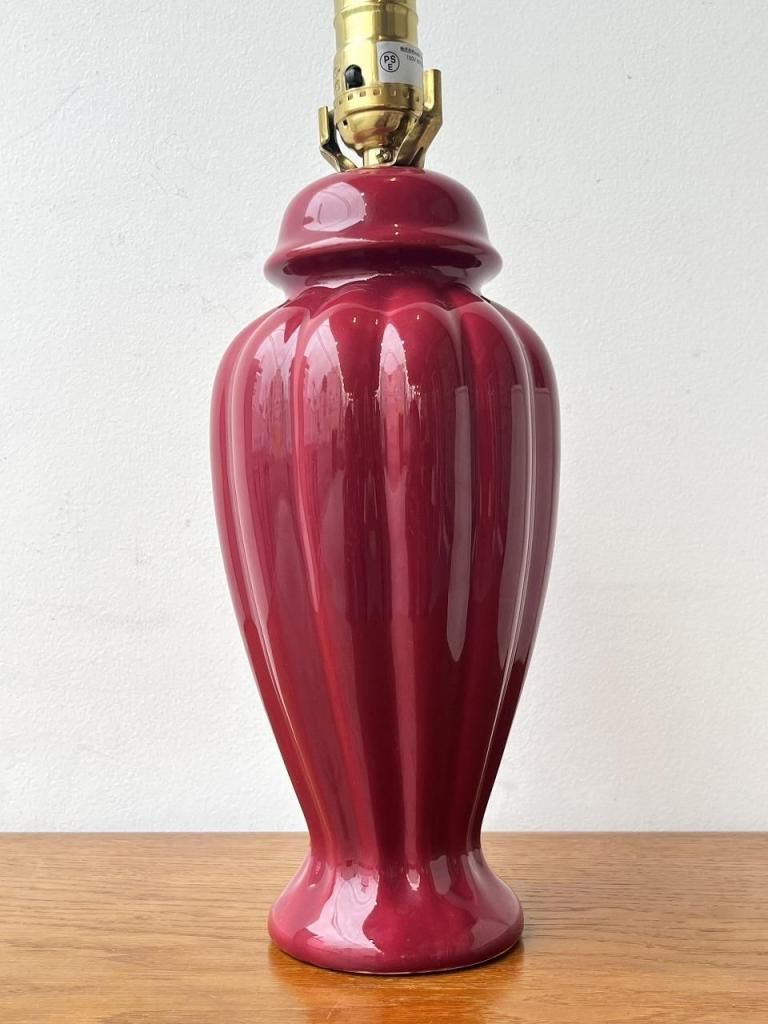 深みのあるボルドーカラーのセラミックベースに、柔らかな生成りのファブリックシェードを合わせた一台。