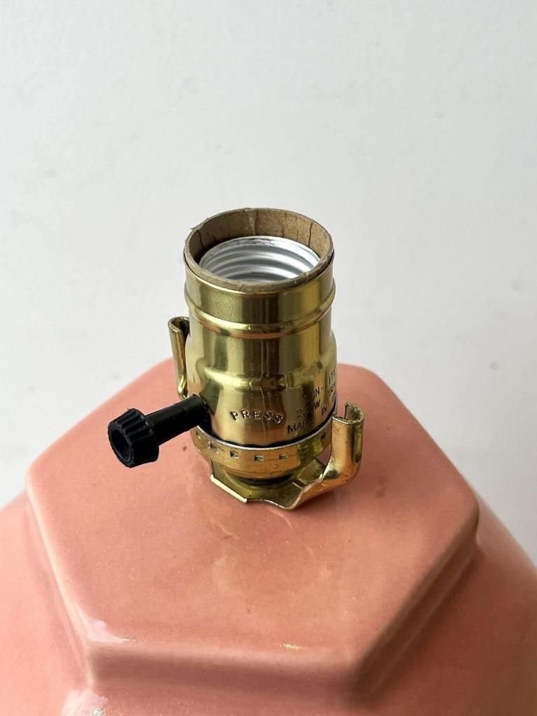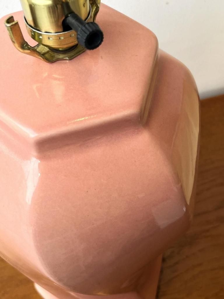 光沢のある釉薬が滑らかに反射し、点灯時には淡い光がベース全体を包み込むように広がります。甘さを抑えたくすみピンクの色味は、ナチュラルウッドやブラス素材とも相性が良く、ミッドセンチュリーやモダンインテリアの差し色としてもおすすめです。