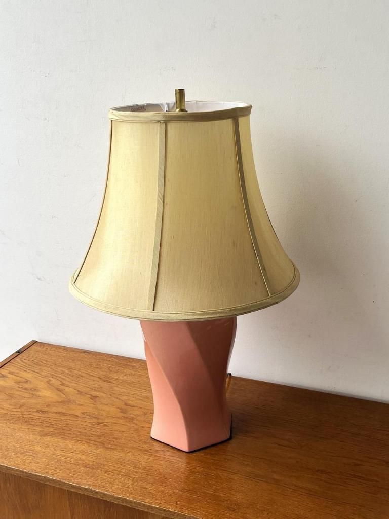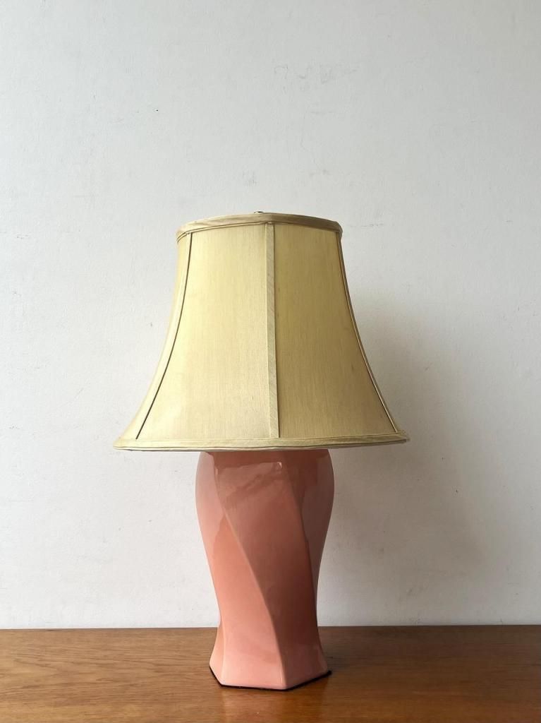 淡いピンクのセラミックベースに、生成りのファブリックシェードを組み合わせた一台。