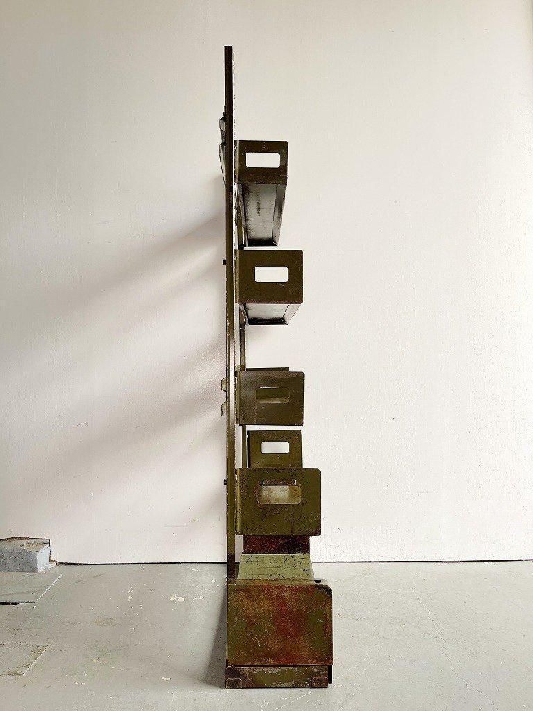 科学図書館や大学の研究室で、重量のある学術書、論文バインダー、図面を整理するための棚として使用されていたと思われ、奥行きの浅い段と深い段を組み合わせることで、大型書籍と小型資料を分けて収納できる構造になっています。