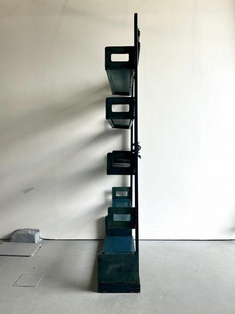 科学図書館や大学の研究室で、重量のある学術書、論文バインダー、図面を整理するための棚として使用されていたと思われ、奥行きの浅い段と深い段を組み合わせることで、大型書籍と小型資料を分けて収納できる構造になっています。