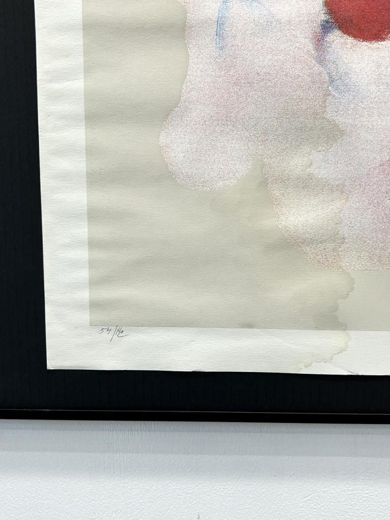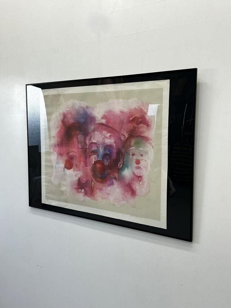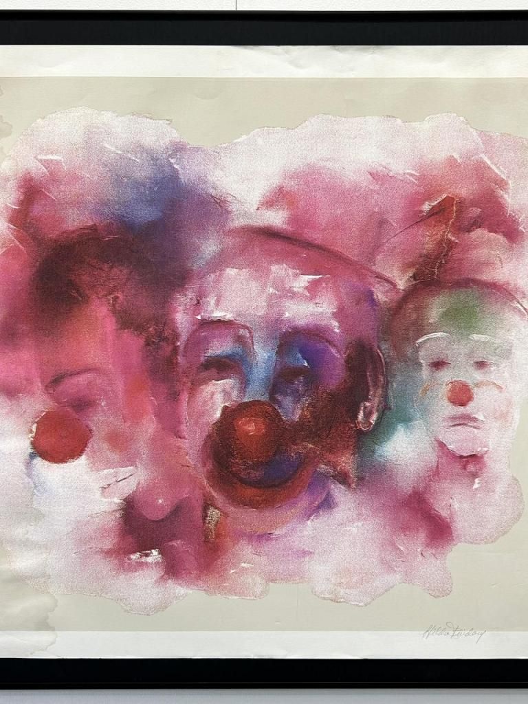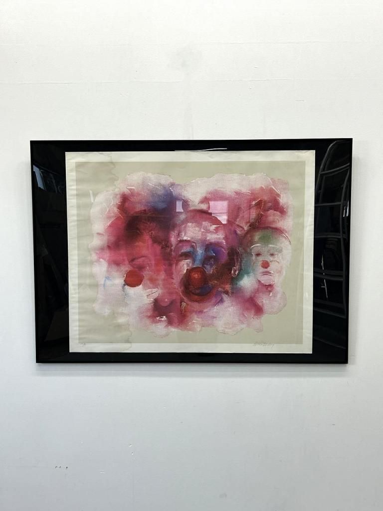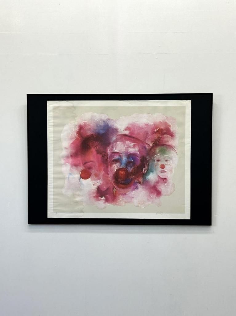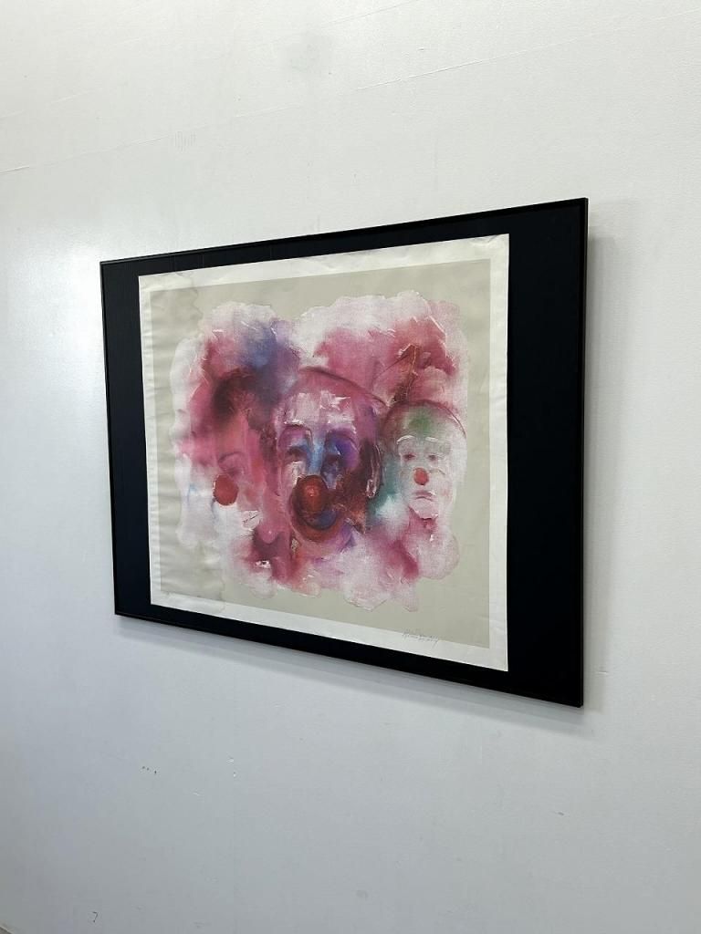 作品中央には赤い鼻を持つクラウン(ピエロ)が三つの顔で構成されており、正面・左・右と感情の異なる表情が淡く重ねられています。
