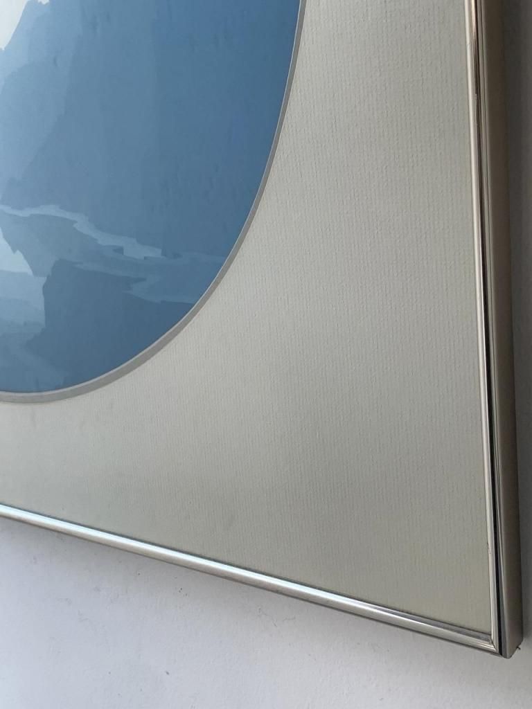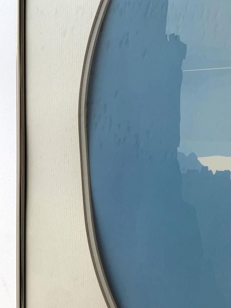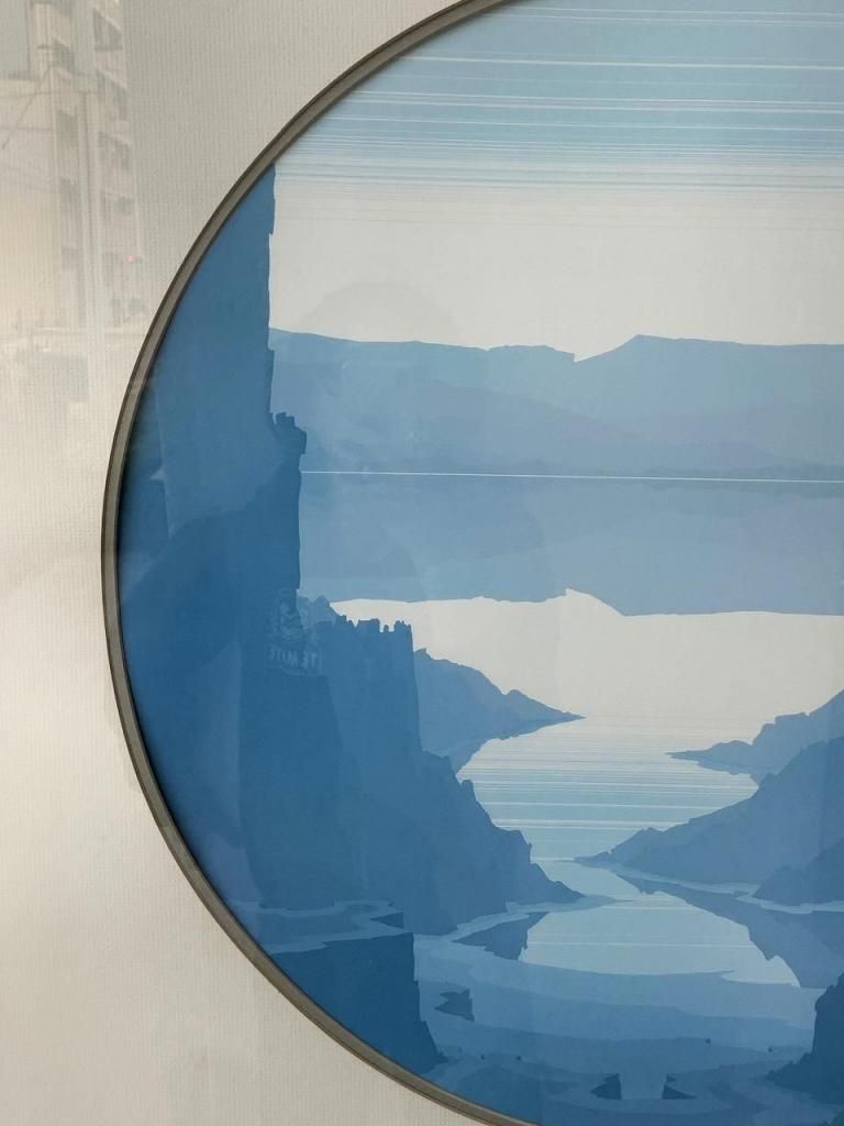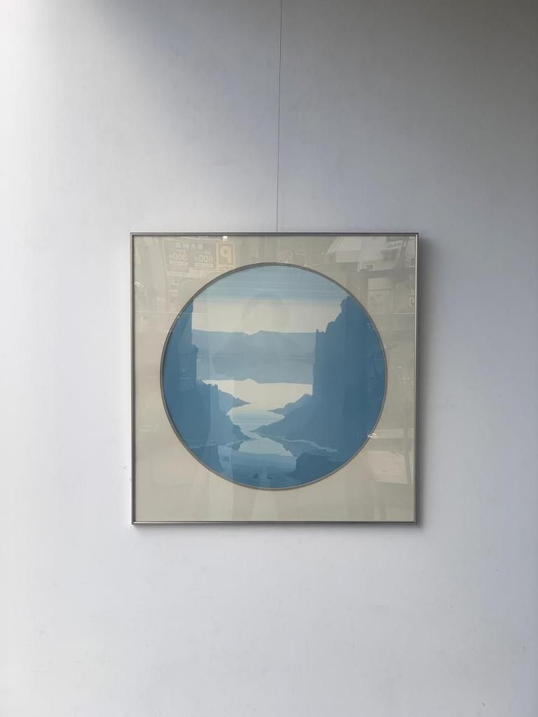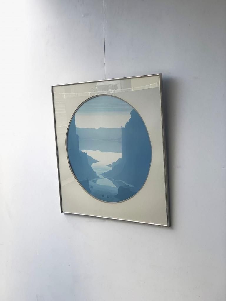 峡谷と水流の風景を複数の青をレイヤーのように重ねた構成を抽象化されて描かれています。遠景に向かって色が淡くなることで、奥行きと空気遠近が生まれ、地形が霞んでいくような印象を与えています。