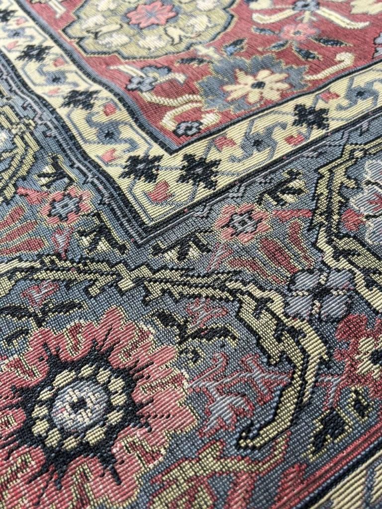 深い色調と密な柄構成により存在感があり、やや褪せた赤のトーンが空間に温かみを与えます。