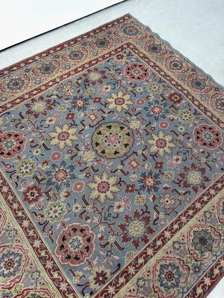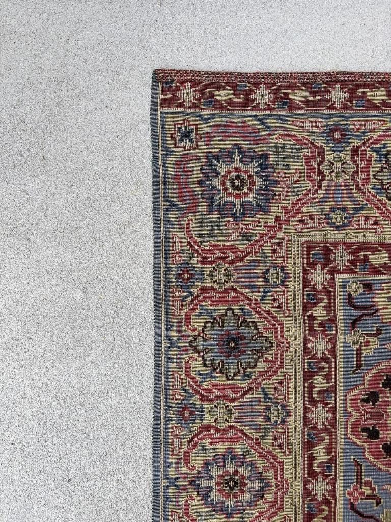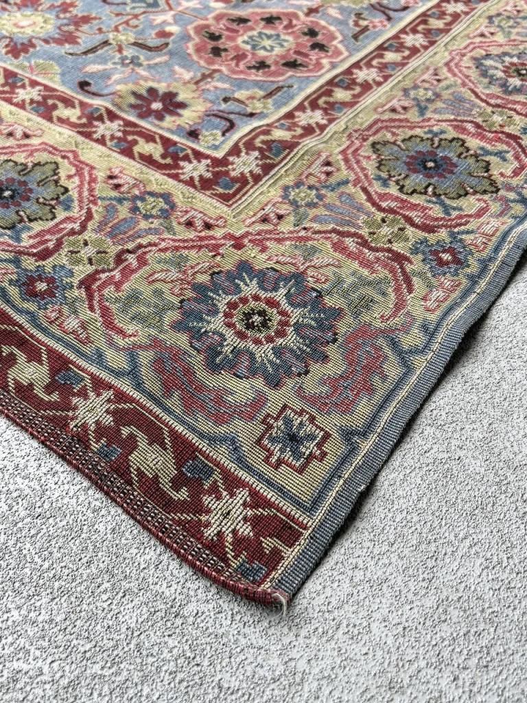ラグ中央に円形のメダリオン(花形モチーフ)が配置され、その周囲を放射状に広がる花文様が囲む伝統的でシンメトリックなデザインの1枚。