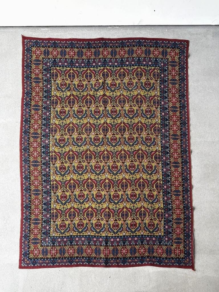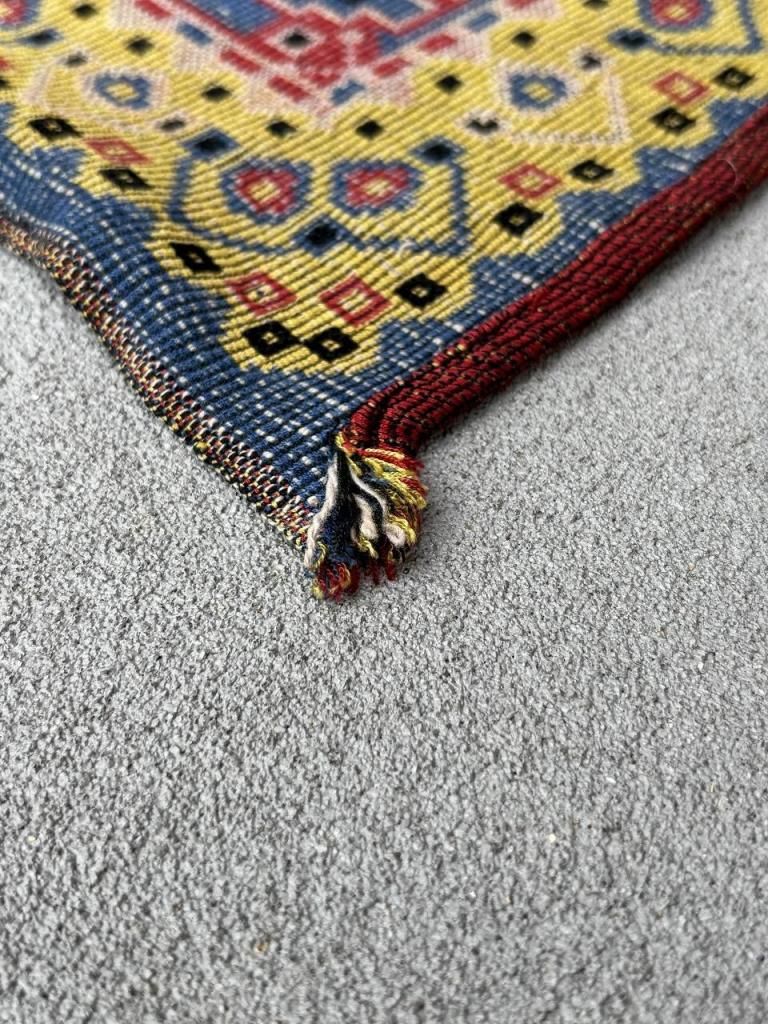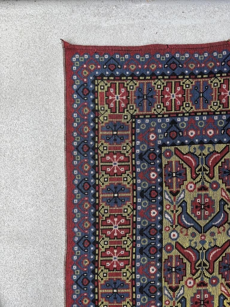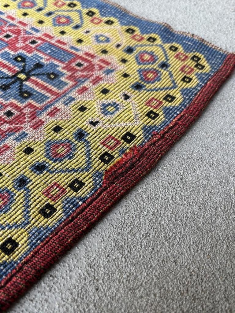 中央部分は繰り返しのパターンで構成されており、細部には花を思わせるモチーフが多く見られ、伝統的なペルシャやカフカス地方のデザインを彷彿とさせます。