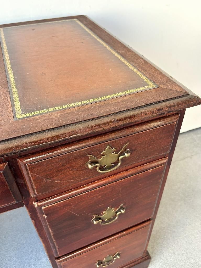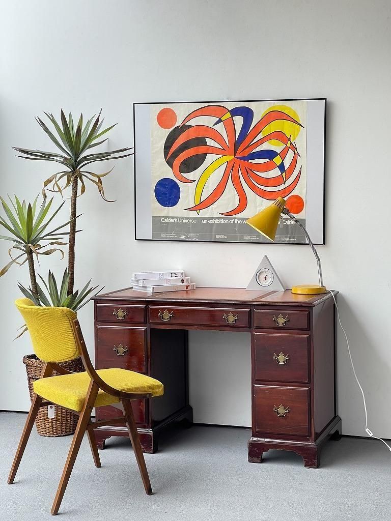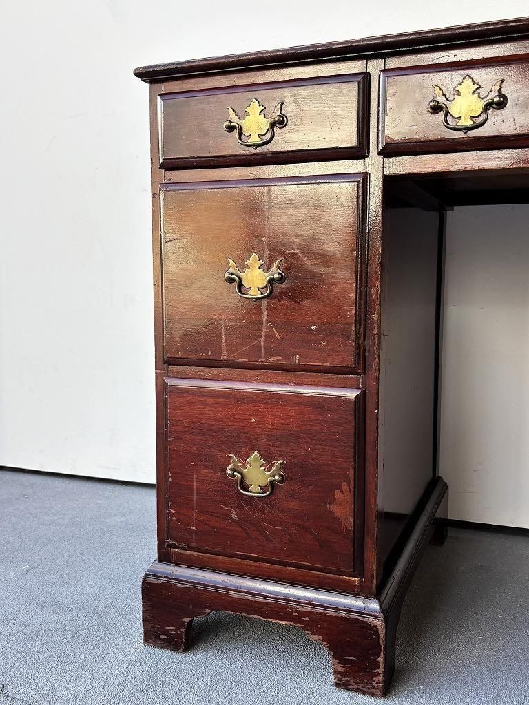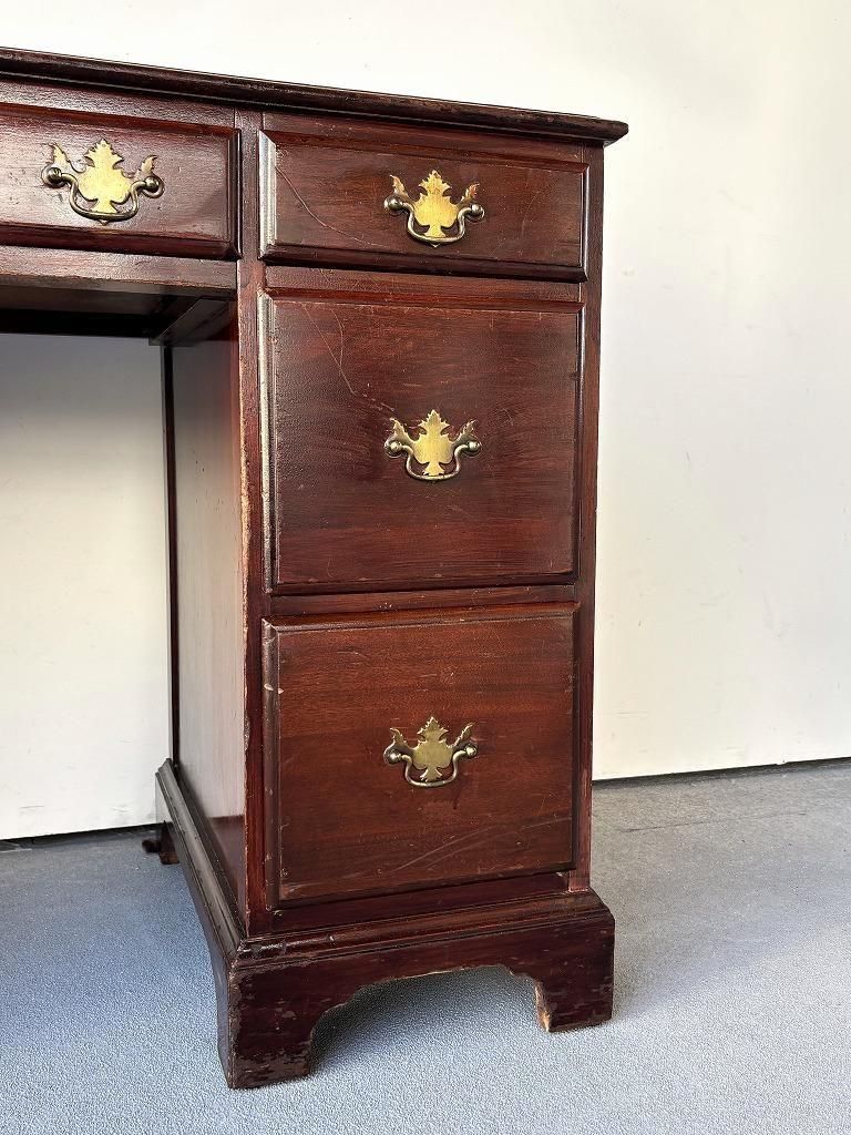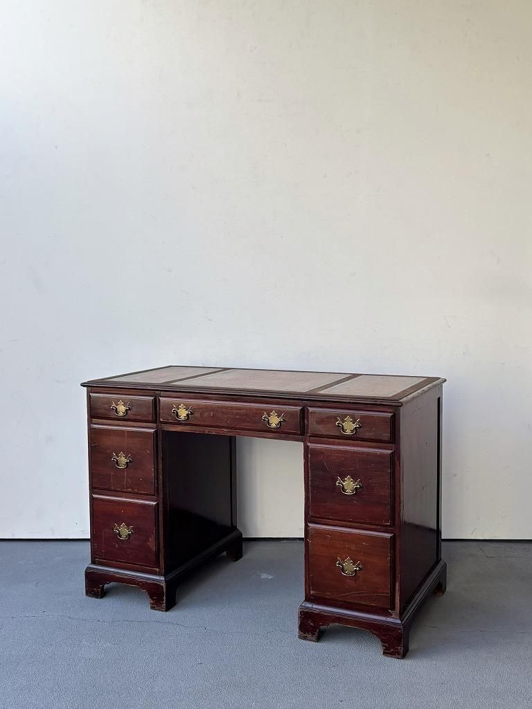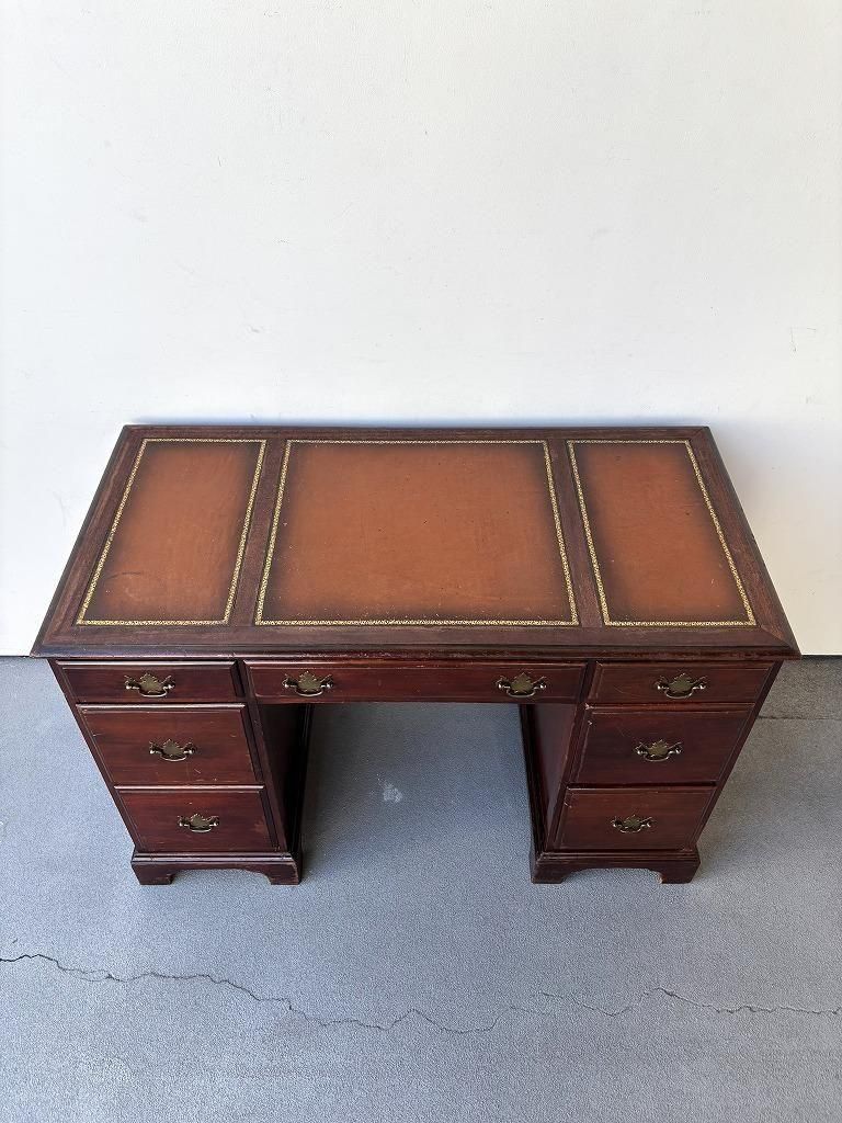 真鍮ハンドルと深い木色の組み合わせが格式を感じさせ、7杯の引き出しで収納力も申し分無く、デスク下の空間もゆったりしているので、現代のPCデスクとしても十分に使えます。