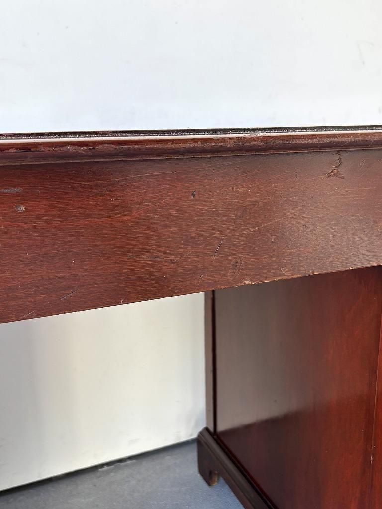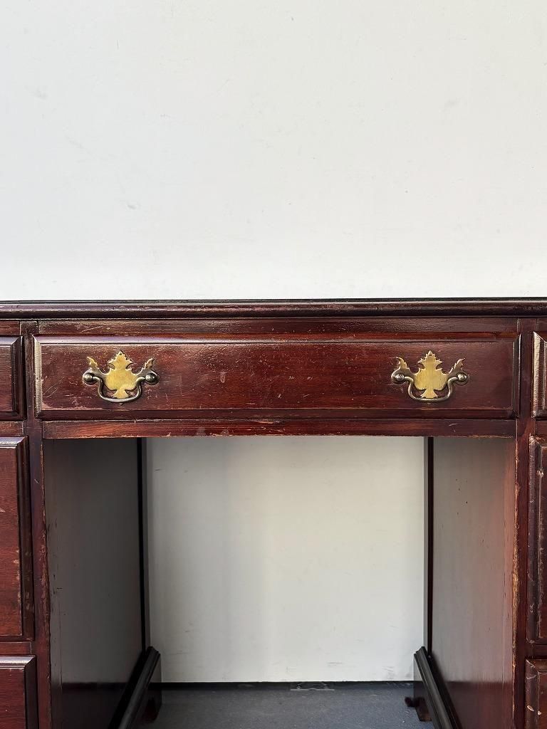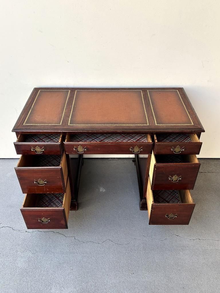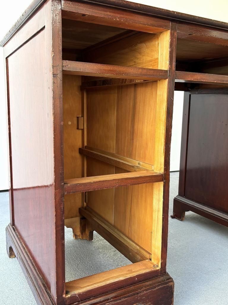両サイドに3段ずつの引き出しを備えた「ツインペデスタルデスク(両袖机)」構造で、木部の赤みを帯びたブラウンはマホガニー系の塗装仕上げとなっており、クラシカルで重厚感があります。