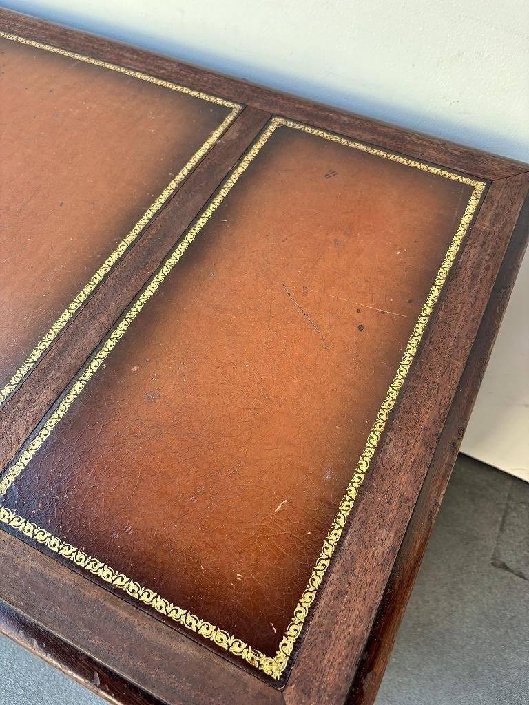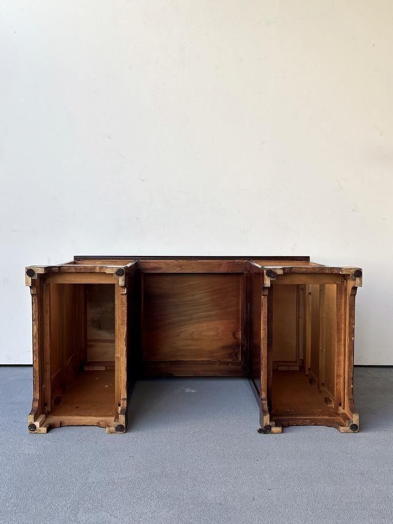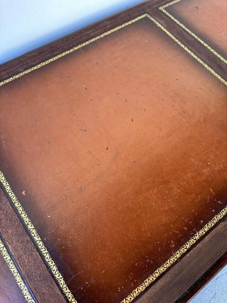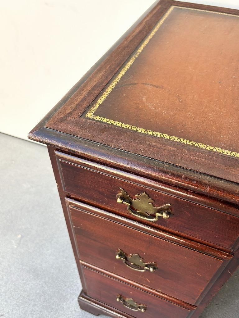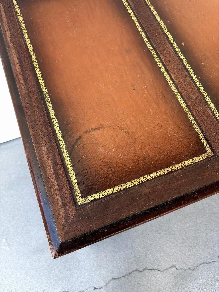 両サイドに3段ずつの引き出しを備えた「ツインペデスタルデスク(両袖机)」構造で、木部の赤みを帯びたブラウンはマホガニー系の塗装仕上げとなっており、クラシカルで重厚感があります。