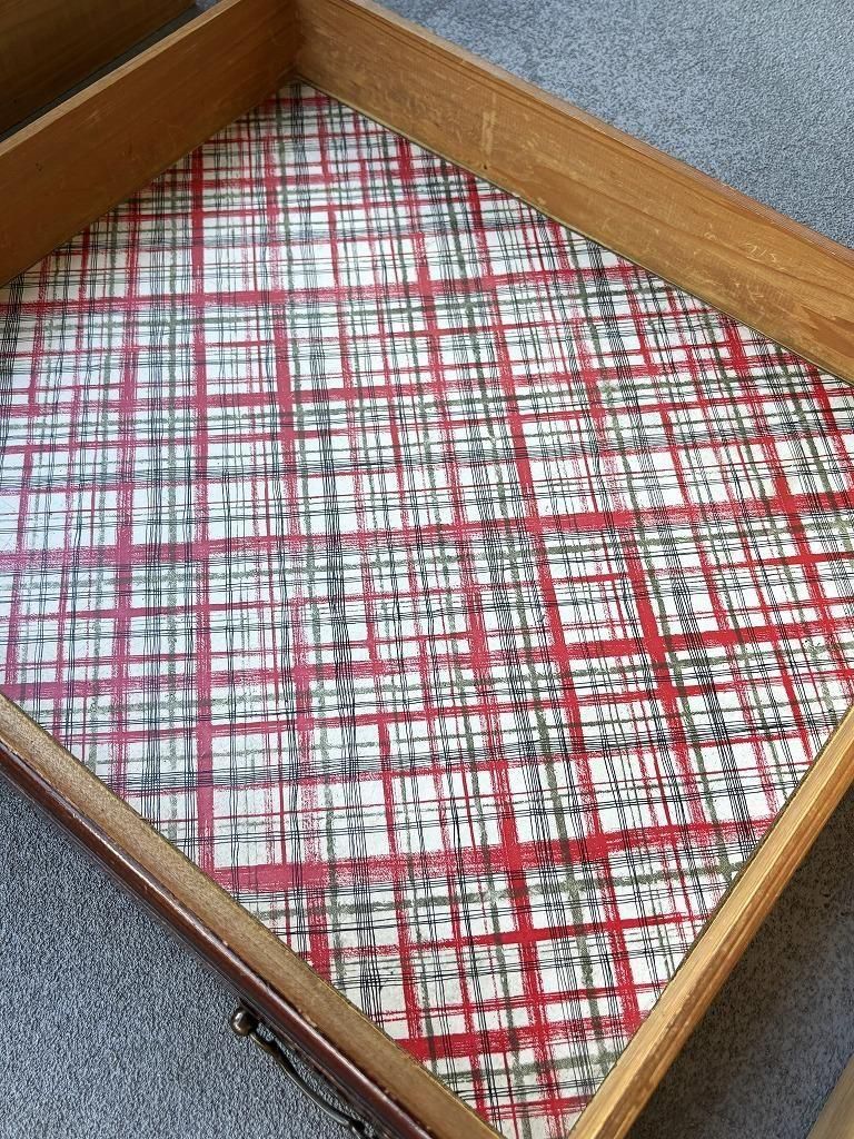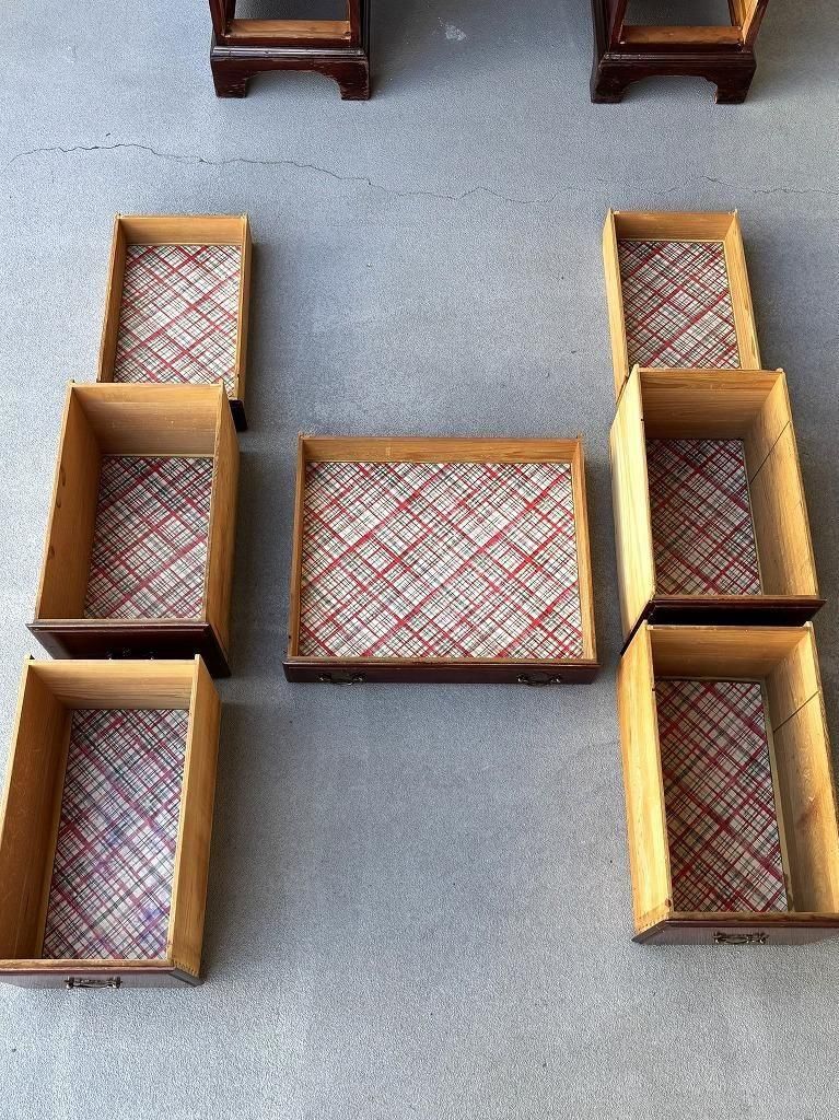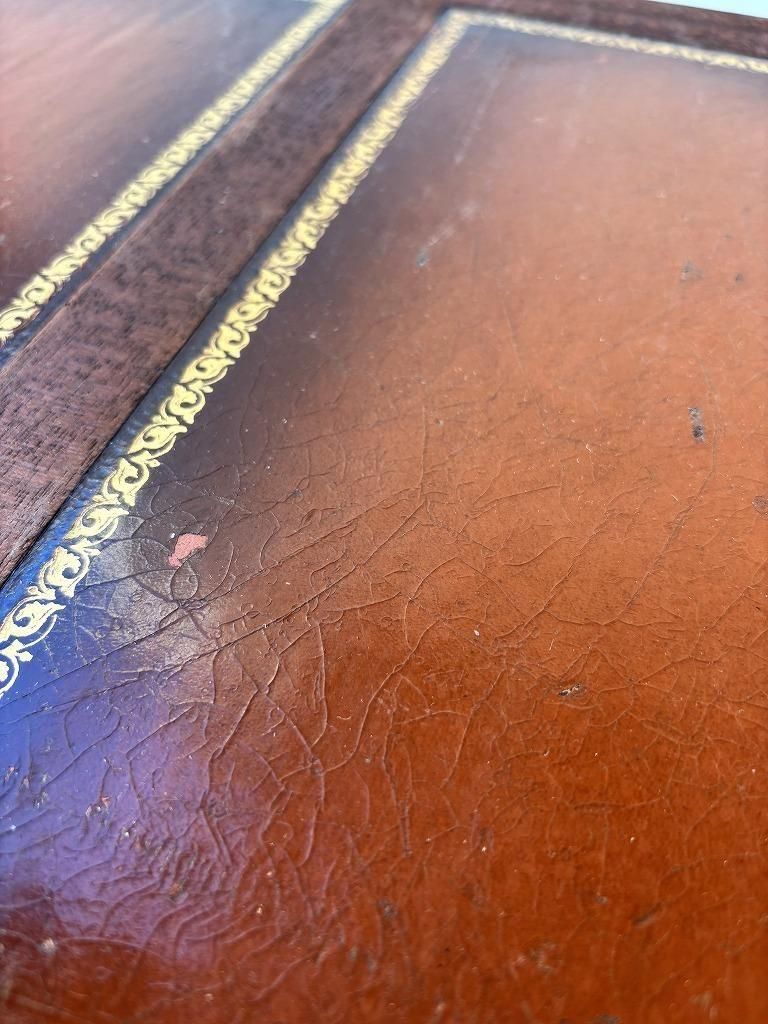 3面に金の箔押しによる装飾縁取りが施された天板で経年により細かいクラックが入り、元々のデザインのよう自然に馴染んでいます。