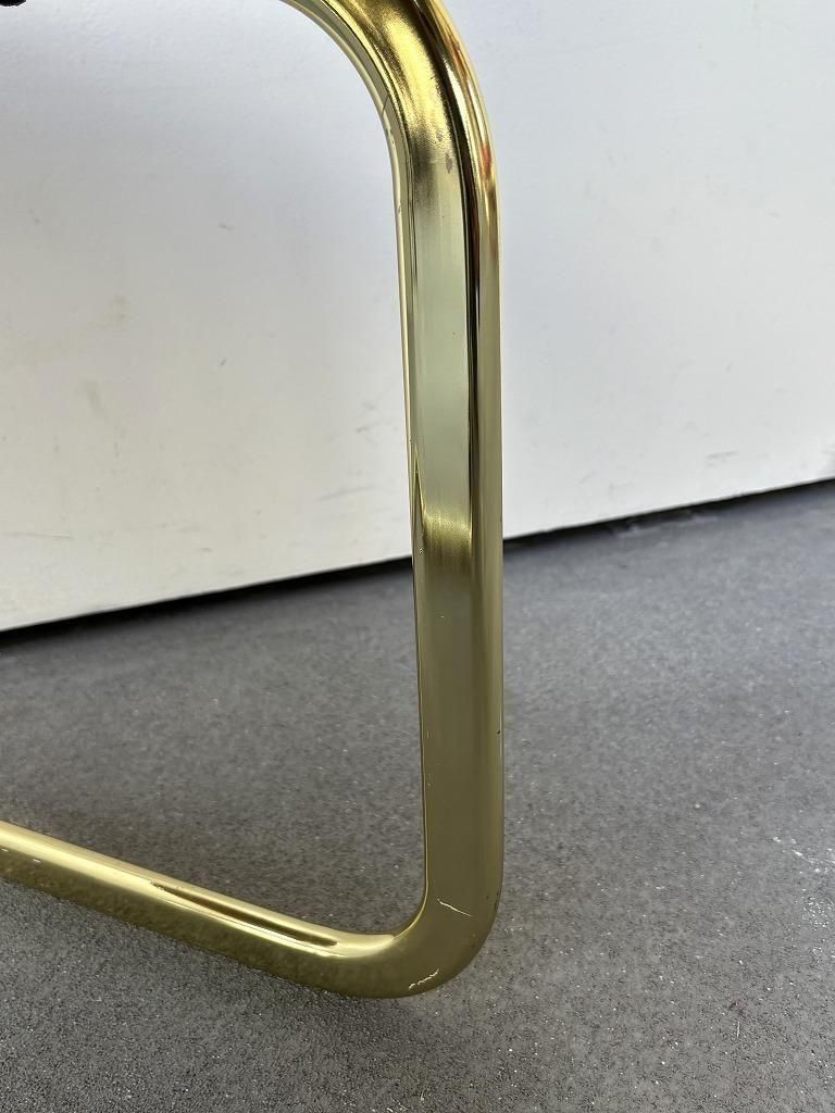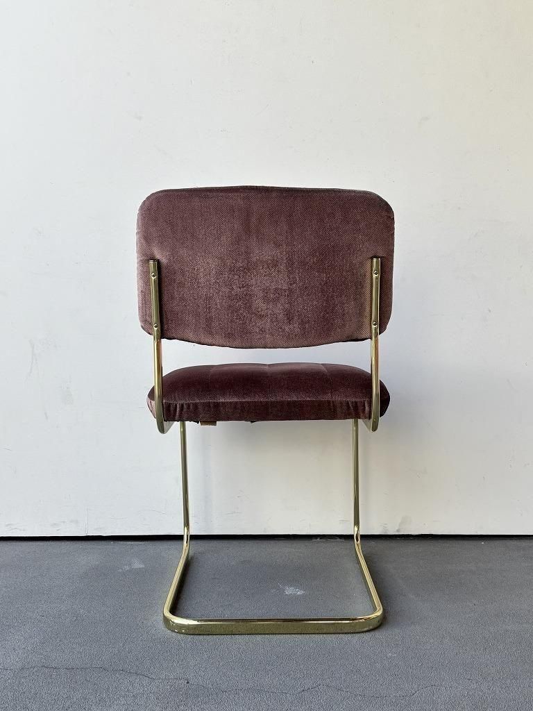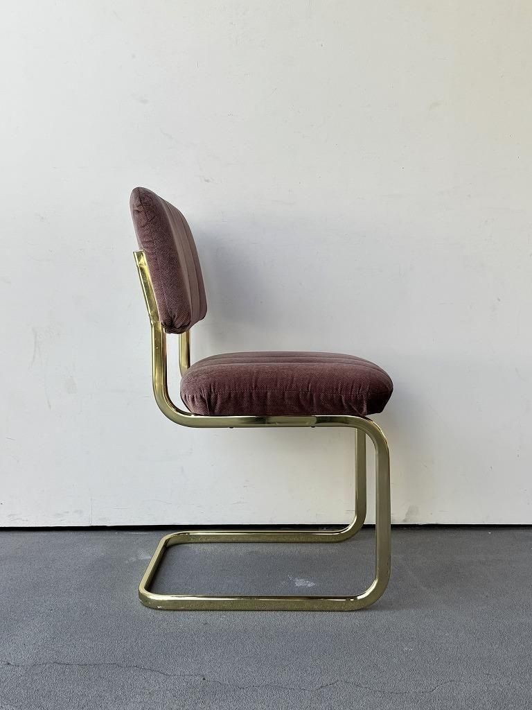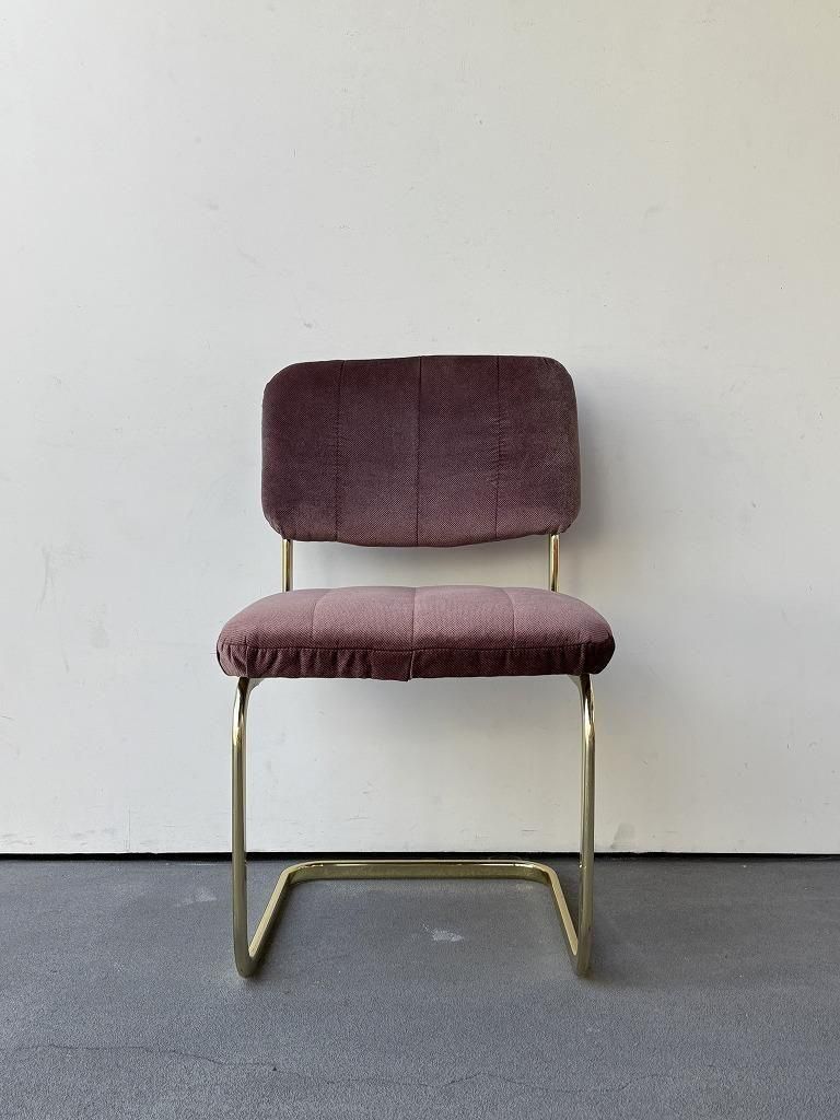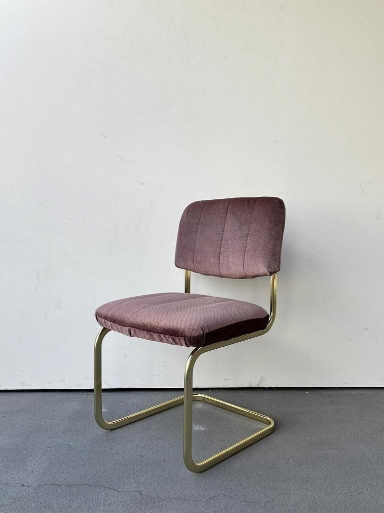 このチェアもフレームには艶やかなゴールドメッキスチールを採用し、背と座にはくすみのあるピンクのファブリックを使用しています。柔らかく光を反射するベルベット調の生地と、チューブ状に曲げられたスチールの組み合わせが、80年代以降のポストモダンの潮流を感じさせます。