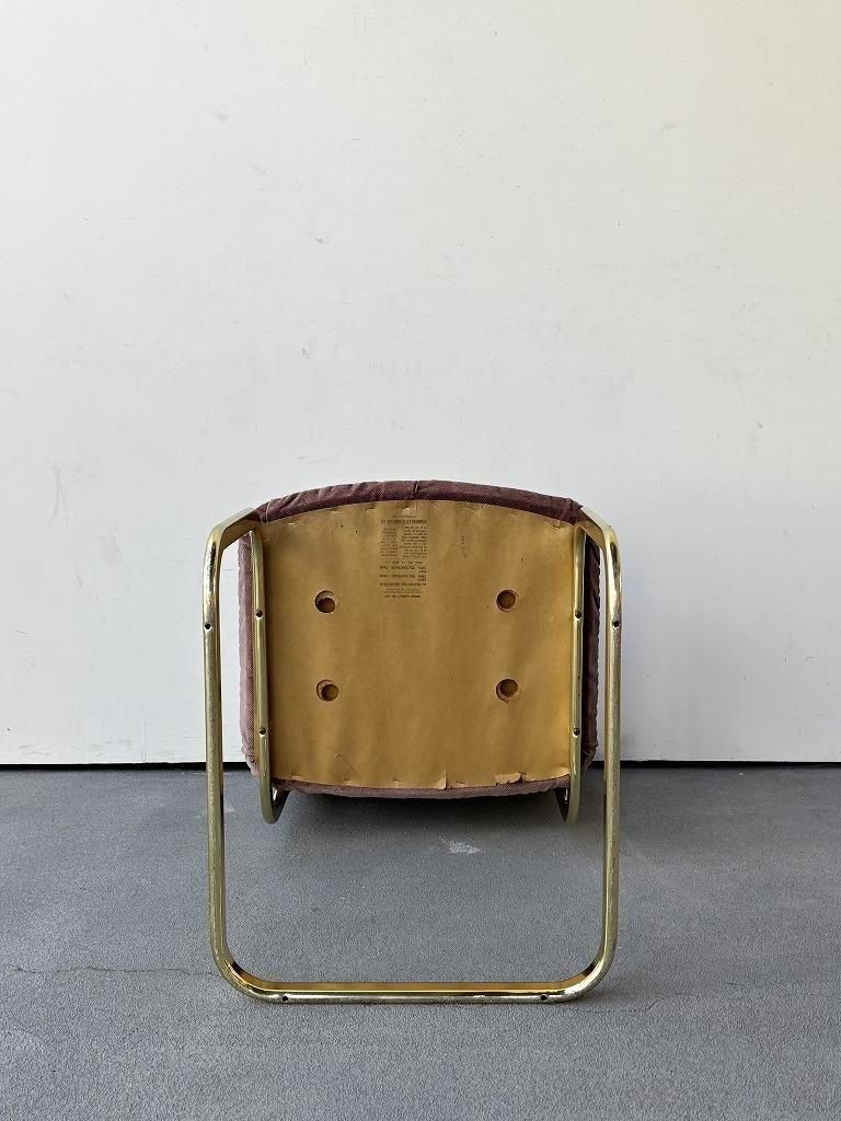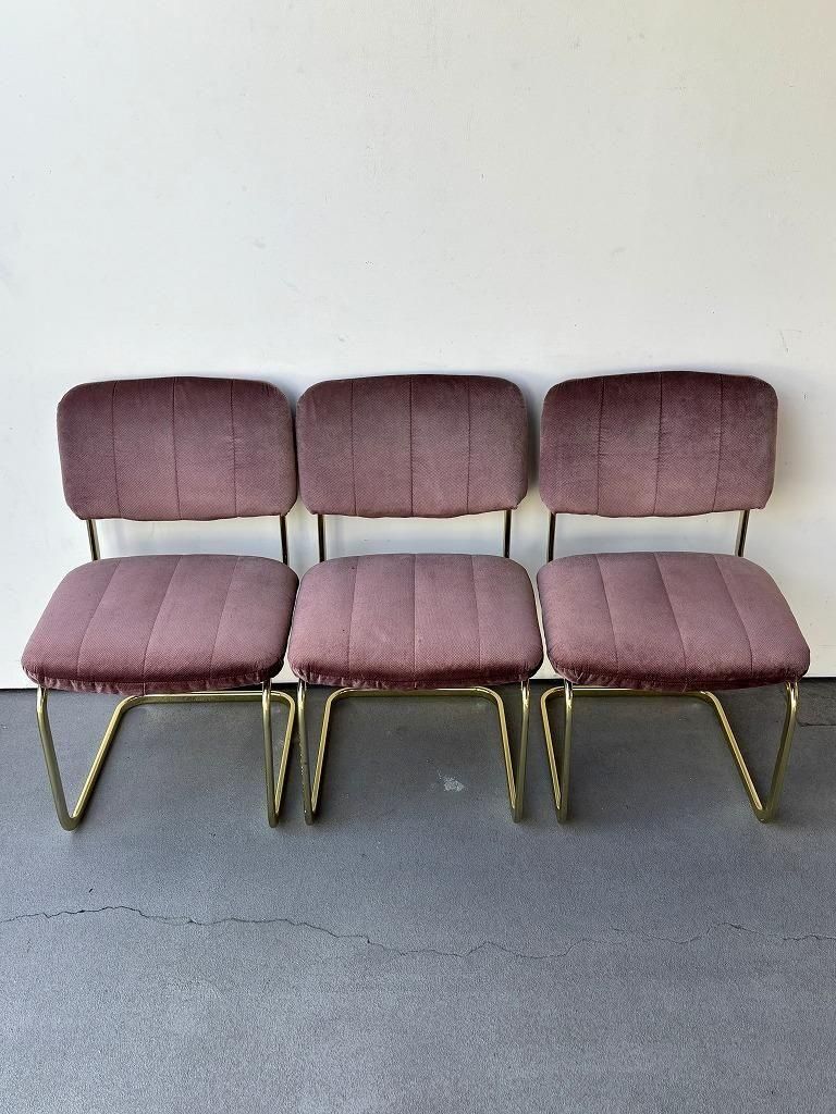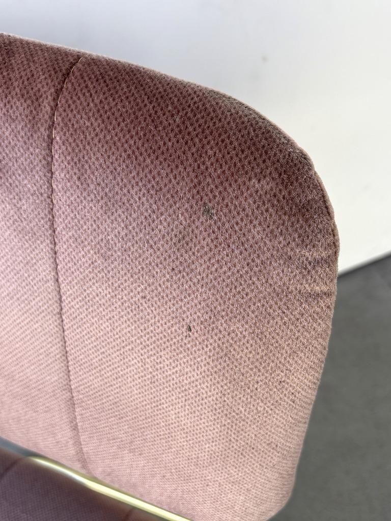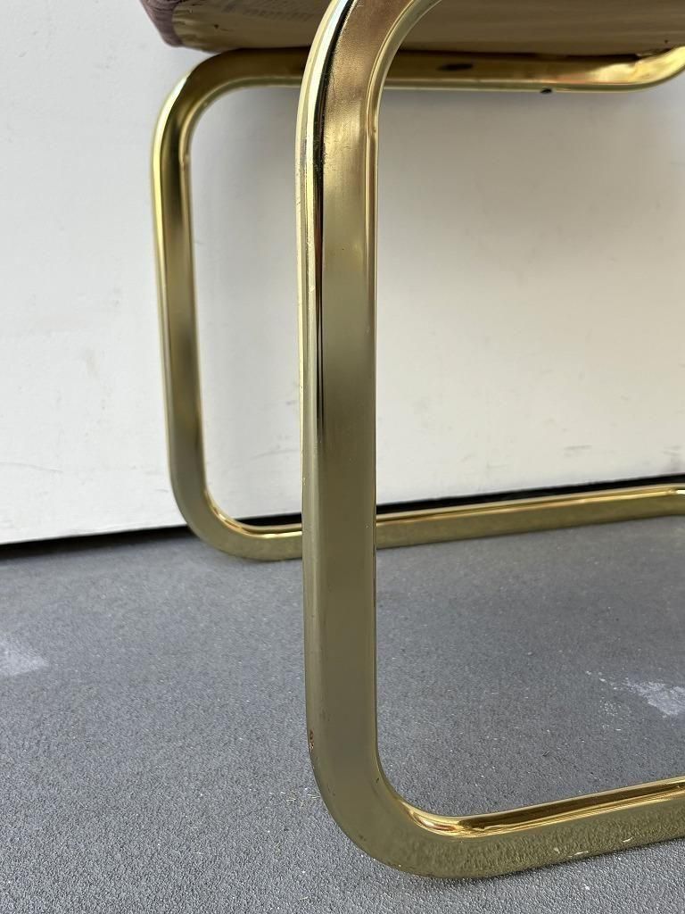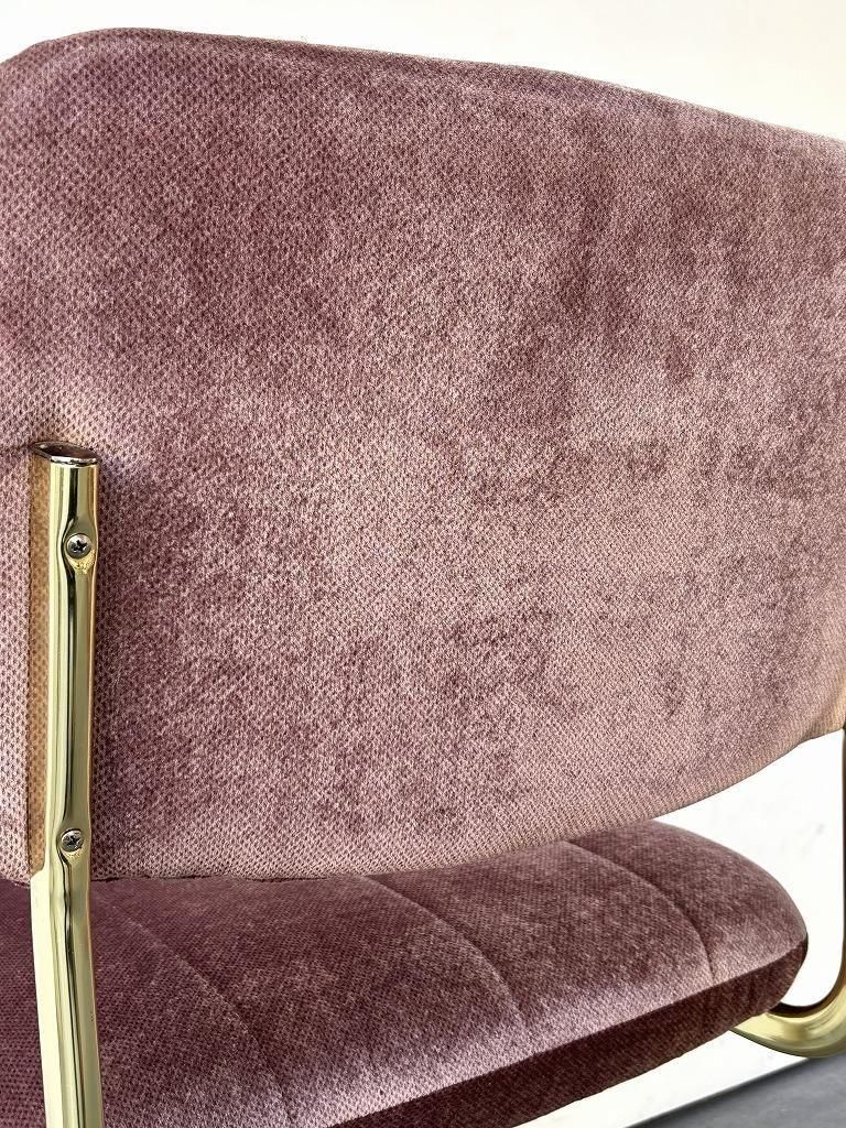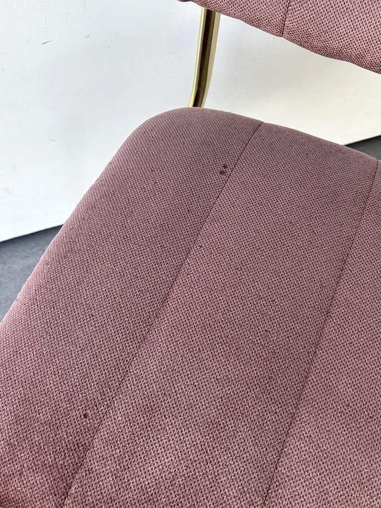 このチェアもフレームには艶やかなゴールドメッキスチールを採用し、背と座にはくすみのあるピンクのファブリックを使用しています。柔らかく光を反射するベルベット調の生地と、チューブ状に曲げられたスチールの組み合わせが、80年代以降のポストモダンの潮流を感じさせます。