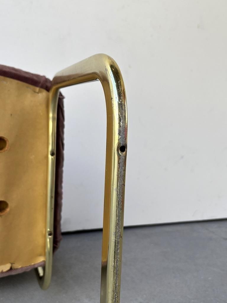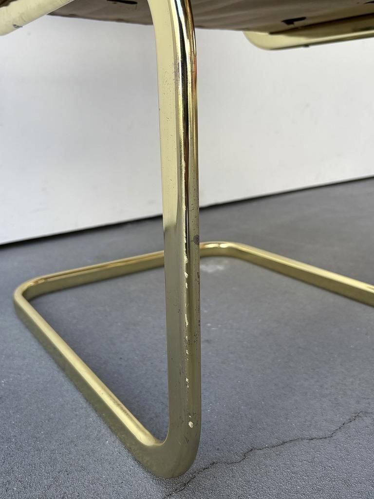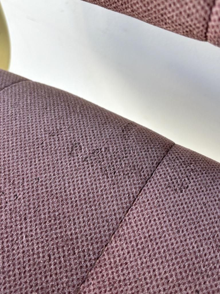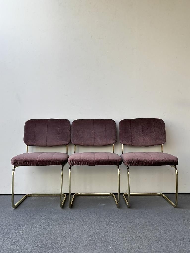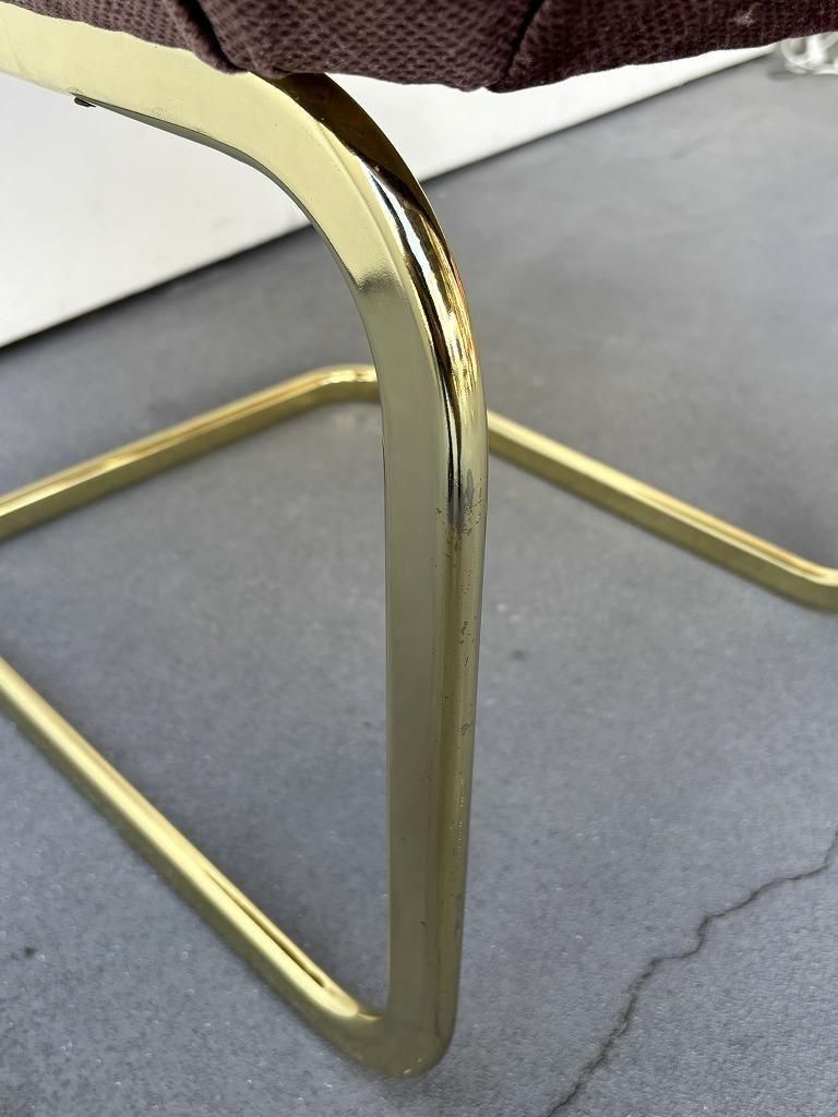 このチェアもフレームには艶やかなゴールドメッキスチールを採用し、背と座にはくすみのあるピンクのファブリックを使用しています。柔らかく光を反射するベルベット調の生地と、チューブ状に曲げられたスチールの組み合わせが、80年代以降のポストモダンの潮流を感じさせます。