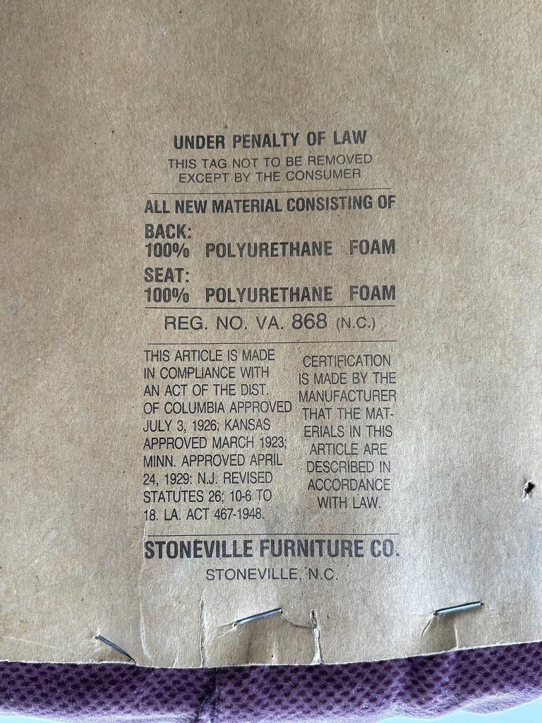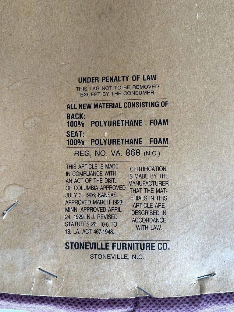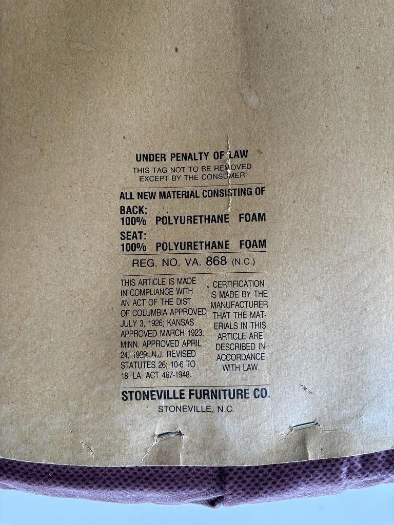 STONEVILLE FURNITURE Co.は1933年創業のアメリカ・ノースカロライナ州ロッキンガム郡ストーンヴィル(Stoneville, N.C.)に本社と工場を構えていた家具メーカーです。主にダイニングチェアやテーブルなどの家庭用家具を製造し、メタルフレームを使用したモダンデザインのチェアや、ルーサイト(透明プラスチック)、ファブリック、ビニールレザーなどを組み合わせたモデルを多く展開していました。