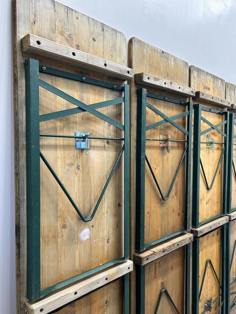無垢材の天板には長年の使用で刻まれたキズ痕が残り、独特の深みある雰囲気があり、グリーンにペイントされたスチールレッグは折り畳み式で、収納や持ち運びも容易に行えます。