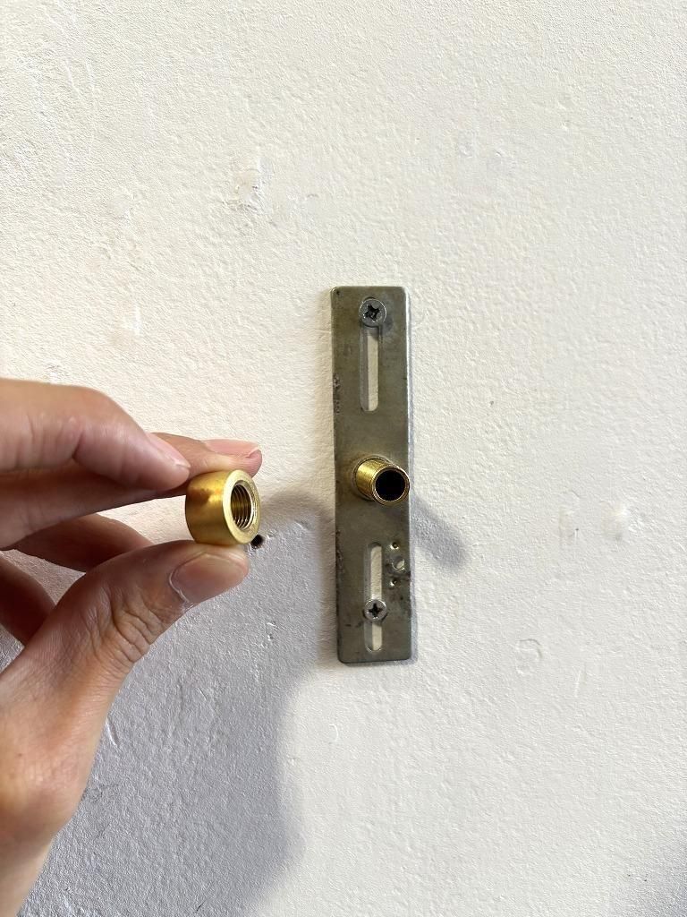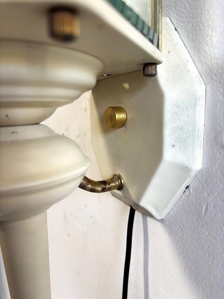 金属パーツの経年変化や塗装のマットなホワイト仕上げが印象的で、点灯時には壁に対して左右対称の光の帯を描くのが魅力的です。光が柔らかく反射してクラシックな陰影を作り出します。