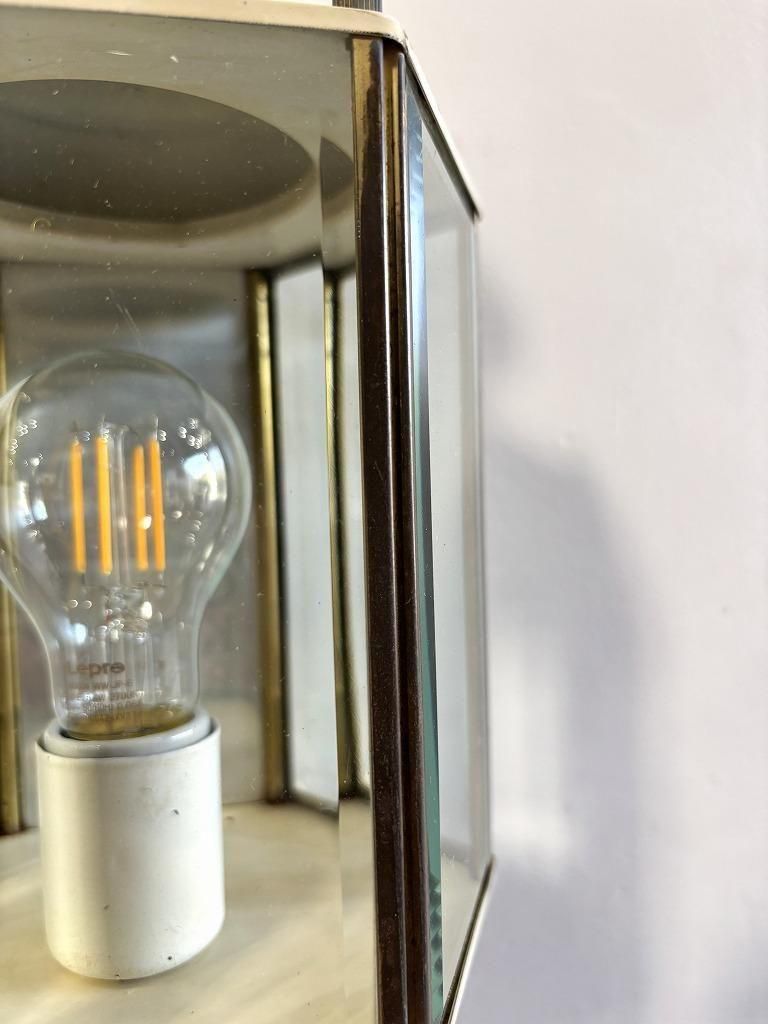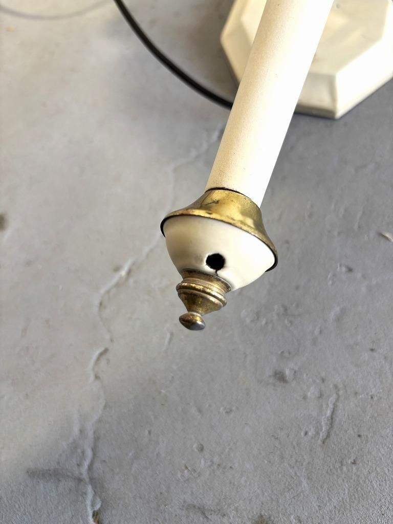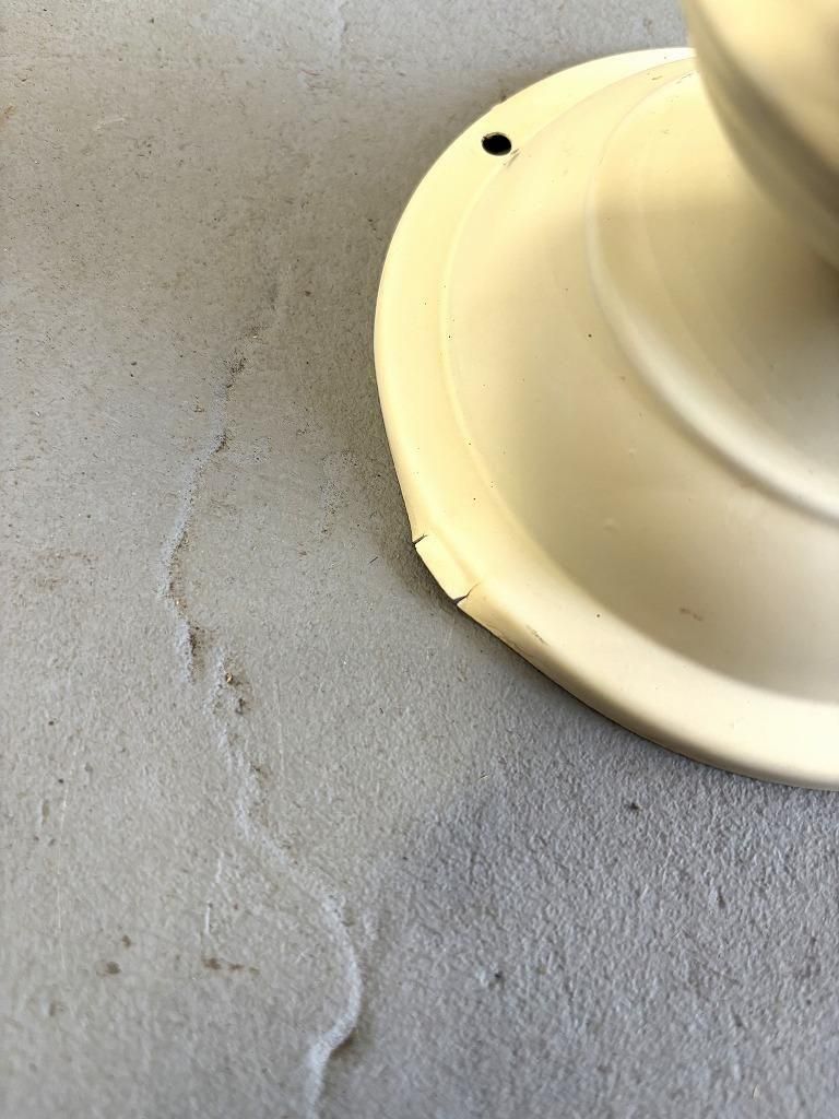 金属パーツの経年変化や塗装のマットなホワイト仕上げが印象的で、点灯時には壁に対して左右対称の光の帯を描くのが魅力的です。光が柔らかく反射してクラシックな陰影を作り出します。