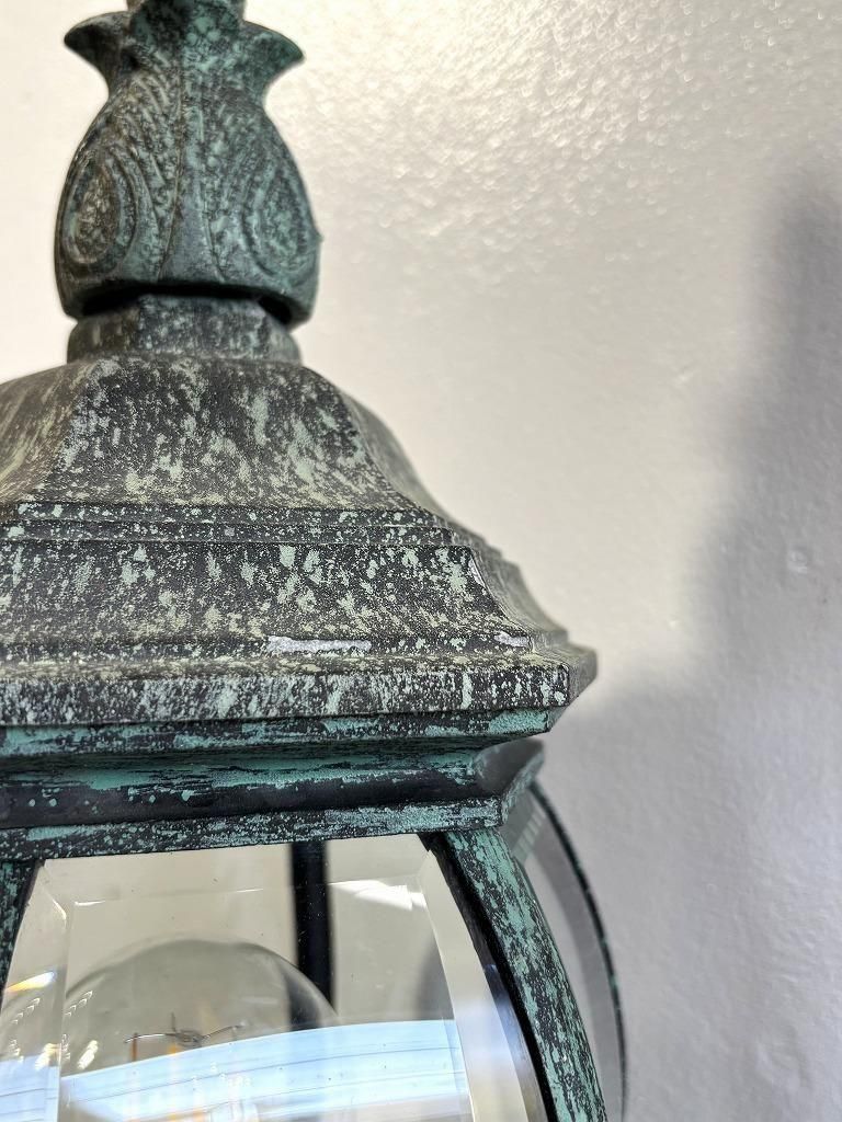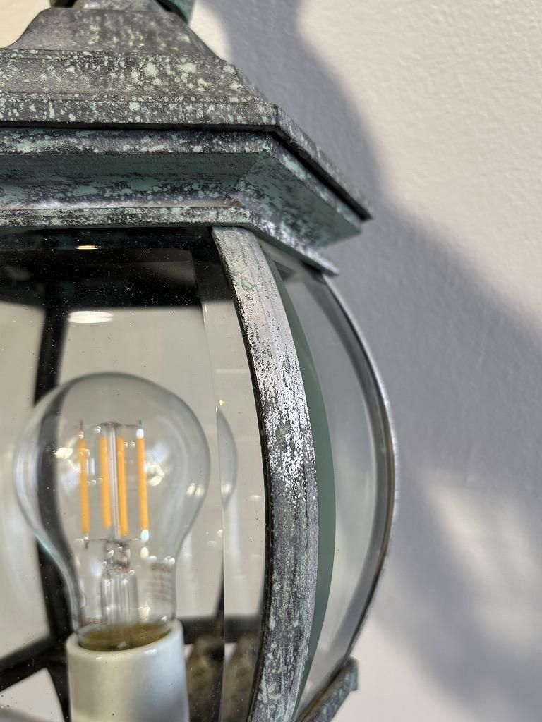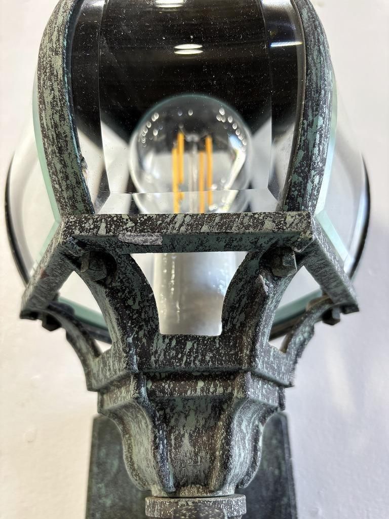 緑がかったグリーンエイジング仕上げが、長年使い込まれた金属のような深みを演出し、透明ガラス越しに電球の光がくっきりと映り、周囲の壁に扇状の光が左右対称に広がります。