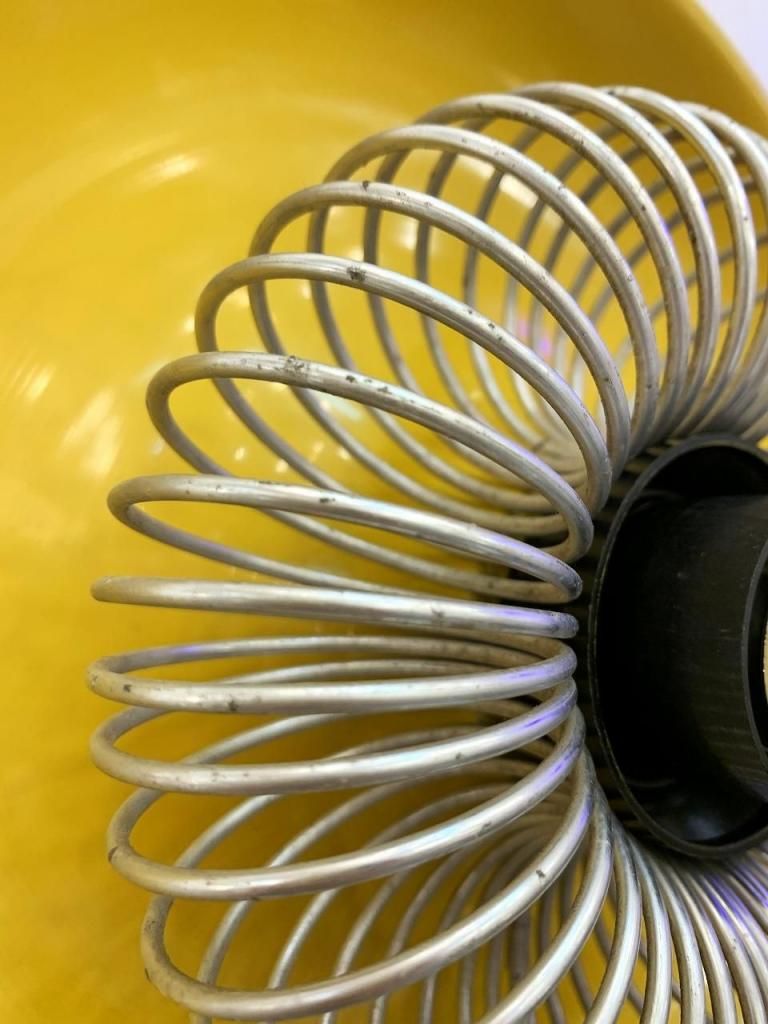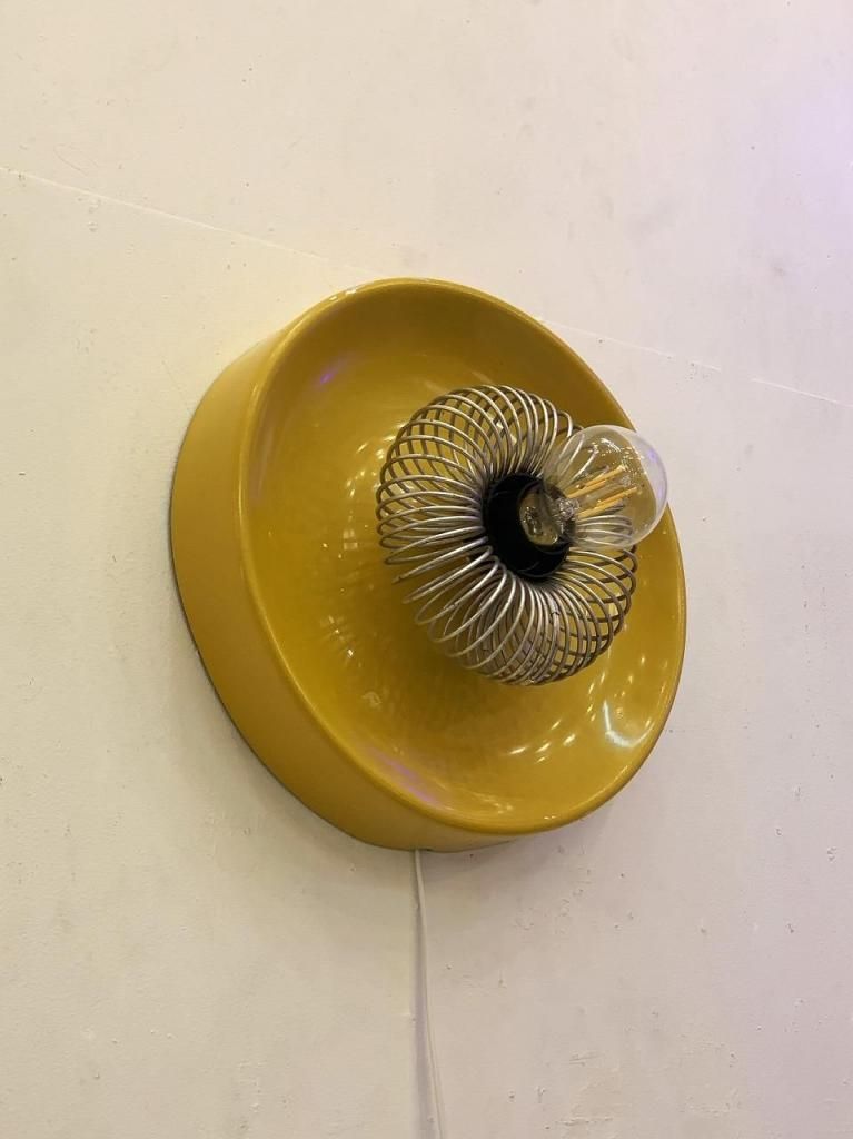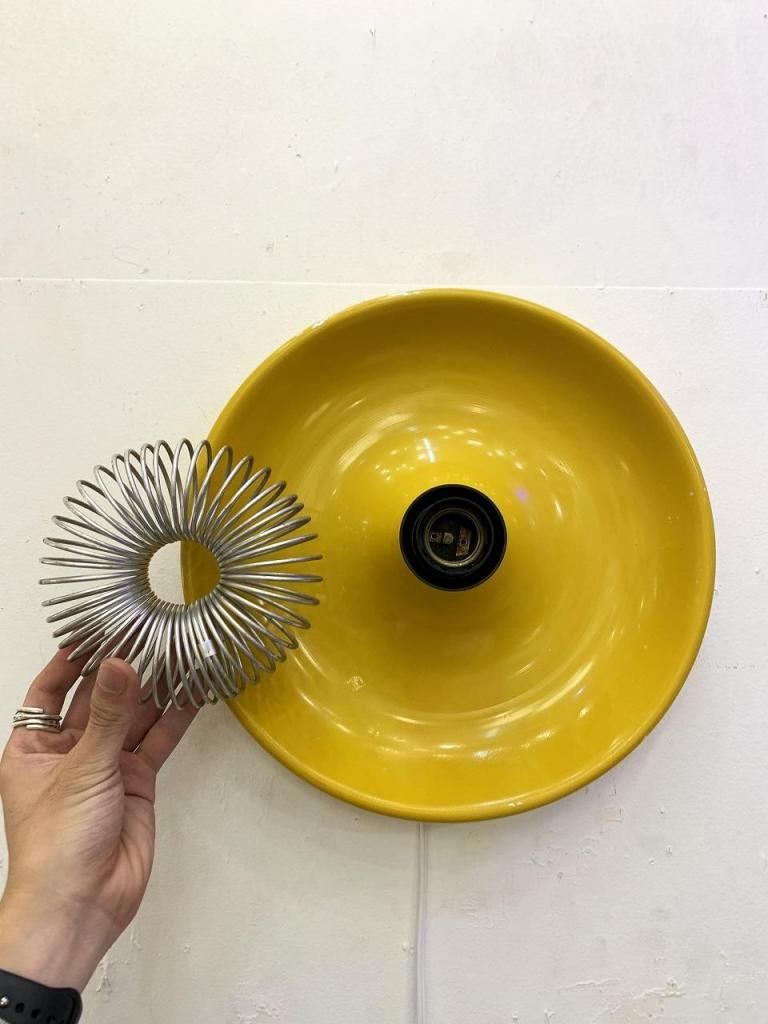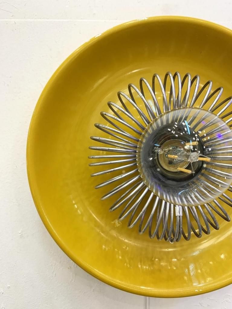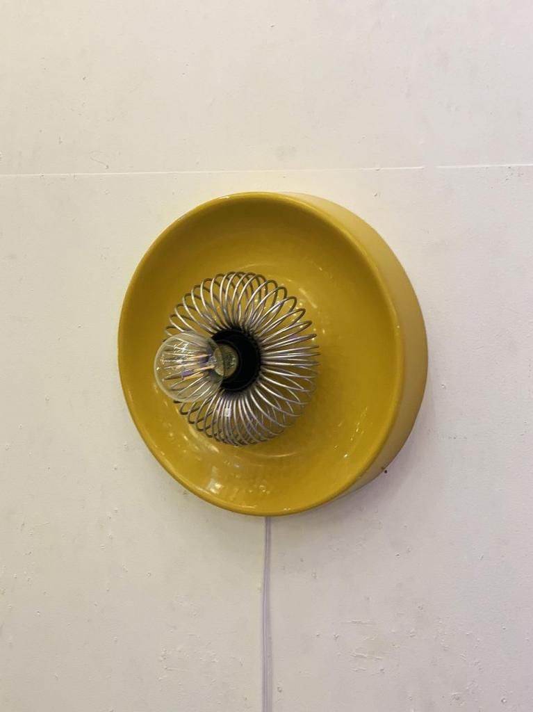 工業的な構造美をもつスチール製スパイラルガードと、柔らかな光沢をもつシェードの組み合わせが特徴的です。点灯時は、反射面の黄色が壁面をほんのり染め上げ、オブジェのように存在感を放ちます。