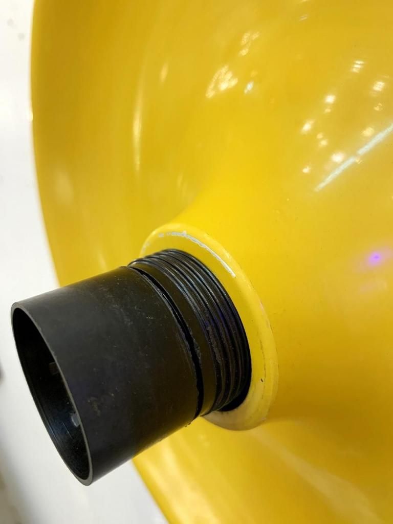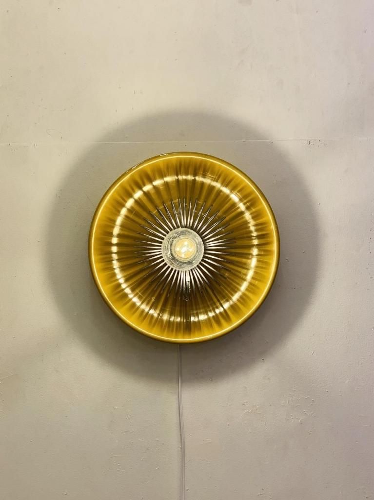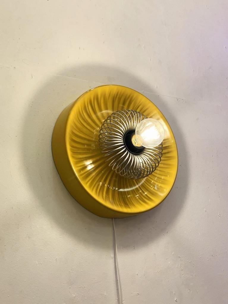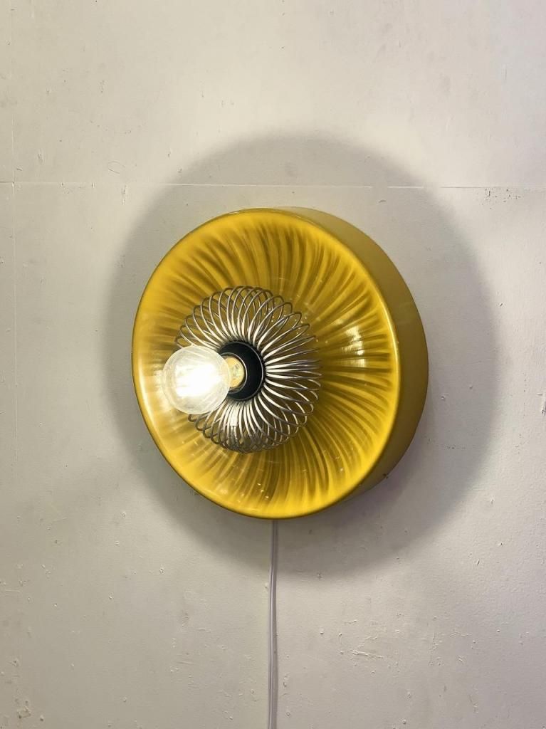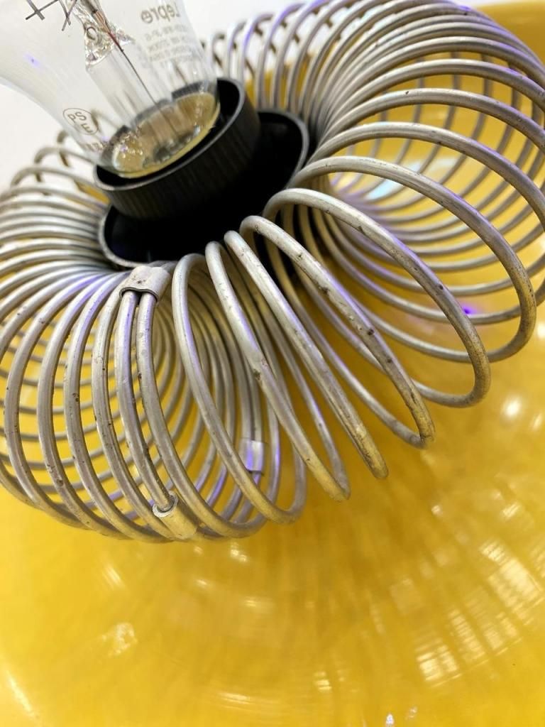 工業的な構造美をもつスチール製スパイラルガードと、柔らかな光沢をもつシェードの組み合わせが特徴的です。点灯時は、反射面の黄色が壁面をほんのり染め上げ、オブジェのように存在感を放ちます。
