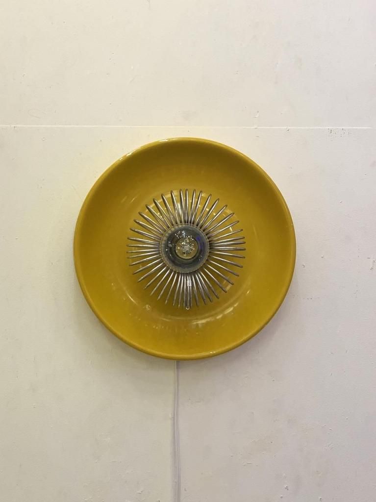 背面に発色の美しいイエローエナメルシェードを備えた仕様で、空間に明るくポジティブな印象を与える一灯。