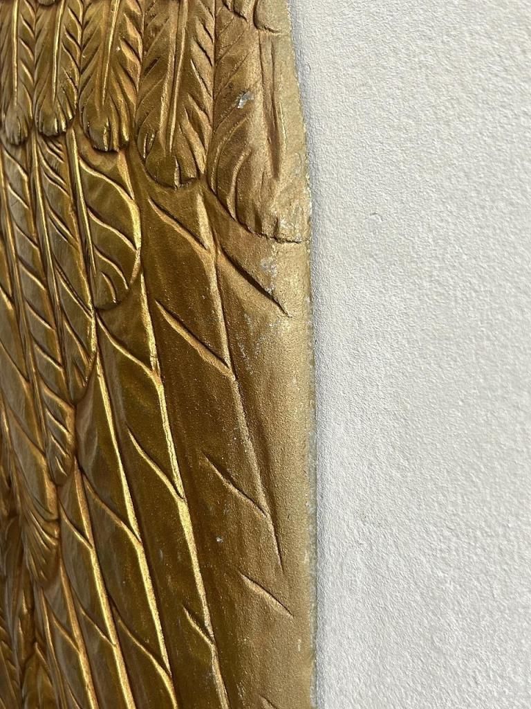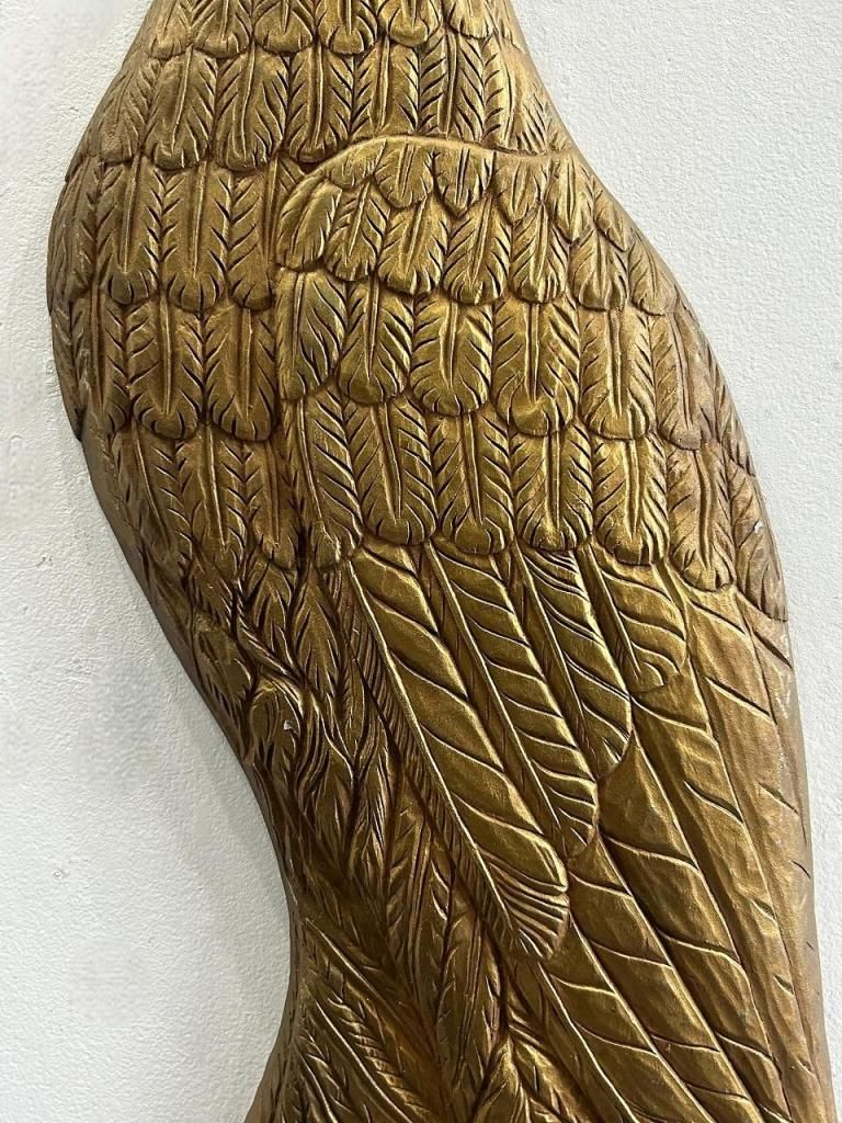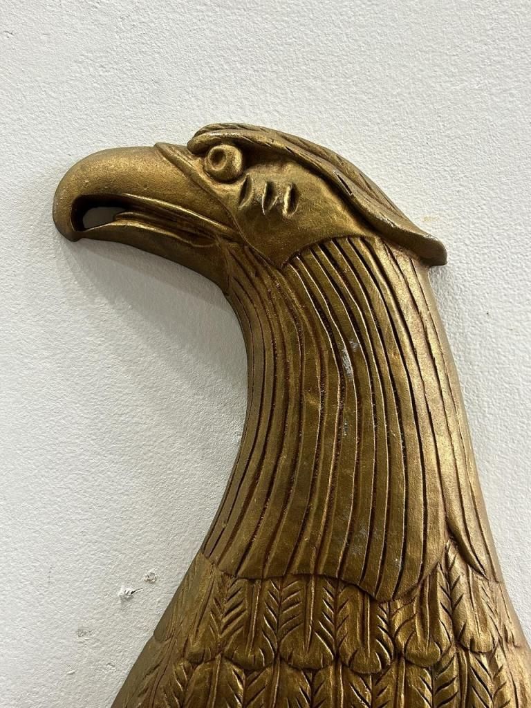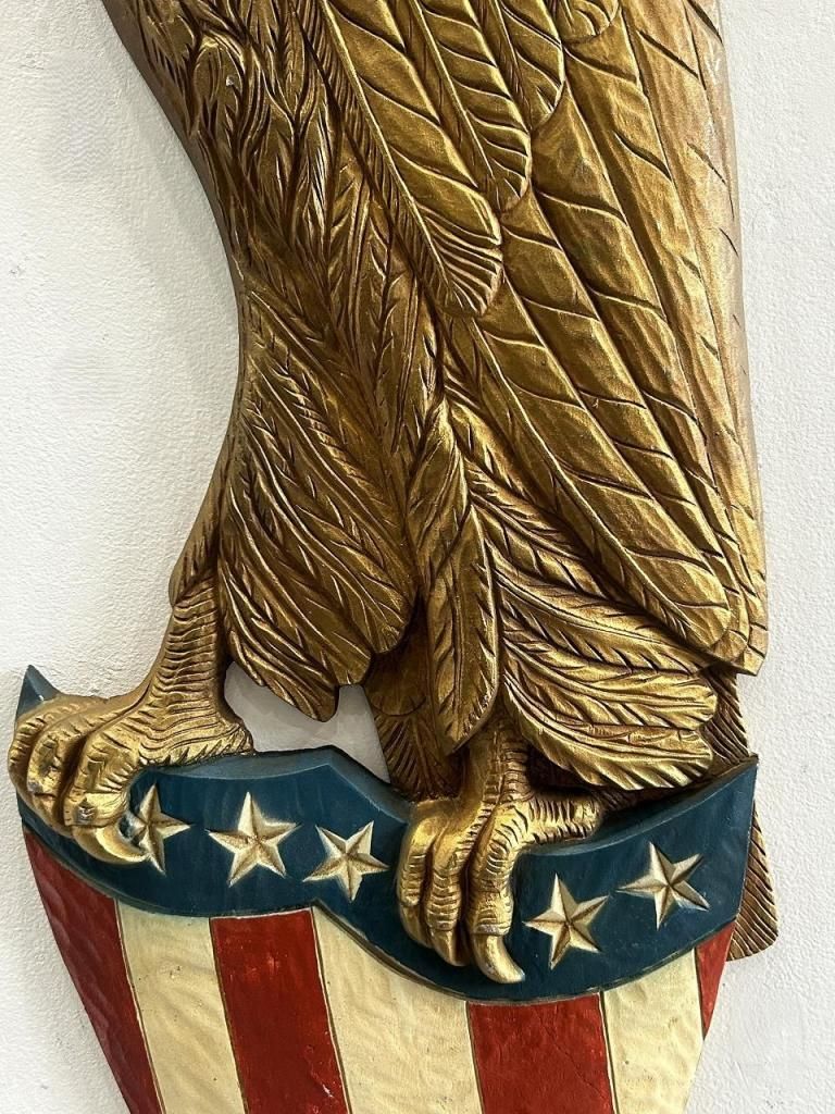 キャストアルミニウムによる立体的な造形と、重厚感のあるゴールド塗装、レッド・ホワイト・ブルーの色使いが印象的です。羽の一枚一枚まで丁寧に彫り込まれた仕上げからも、当時のクラフトマンシップが感じられます。