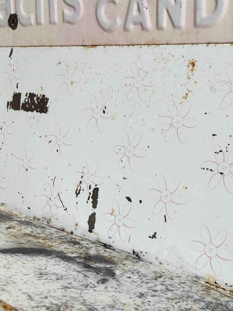 棚板やパネルには淡い花柄のプリントが残り、ポップで可愛らしい印象とインダストリアルな素材感が共存。