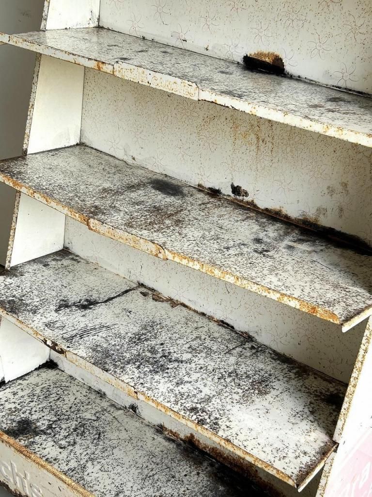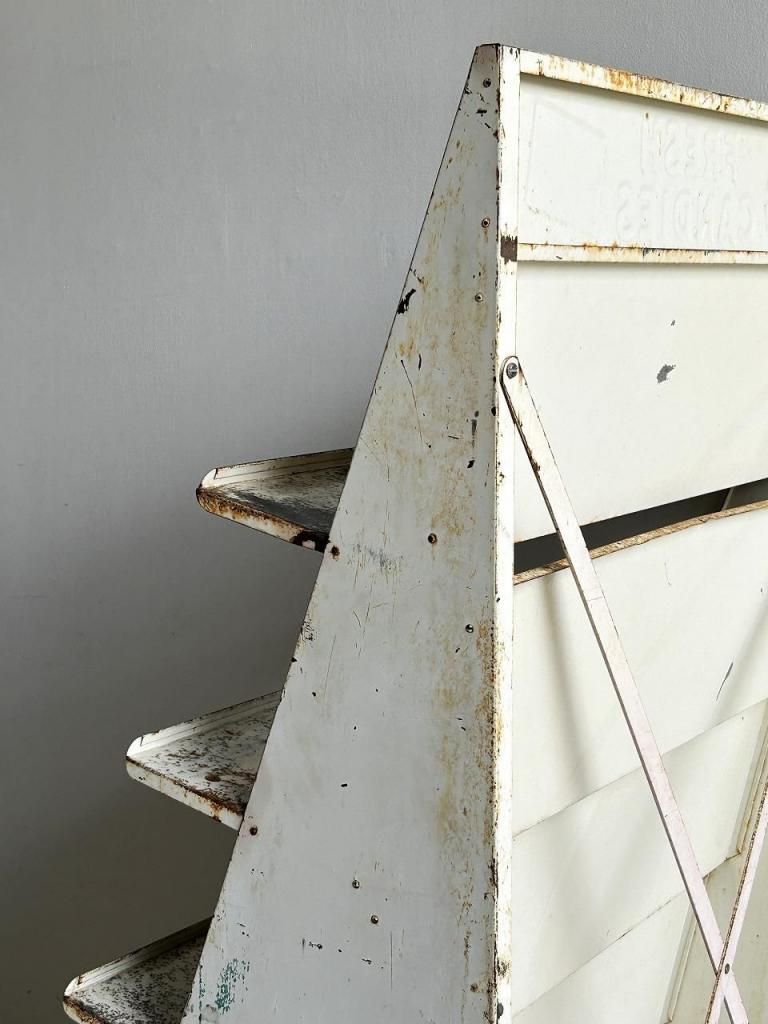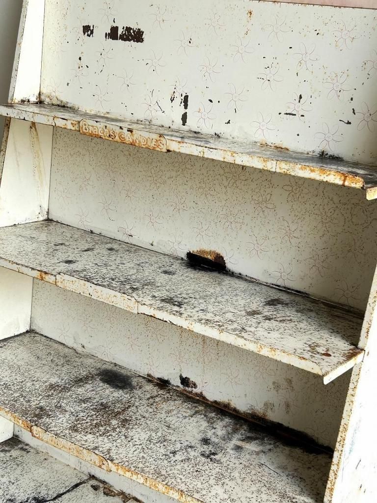 経年により塗装の剥がれや錆が浮き上がり、棚面には黒ずみや使用跡が見られますが、それがむしろヴィンテージ什器としての存在感を際立たせています。