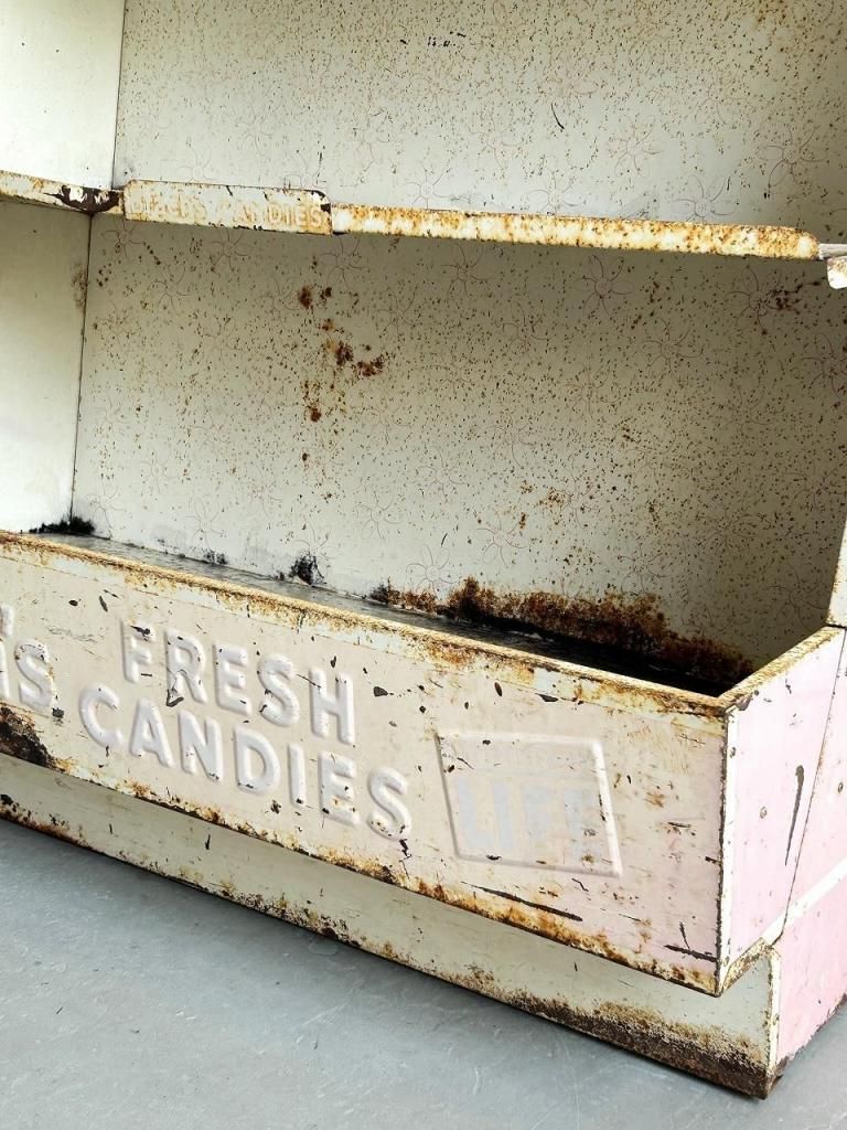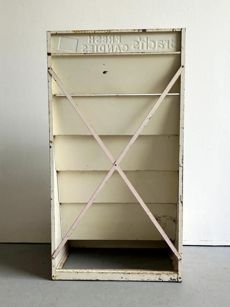 什器全体はスチール製で、適度な厚みを持つ鋼板をリベットで組み立てた堅牢な構造。背面にはクロス補強が施され、店舗内で大量のキャンディやボックスを陳列するために設計された実用什器であることがわかります。