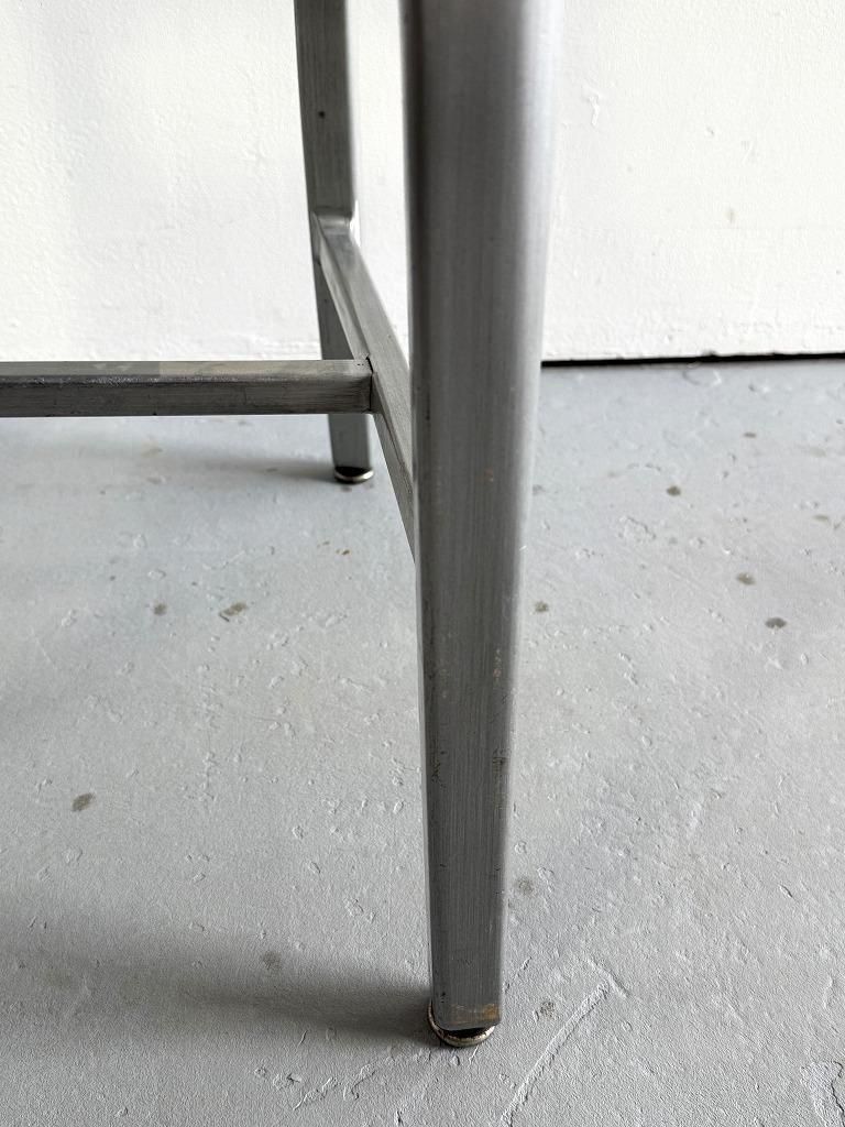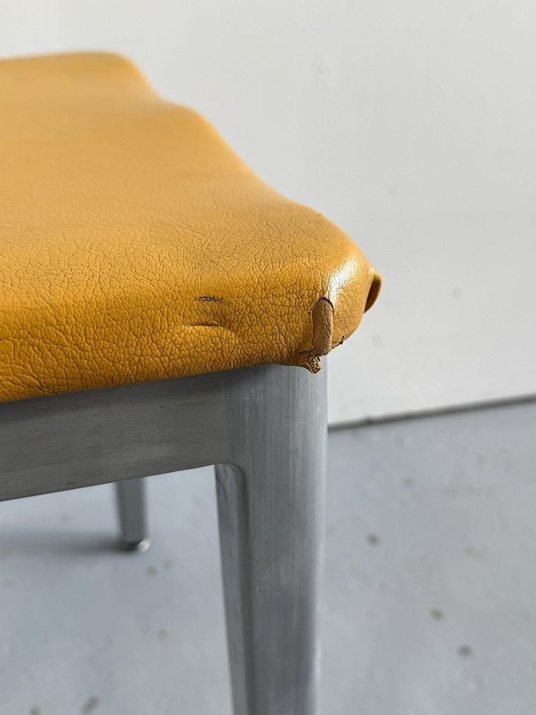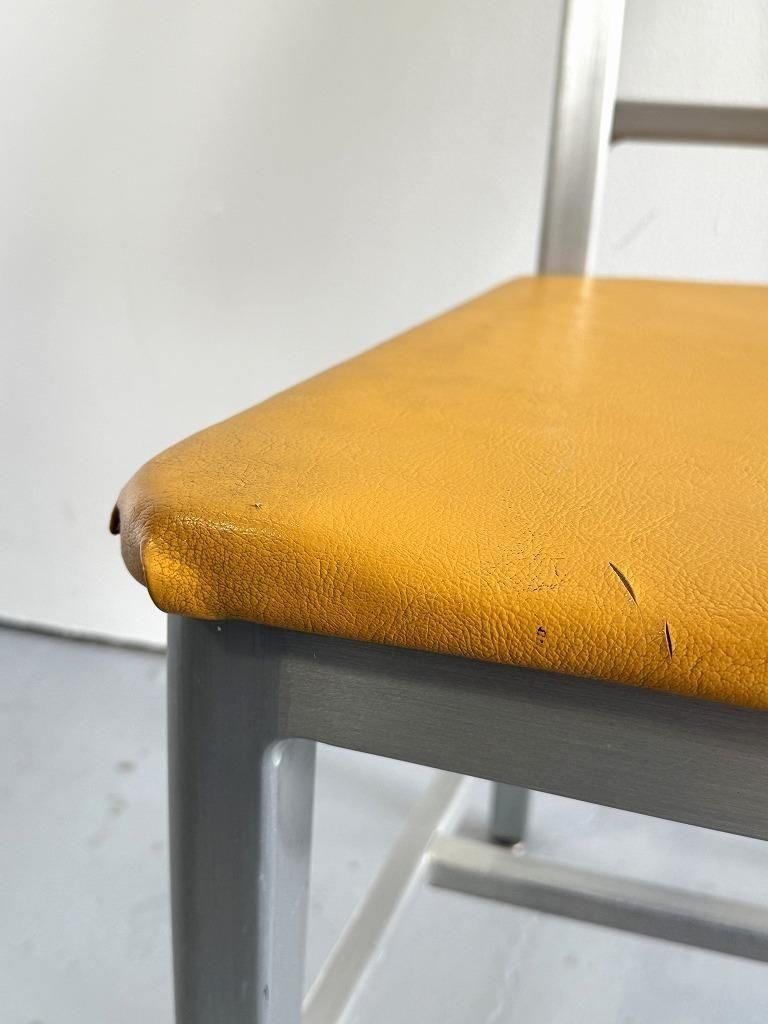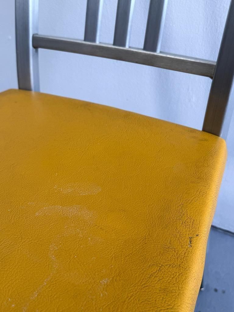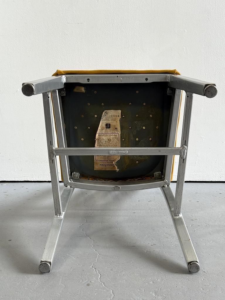 こちらは恐らく、公共施設で使われていた1脚で、座面にはマスタードイエローのビニールレザーで1950〜60年代アメリカで多用されたカラーです。インダストリアルデザインながらも、家庭的でポップな印象も共存しています。