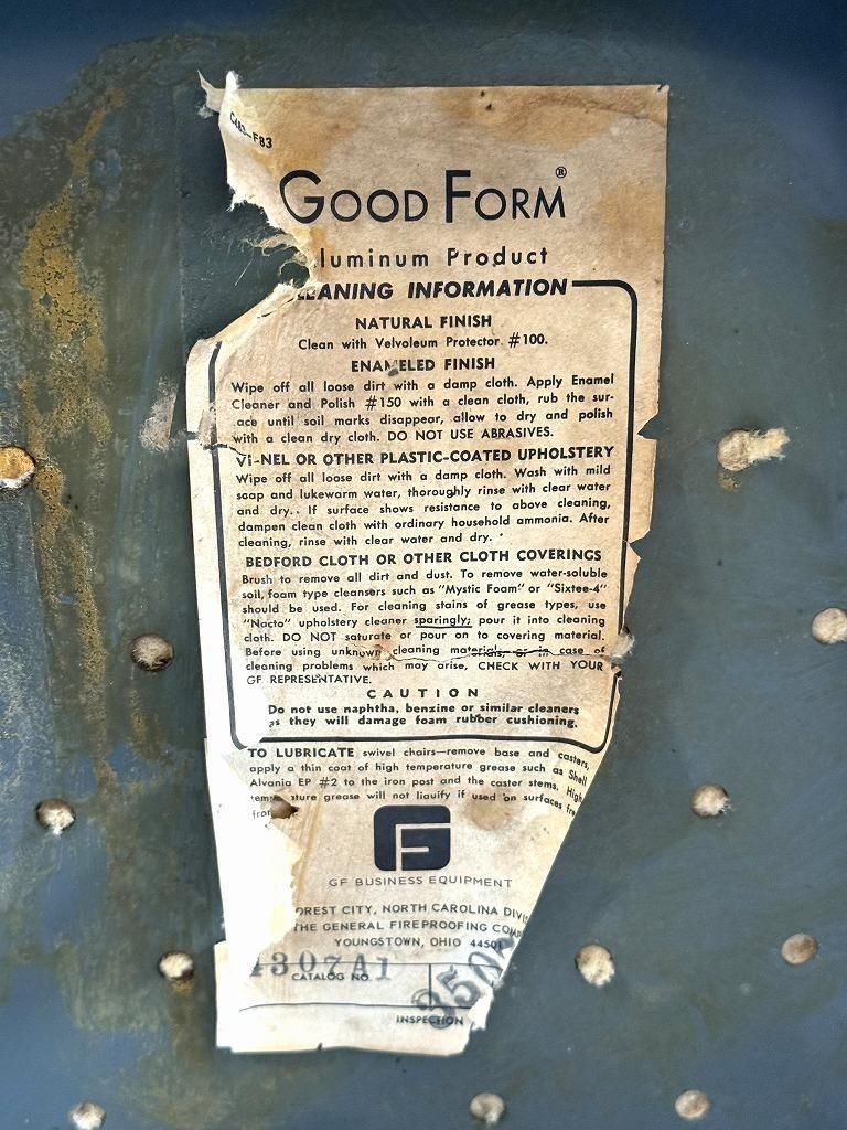 General Fireproofing社とは、もともとは防火金庫・スチール家具メーカーとして創業し、後にオフィス家具・航空機用アルミ製品へと展開。1930年代に「アルミニウム製で軽量・防錆・不燃・高強度」という軍用規格を満たす椅子を開発。それが “Goodform Chair” の起源となります。