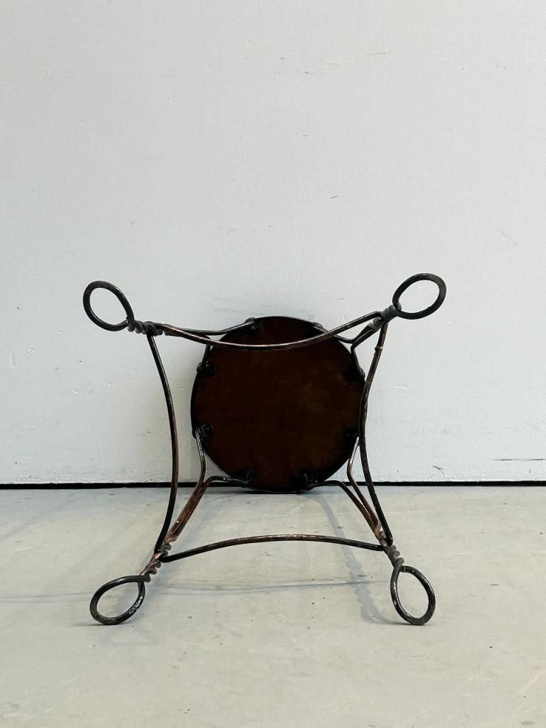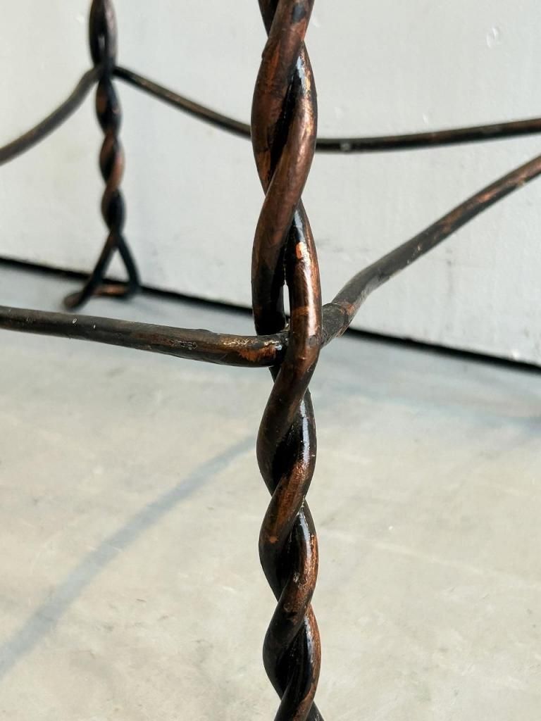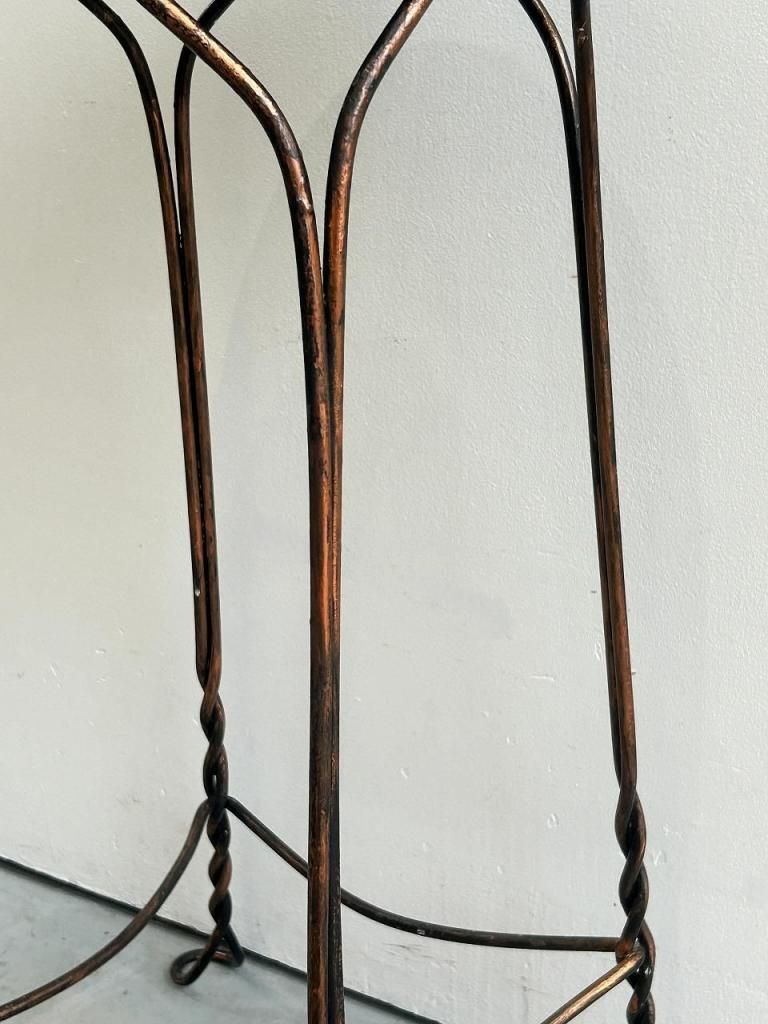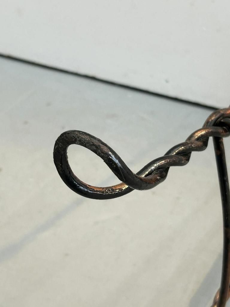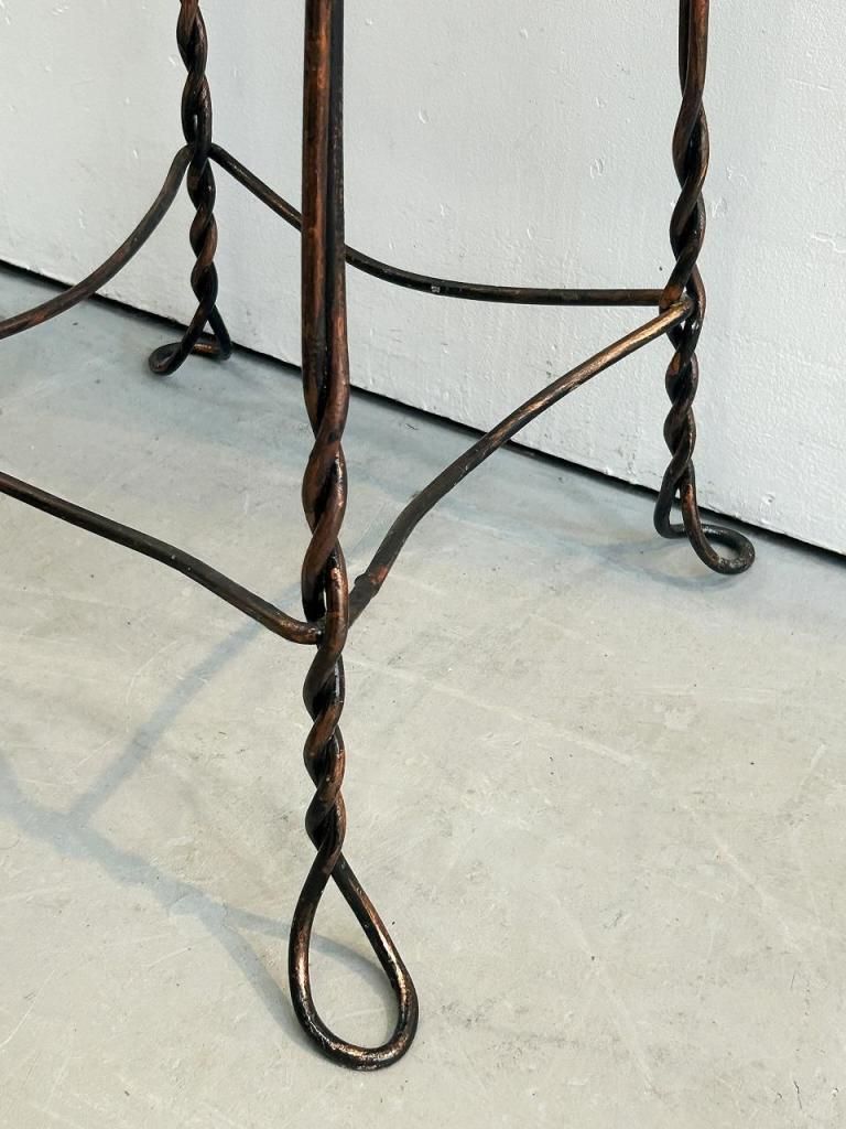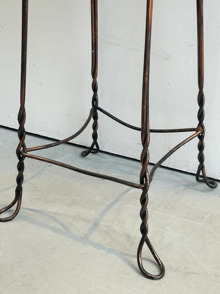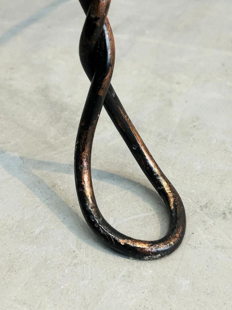 脚に施されたツイスト(螺旋状の鉄のねじり)加工が特徴的で、無機質な金属に「動き」と「柔らかさ」を与える技術的装飾の役割も持つつつ、同時に強度と弾性を同時に確保。このツイストは当時のアールデコからアールヌーヴォー移行期のデザイン要素を色濃く残しています。