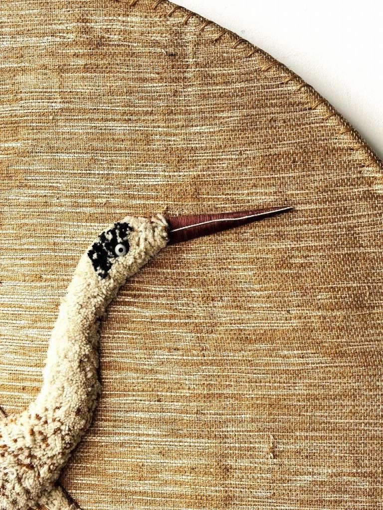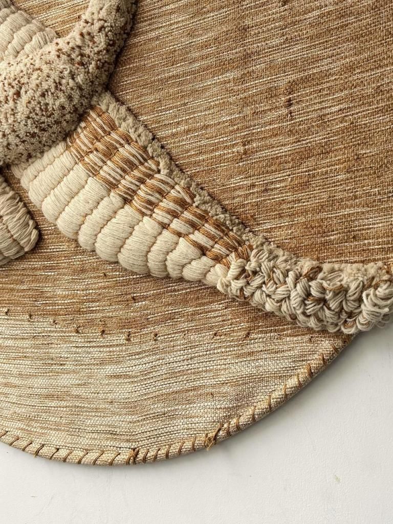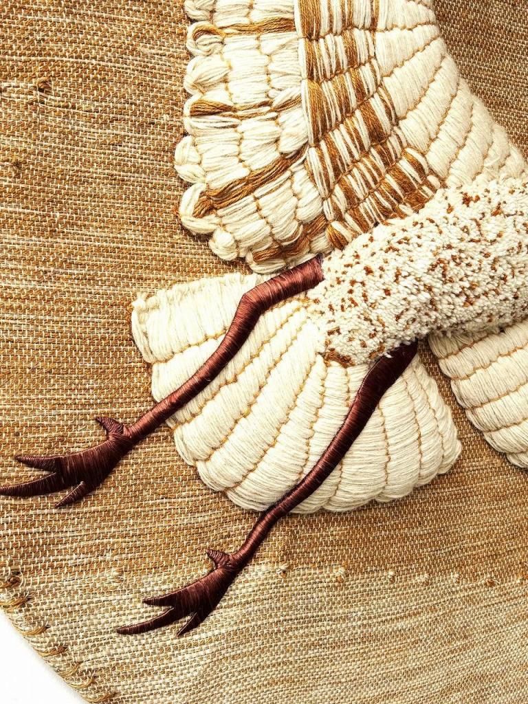 ベースにはジュートを中心に、ウールやシルク、コットン、そして補強用のスチールを組み合わせており、繊維の異なる質感を生かして立体的に羽ばたきを表現しています。部分的に厚みを持たせることで光の陰影が生まれ、視覚的にも触覚的にも豊かな表情を感じられる一枚です。