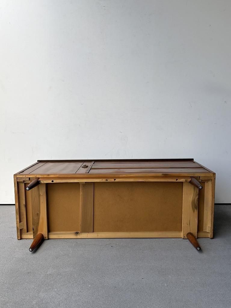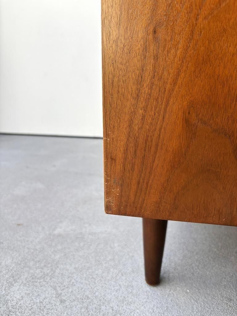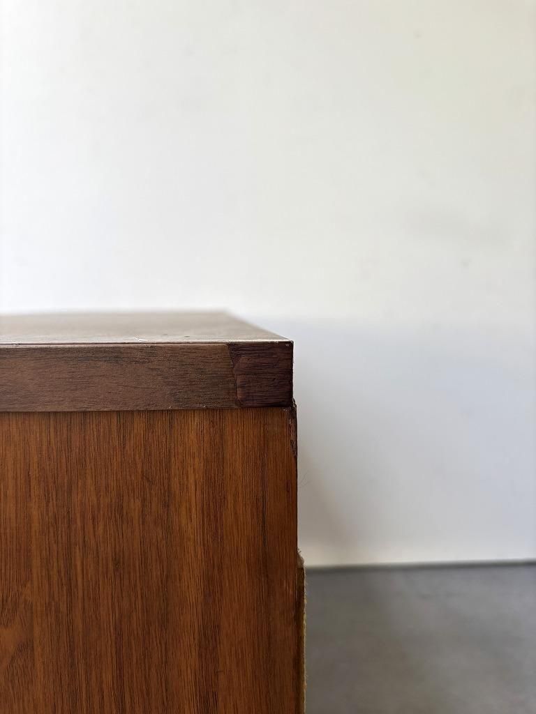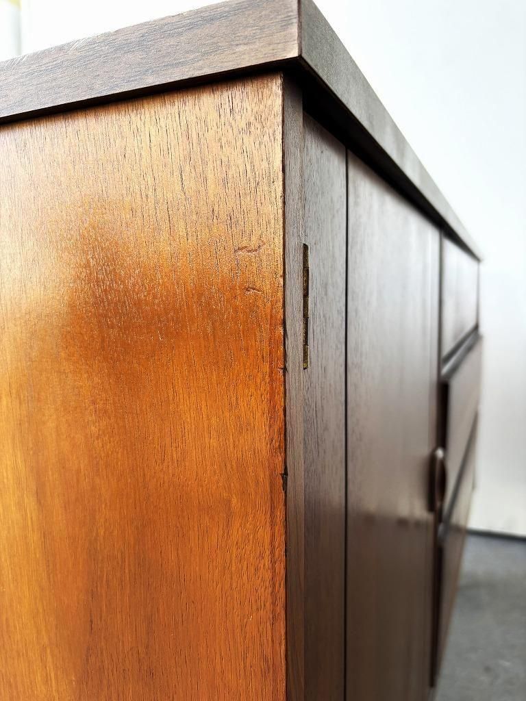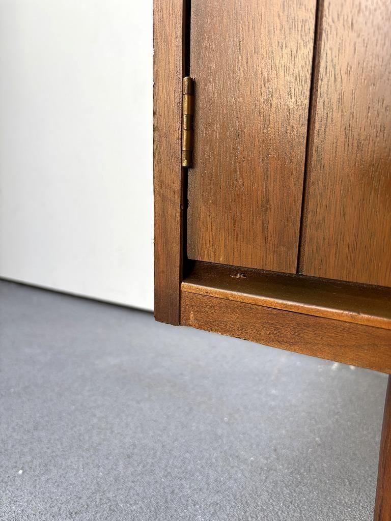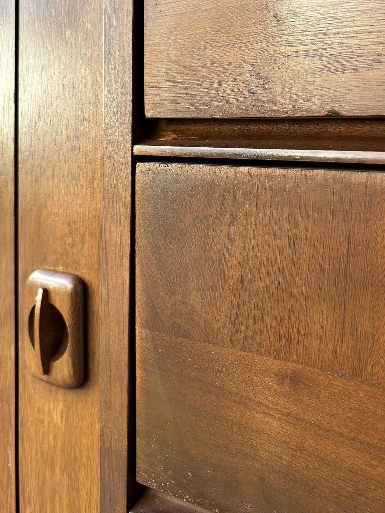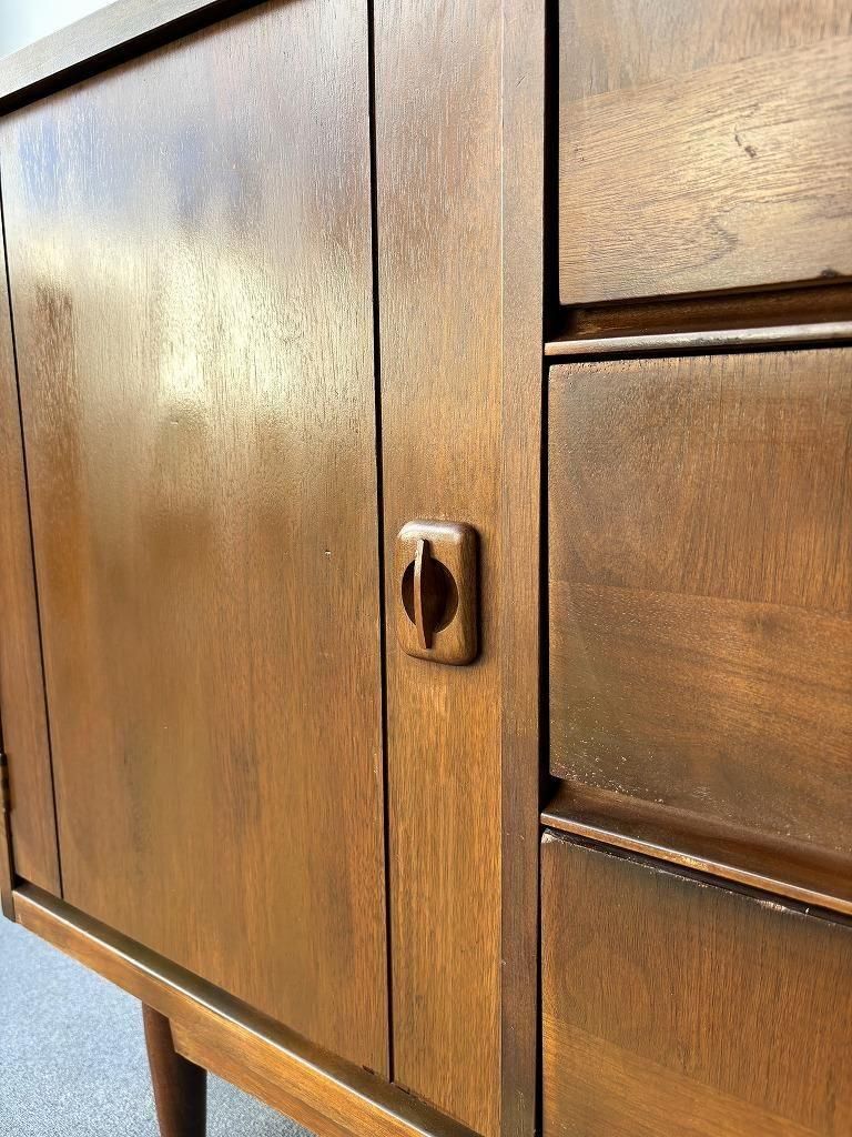 金具を使わず、扉の取っ手や引き出しの持ち手は木の塊から削り出しており、素材そのものの温かみを活かした構造美。下部の脚部はミッドセンチュリー期に良く見られる、細く絞られたテーパードレッグにすることで、視覚的に軽やかになっています。