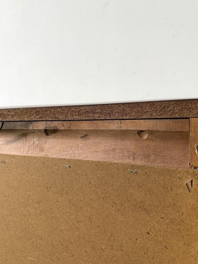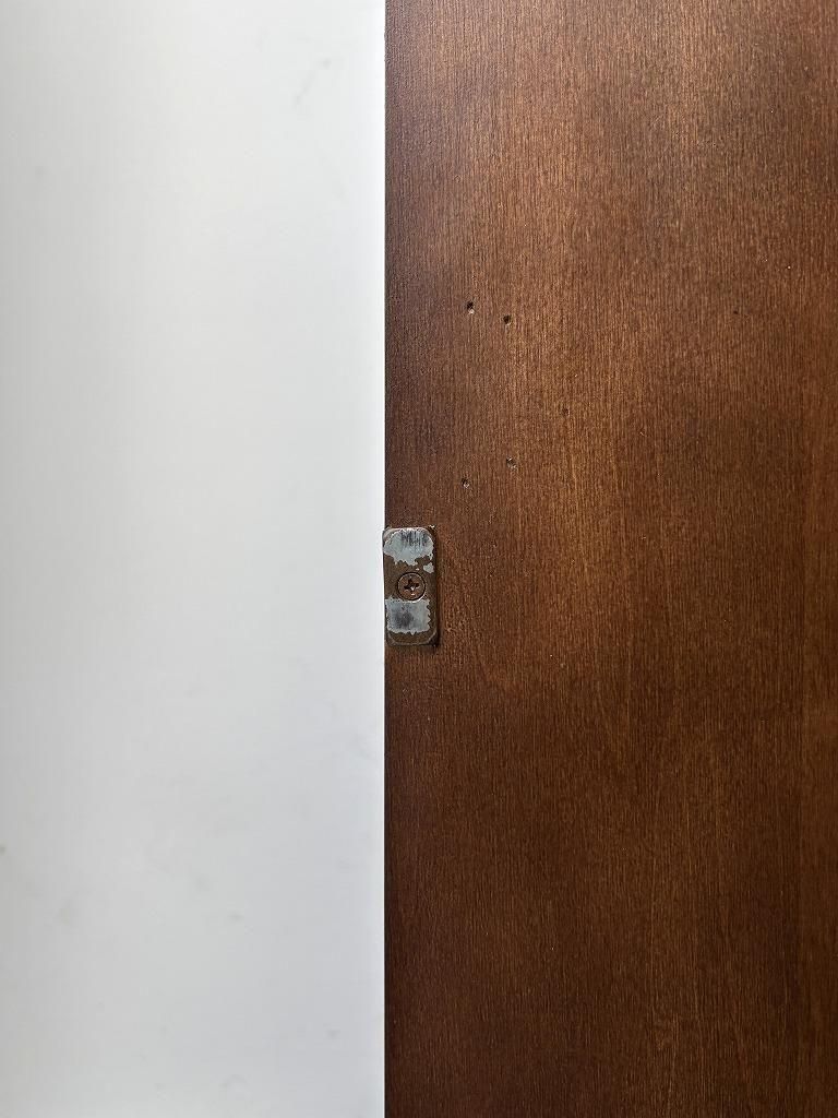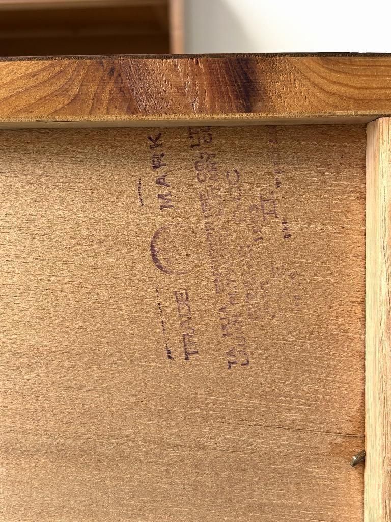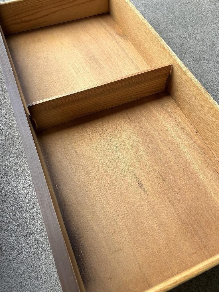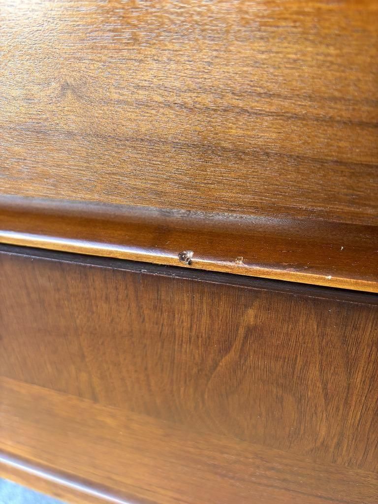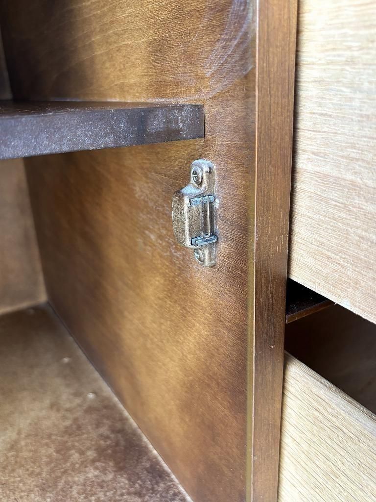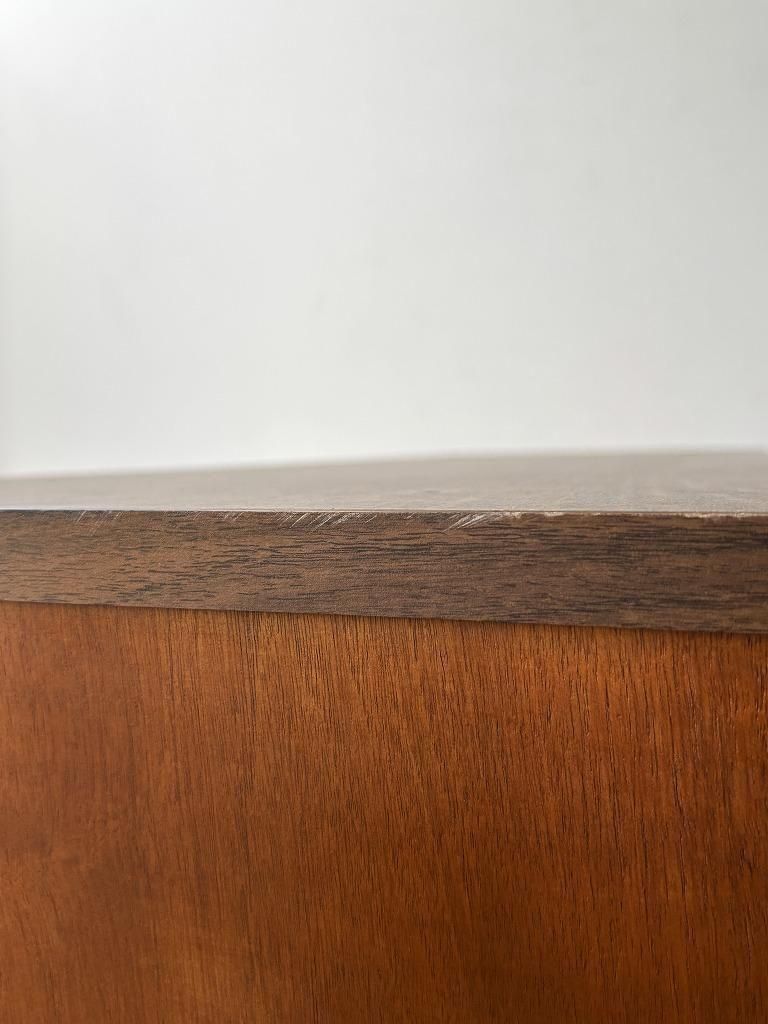 金具を使わず、扉の取っ手や引き出しの持ち手は木の塊から削り出しており、素材そのものの温かみを活かした構造美。下部の脚部はミッドセンチュリー期に良く見られる、細く絞られたテーパードレッグにすることで、視覚的に軽やかになっています。
