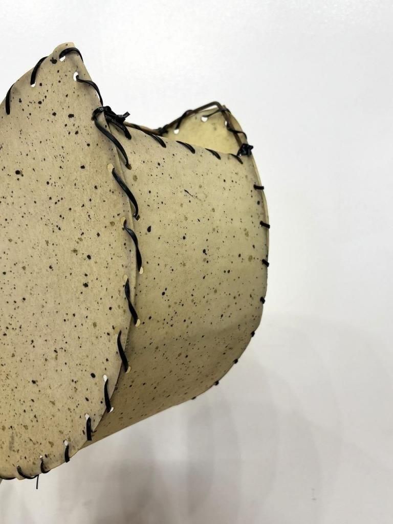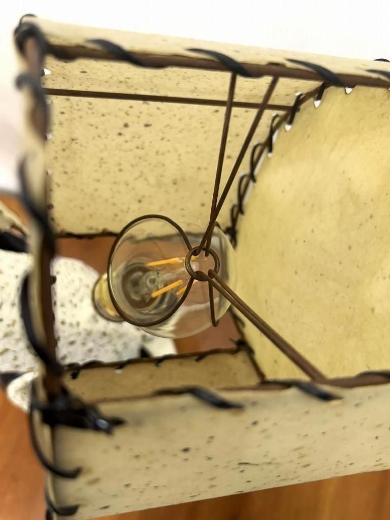 シェードには、ファイバーシェードを使用し透過時に暖かいアンバー色を放つのが魅力的です。黒いビニールコードで縁を「レースアップ」した構造で、これも1950年代の米国製ランプ特有の意匠となっています。