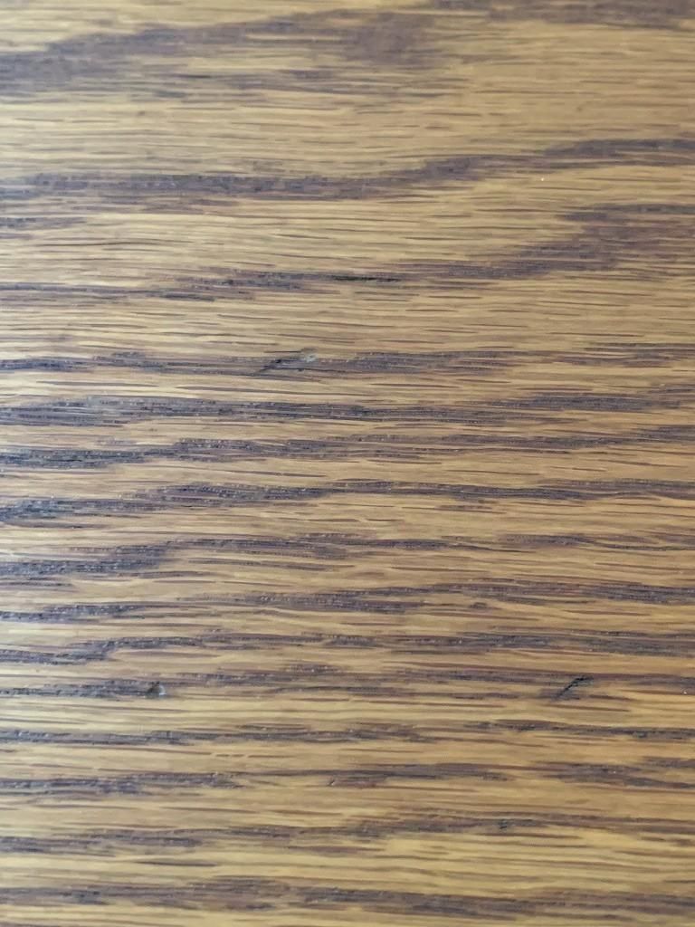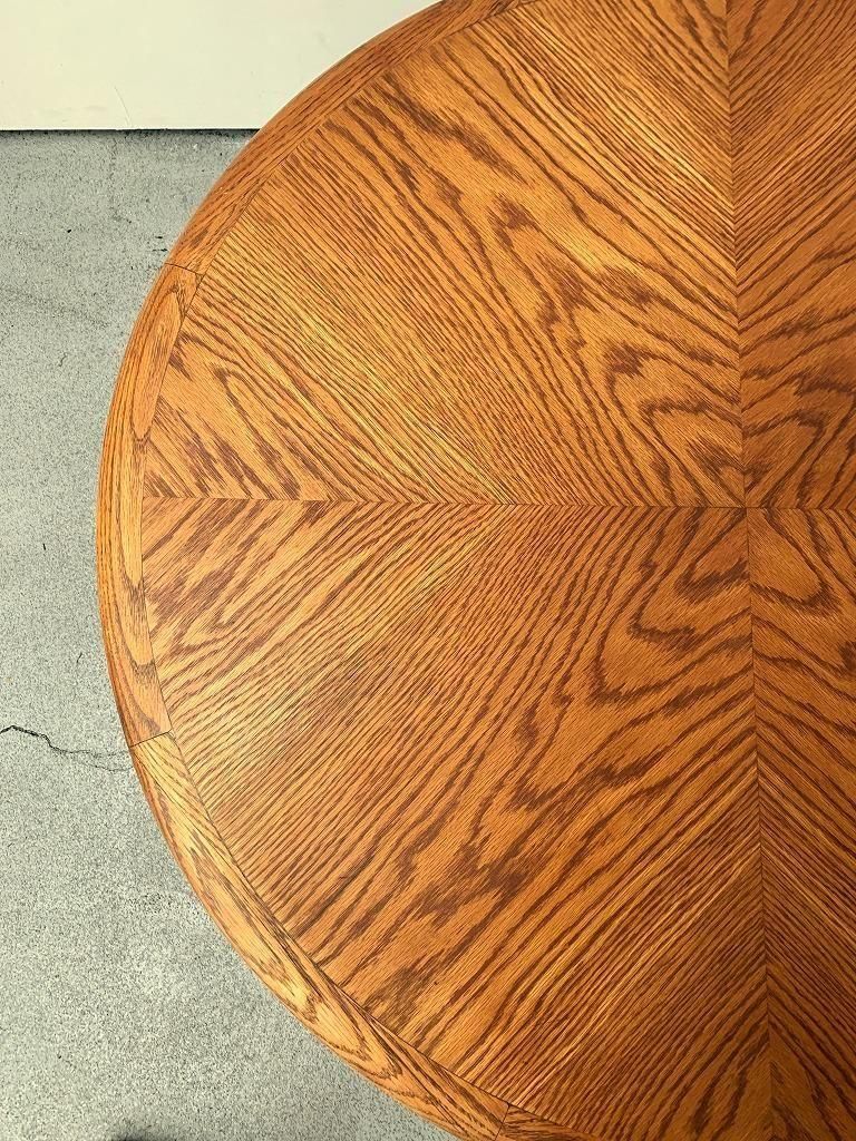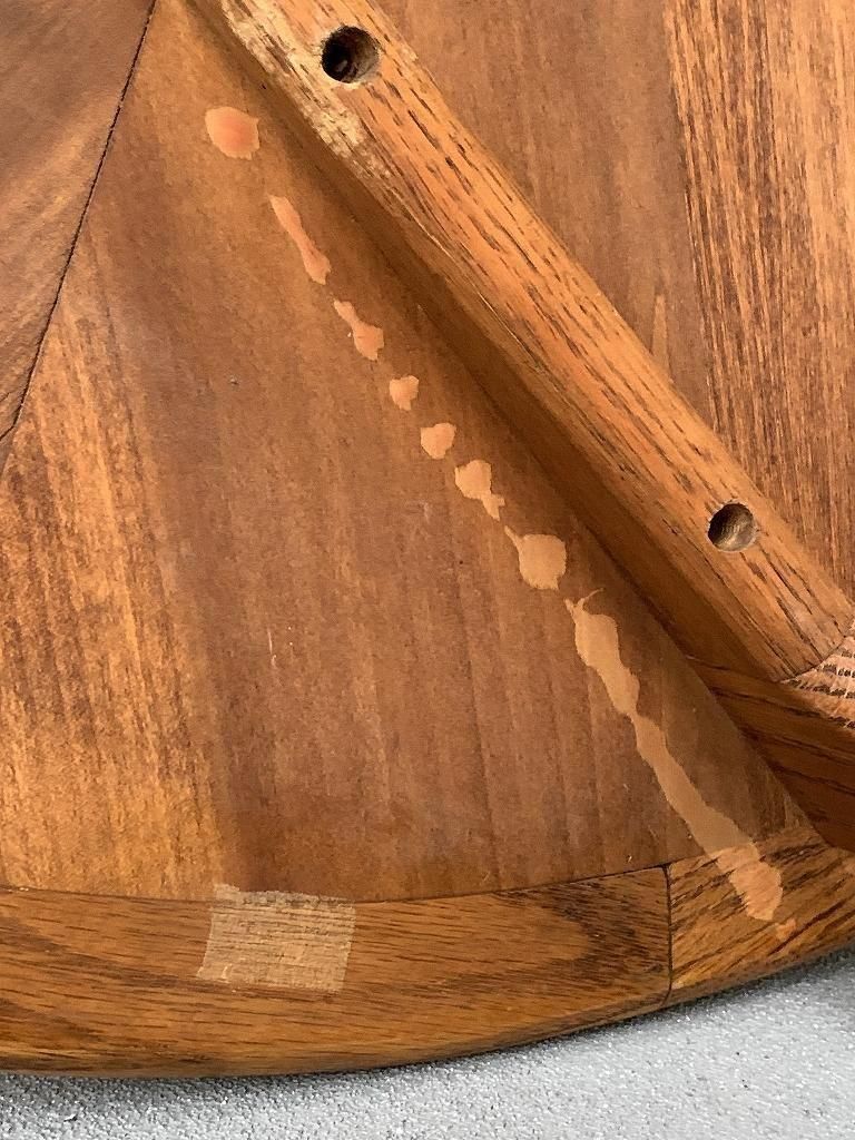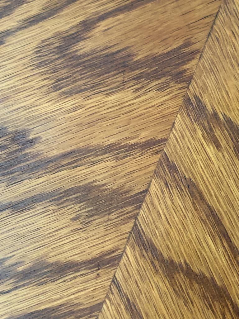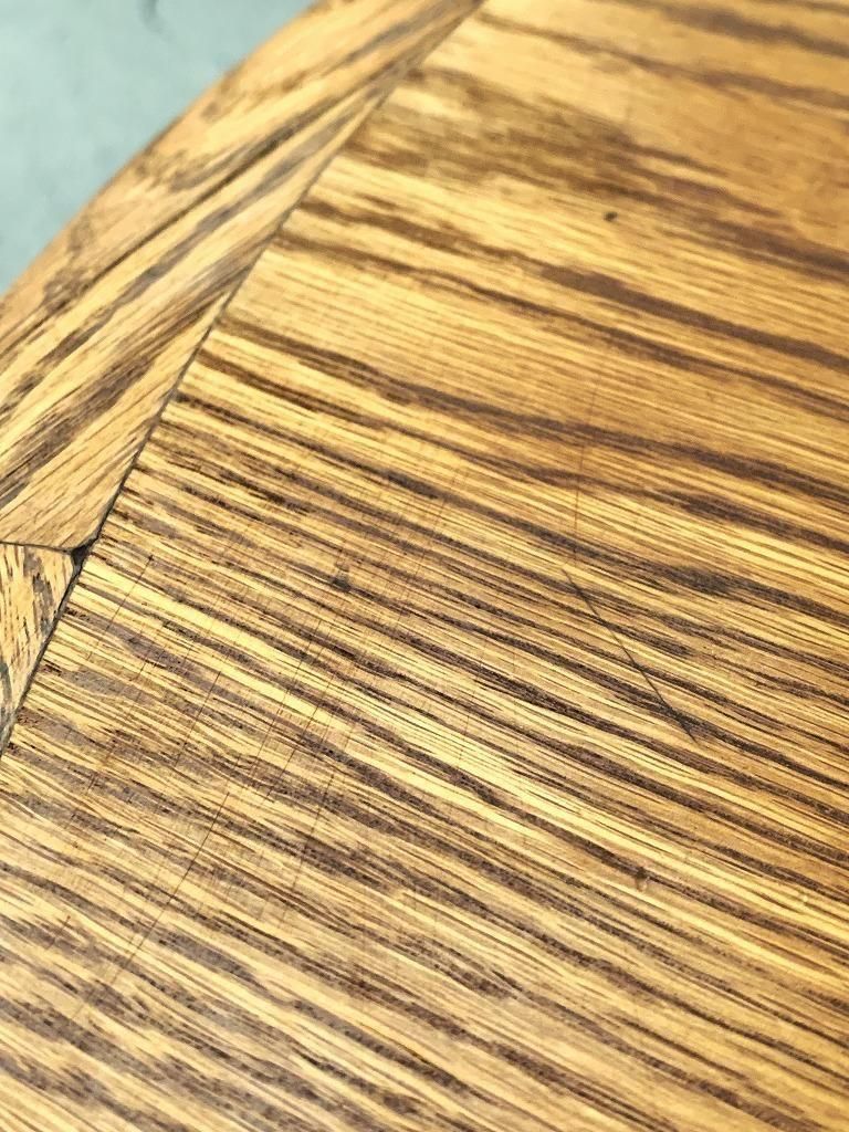 天板にはLANE社の特徴のオークを使用し、中央から虎斑模様が放射状に伸びる圧巻の杢目。虎斑の杢目は、オークの中でも特に美しく見る角度によって表情が変化します。