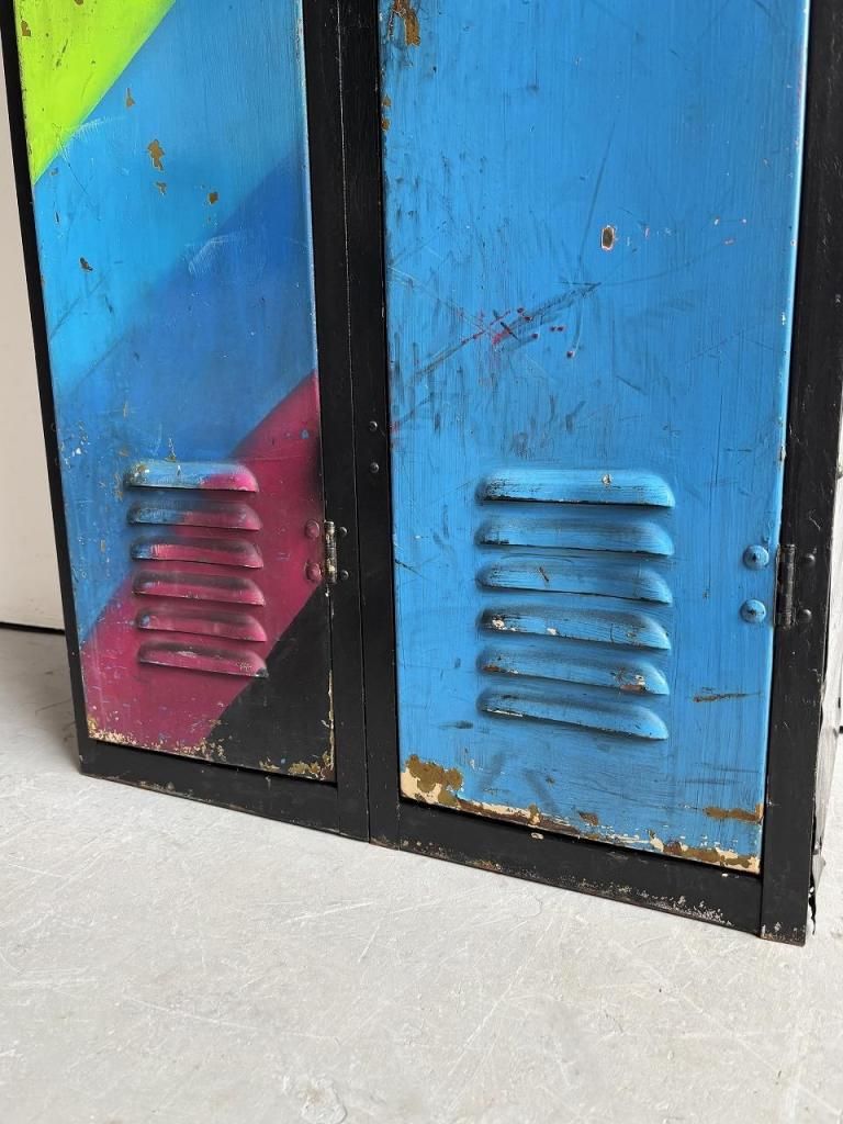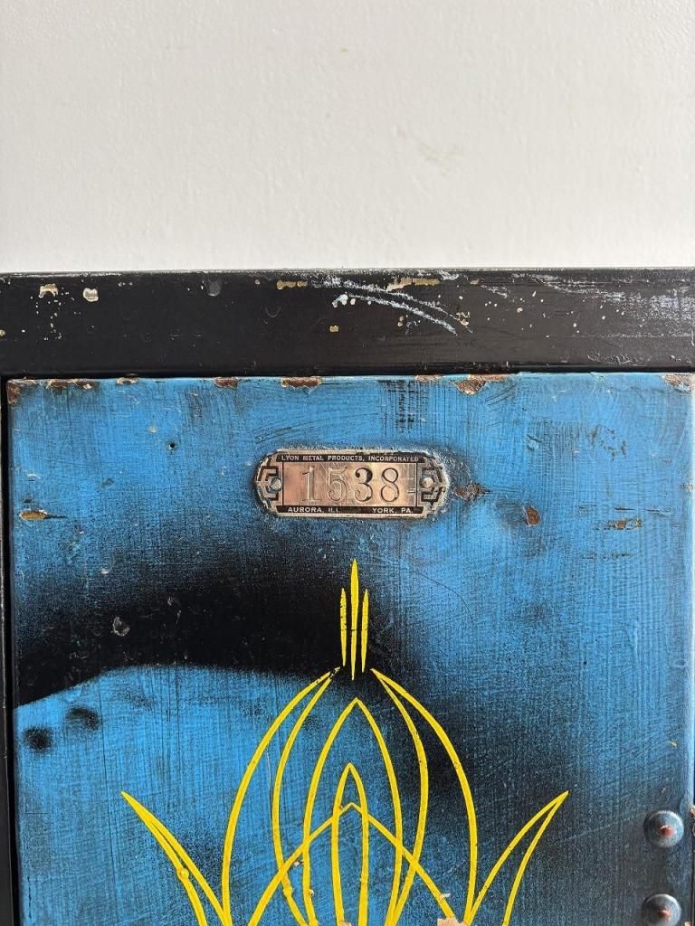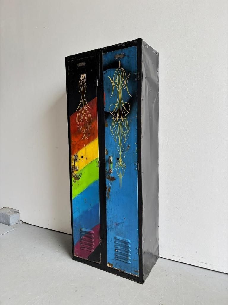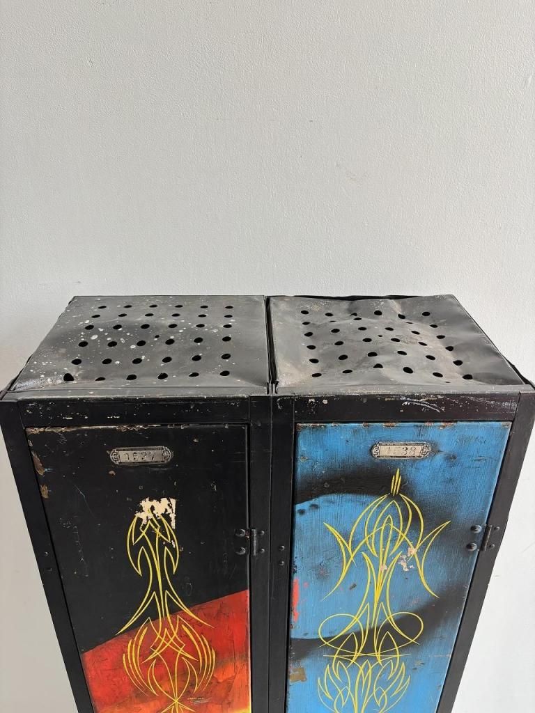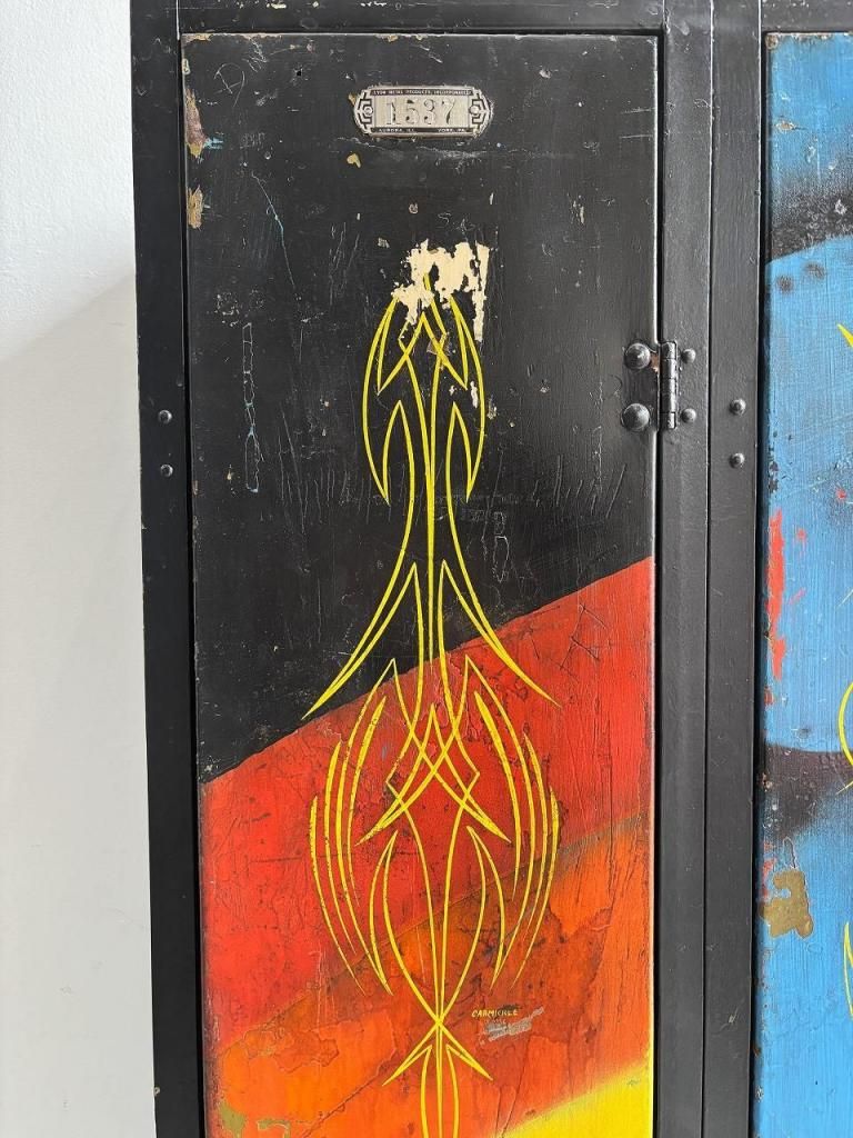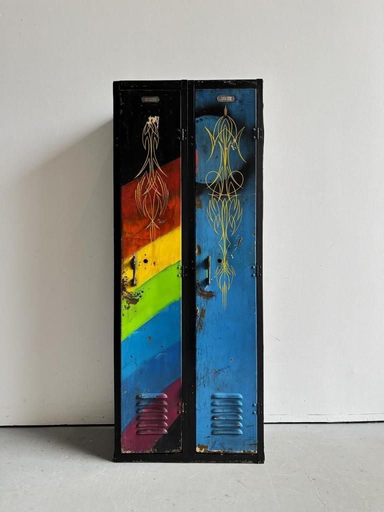左扉には赤から青へと続くレインボーのグラデーション、右扉にはブルー基調のスモークペイントが入り、さらにハンドペイントのピンストライプアートが大胆に描かれています。アメリカのカスタムカルチャーやホットロッド文化を思わせる仕様で、ヴィンテージロッカーとしては非常に珍しい一点物の表情を持っています。