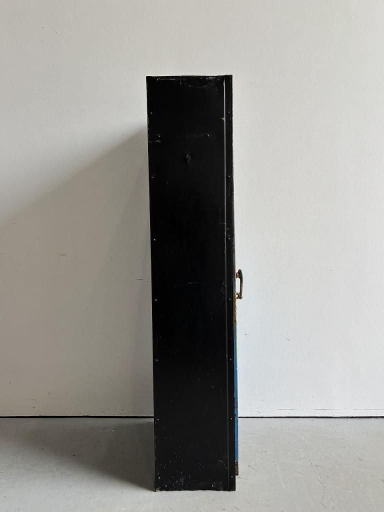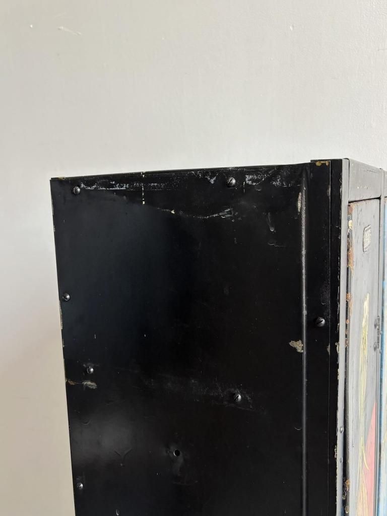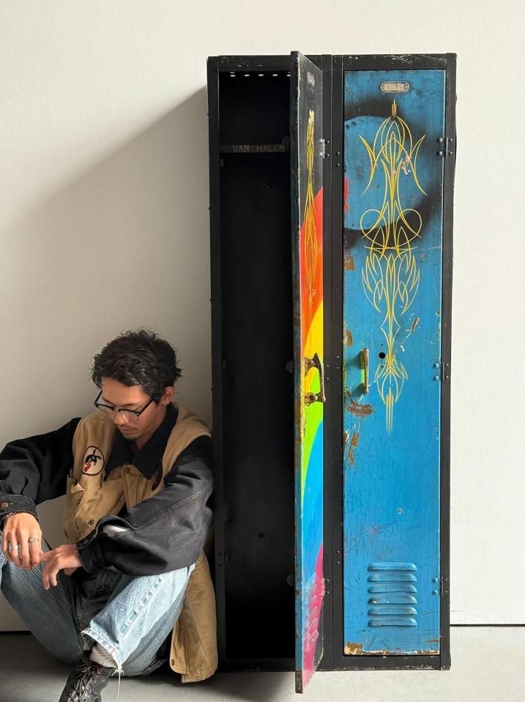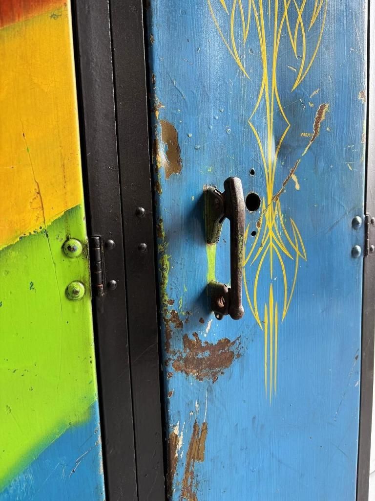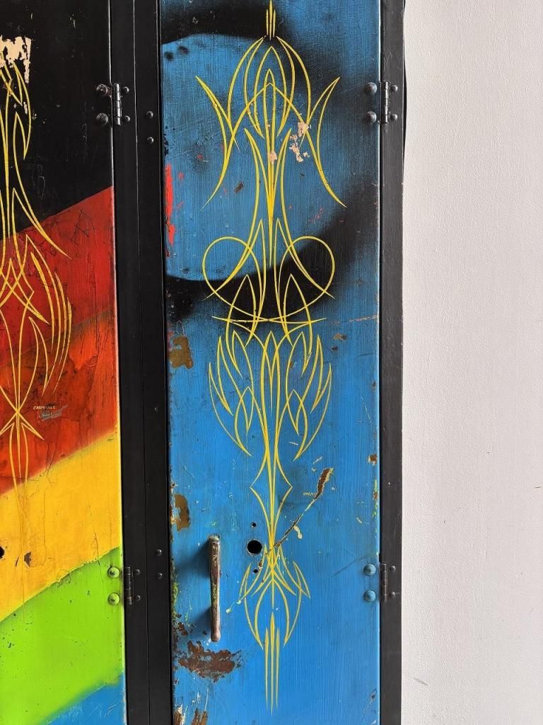 左扉には赤から青へと続くレインボーのグラデーション、右扉にはブルー基調のスモークペイントが入り、さらにハンドペイントのピンストライプアートが大胆に描かれています。アメリカのカスタムカルチャーやホットロッド文化を思わせる仕様で、ヴィンテージロッカーとしては非常に珍しい一点物の表情を持っています。