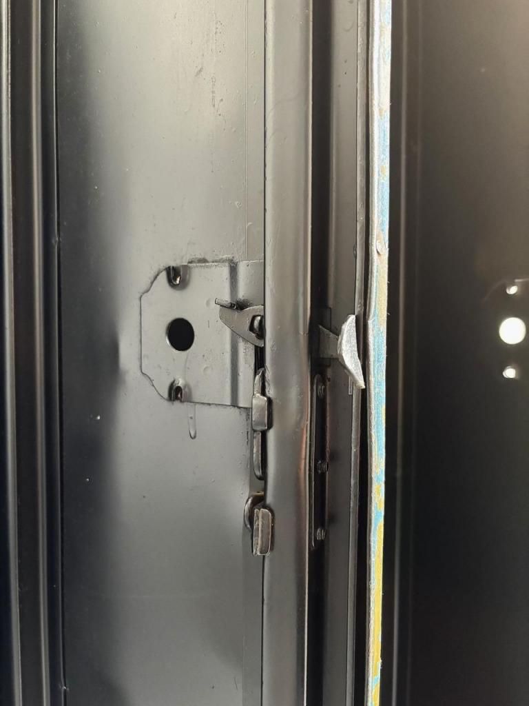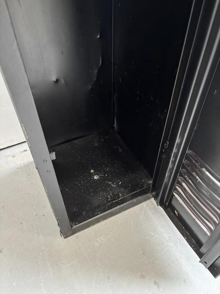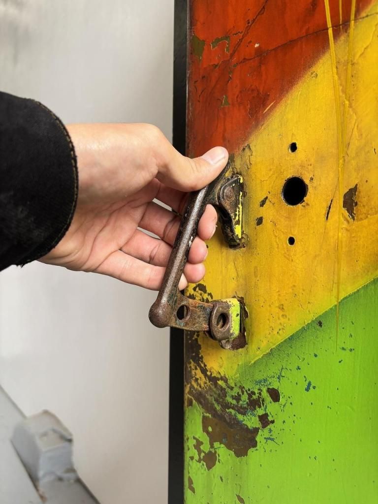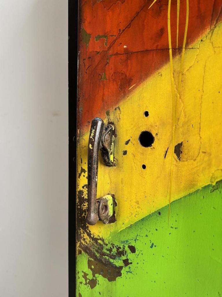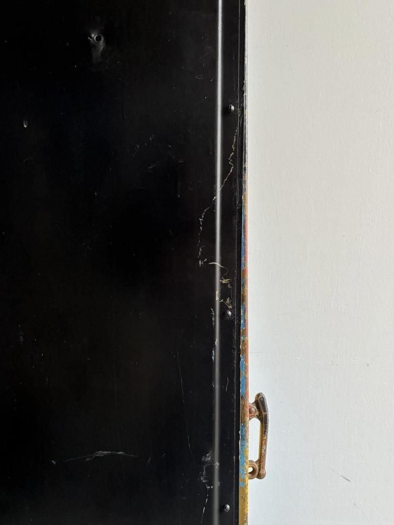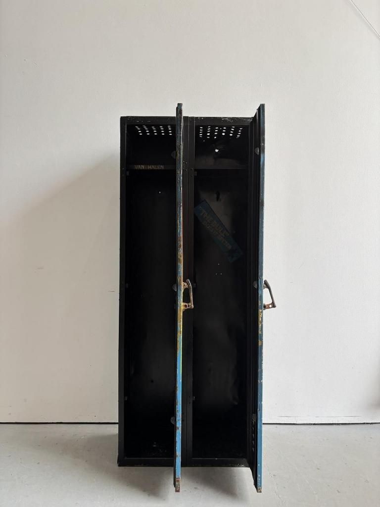 左扉には赤から青へと続くレインボーのグラデーション、右扉にはブルー基調のスモークペイントが入り、さらにハンドペイントのピンストライプアートが大胆に描かれています。アメリカのカスタムカルチャーやホットロッド文化を思わせる仕様で、ヴィンテージロッカーとしては非常に珍しい一点物の表情を持っています。
