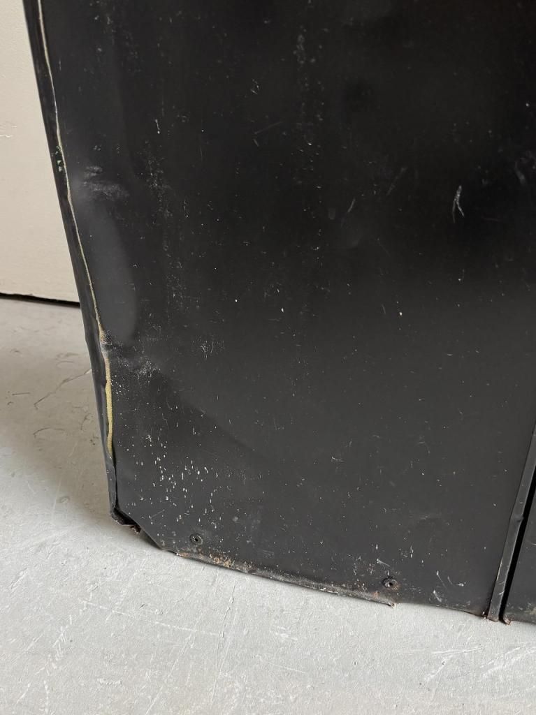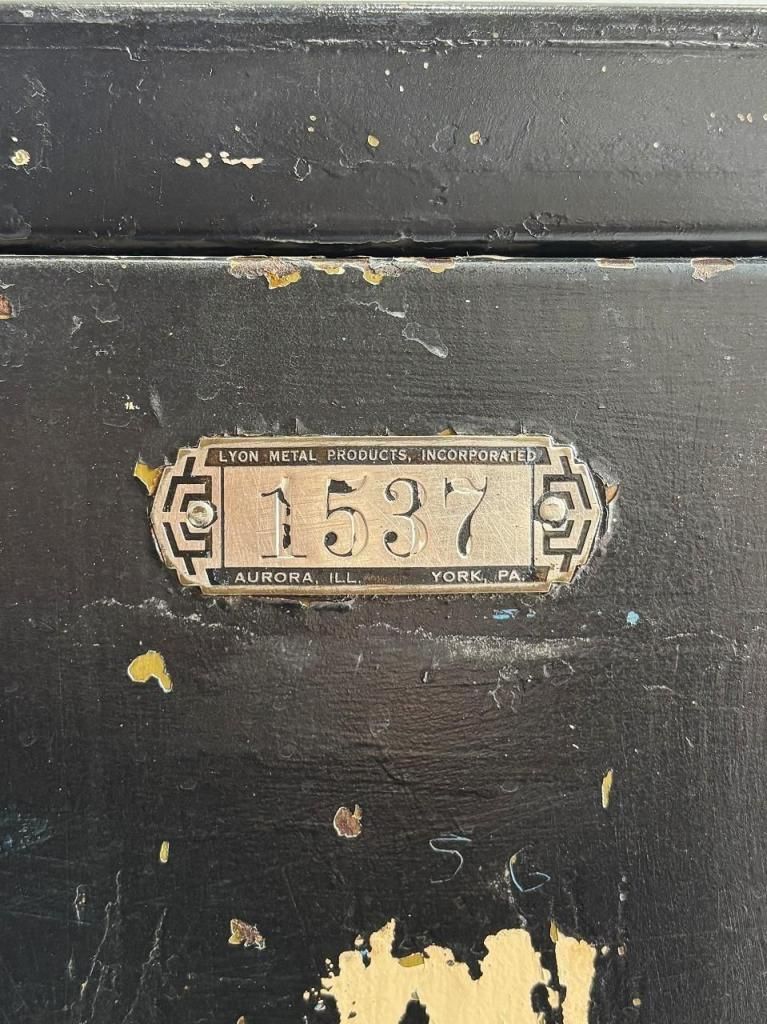 LYONらしい重厚なスチール製で、上部に大きく開けられた丸穴や、扉下部のルーバー通気孔など、当時のスポーツロッカー/ワークロッカー特有の構造がしっかり残っています。経年によるゆがみや塗装の荒れも、工業製品として使われてきた長い時間を感じさせる味わいです。
