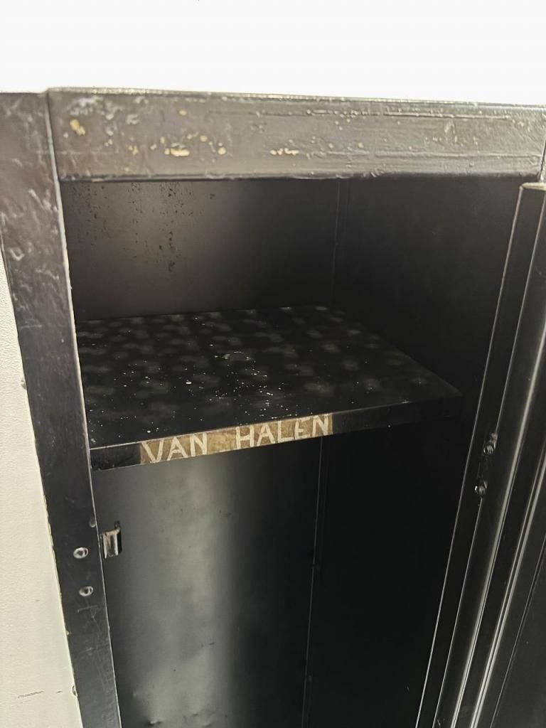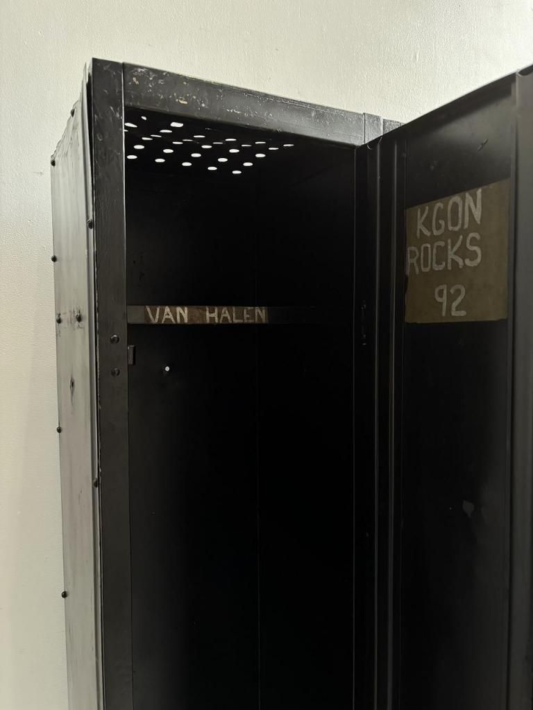 内部には “VAN HALEN” の手書き文字、“KGON ROCKS 92”(オレゴン州のロックラジオ局 KGON からのものと思われる)など、当時の使用者の痕跡がそのまま残されており、アメリカのロック/ガレージカルチャーの空気感を感じ取ることができます。