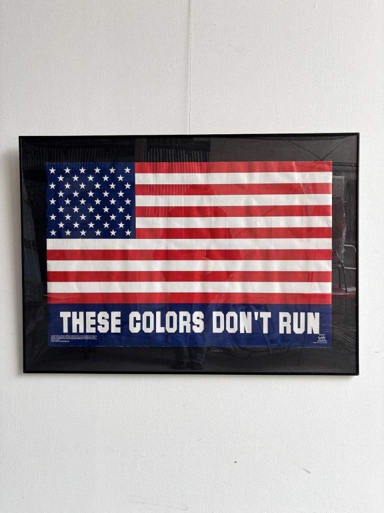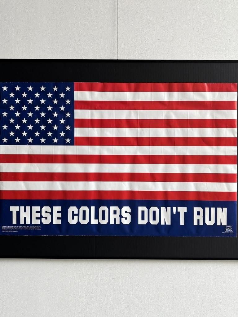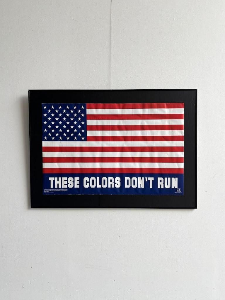 星条旗の下には大きく 「THESE COLORS DON’T RUN」 (この色は逃げない)と力強いメッセージが記されておりこのフレーズはアメリカで広く使われるスローガンで当時のアメリカで愛国心を象徴するフレーズとして広く浸透しました。