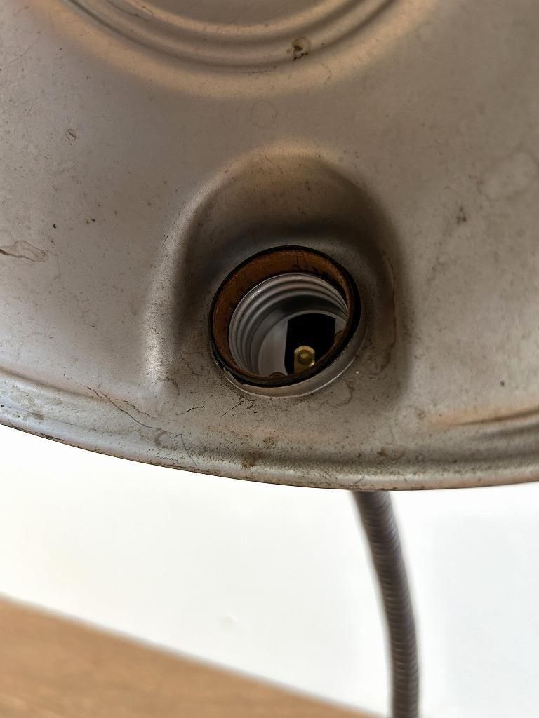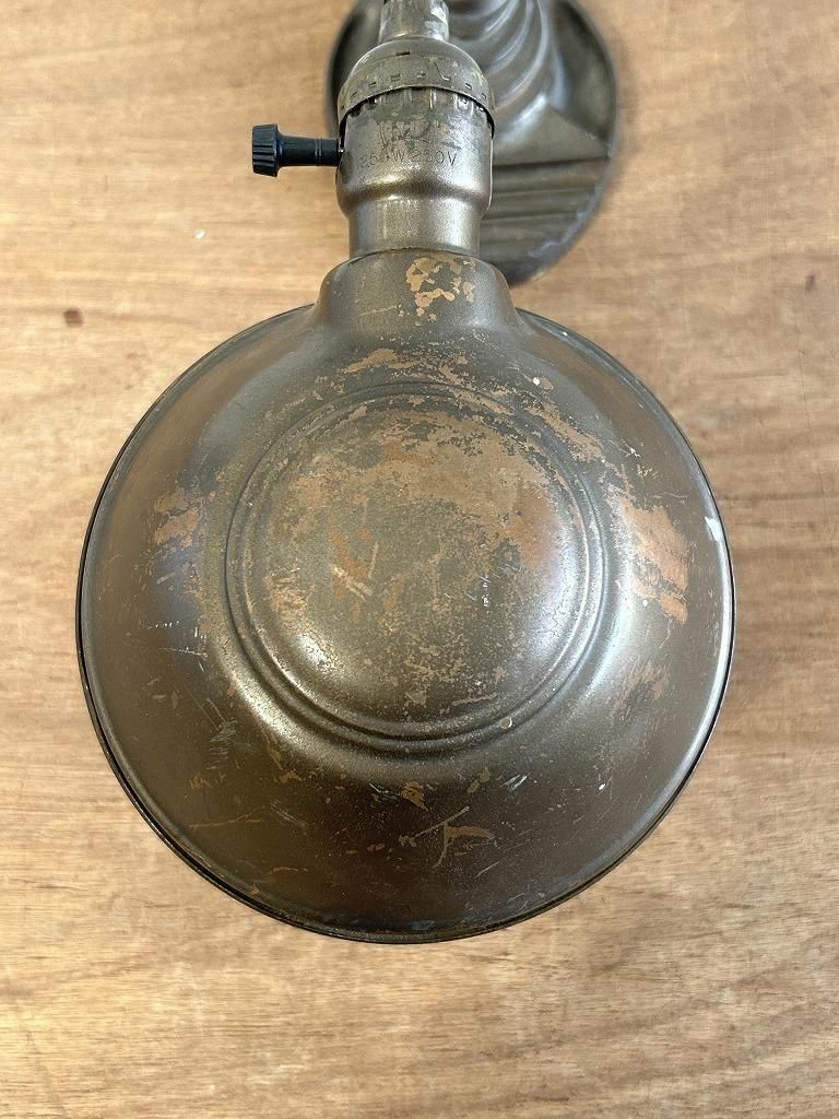 ドーム型メタルシェードで、光を狭い範囲に集中させる構造。経年の剥がれやメタルの鈍い光沢からインダストリーな雰囲気がただとっています。