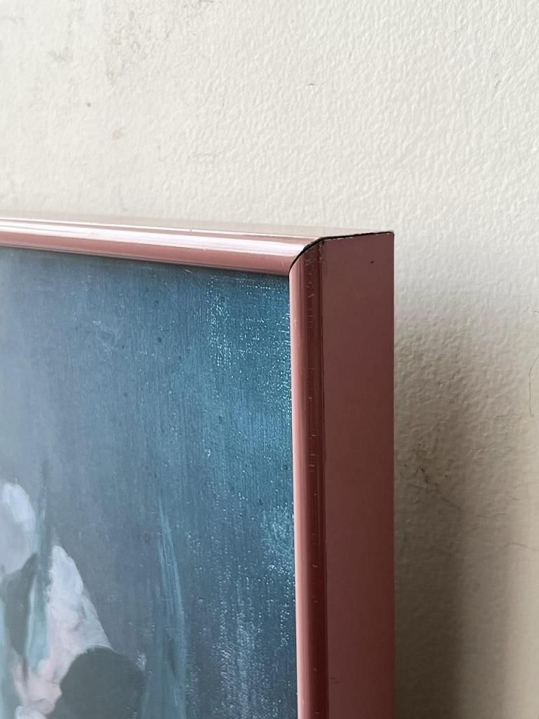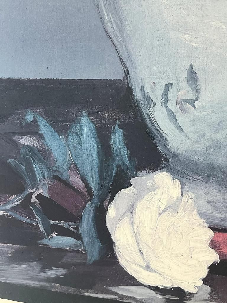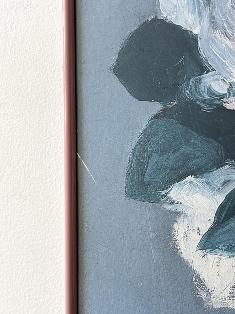 深いブルートーンを基調とした花瓶の静物画は、柔らかいタッチと陰影のコントラストがとても美しく、空間に落ち着いた気配をつくってくれる一枚です。70–80年代らしい、程よくマットな印刷質感も魅力で、現行ポスターには出せないトーンの深さがあります。