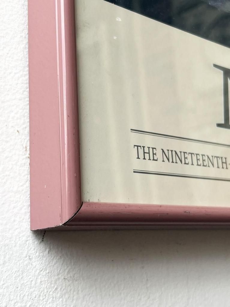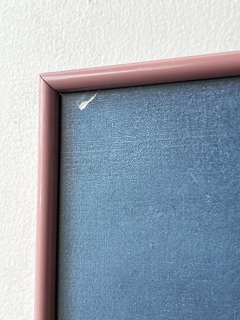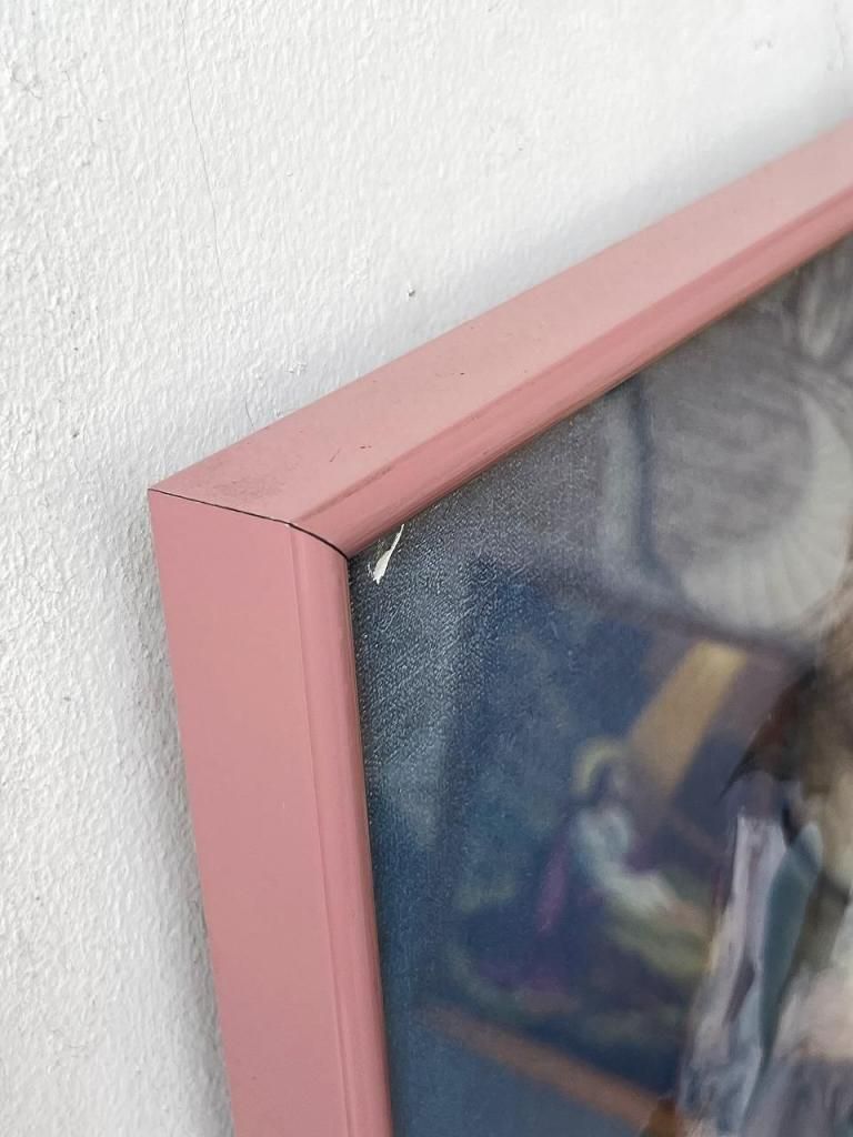 フレームはくすんだピンクに塗装されたメタルフレーム。直線的なフレームが、クラシックな絵柄をモダンに中和してくれるため、ヴィンテージ家具だけでなく、和室・モルタル空間・現代的なインテリアにも自然に調和します。