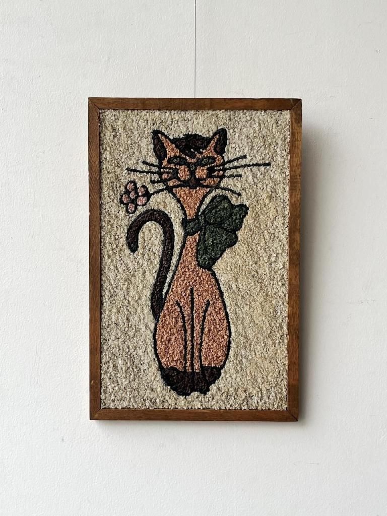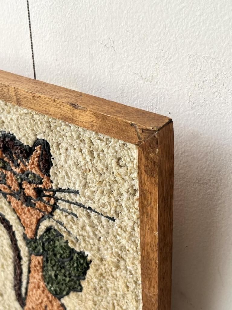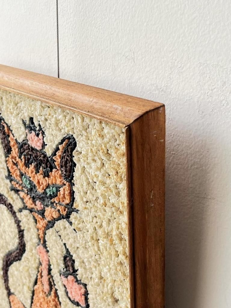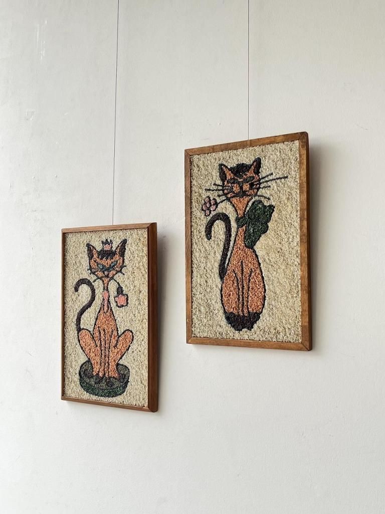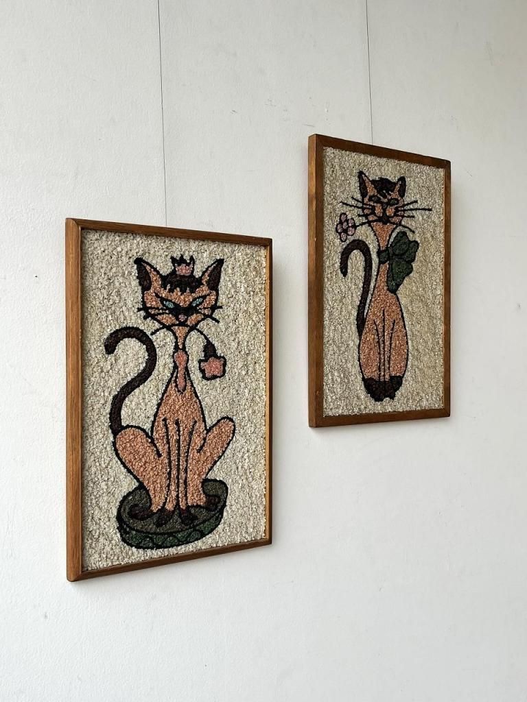 2枚並べて飾ることで世界観がより際立ち、リビングや玄関、子ども部屋、ショップディスプレイにも好相性です。ミッドセンチュリー期アメリカのクラフトアートの魅力を素直に楽しめる、希少なヴィンテージセットです。
