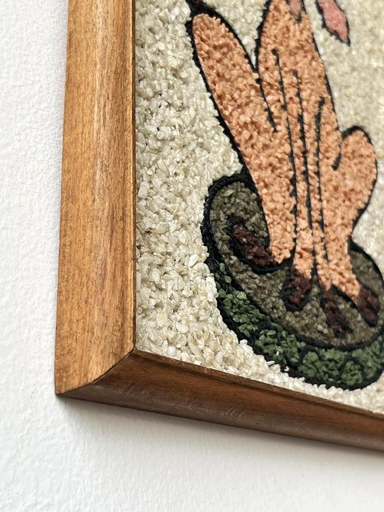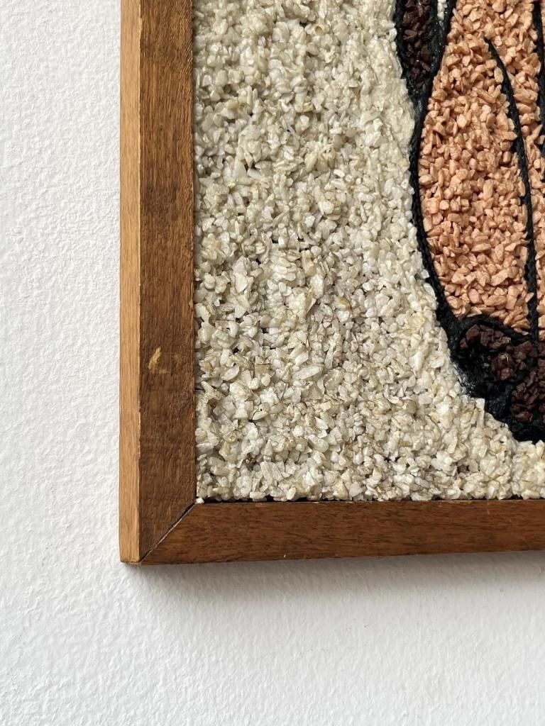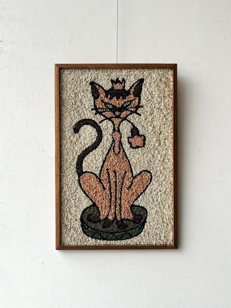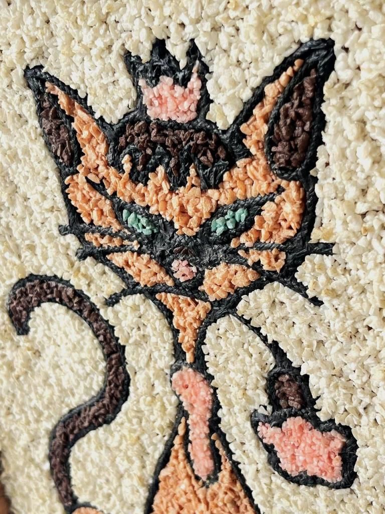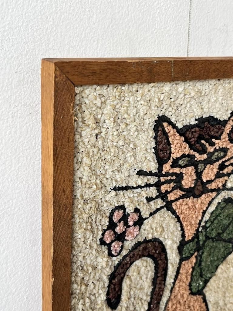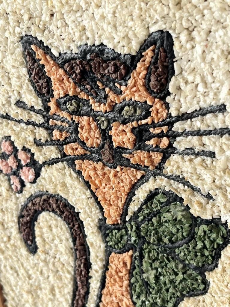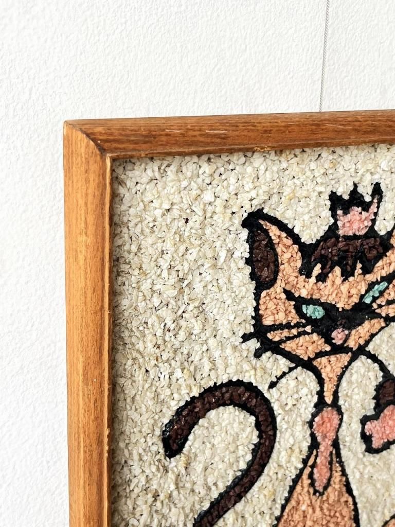 細かな砂よりもやや大きい着色チップ(砕石素材)を樹脂で敷き詰める技法で、立体的で温かみのある質感が特徴です。アメリカではGravel Art(グラベルアート)という名前で確立しており、当時のミッドセンチュリーインテリアに多く見られたものになります。